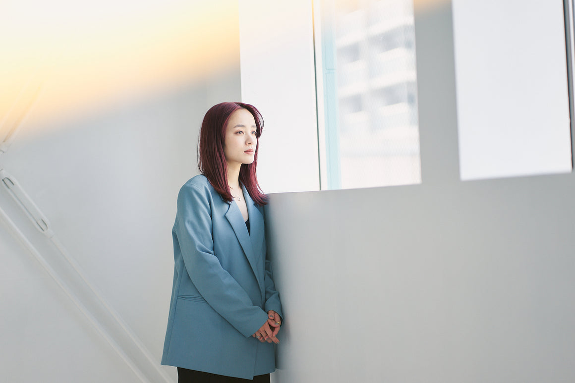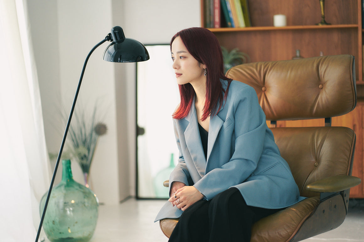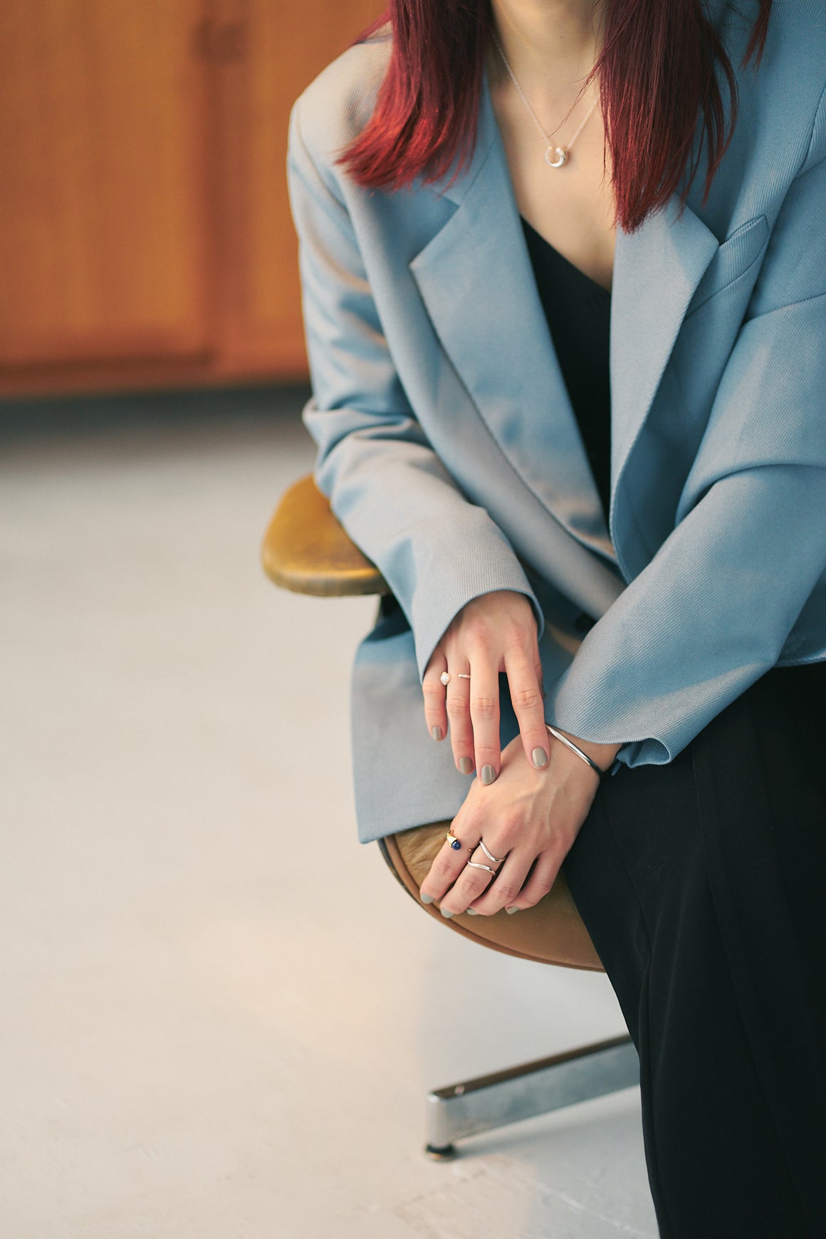 全部大きすぎないようにするとか、そういうことは意識しています。今日はジャケットがいいなと思って。ボルドーのセットアップと迷いましたが、ブルーのジャケットに。シルバーのアクセサリーと髪の赤色、ジャケットで色合いにコントラストをつけました。実は20代前半はほぼ黒色の服しか着ませんでした。髪色も真っ黒。前髪はぱっつんに切り揃えたロングヘアだったんです。20代は保守的で、自分のイメージを自分で固めてしまっていて。そこから逸れたらどうなるのか、不安みたいなものがあったんです。でも黒ばかりだとつまらないなと年齢を重ねるごとに思い始めて。30代になって今の髪の赤色などにも挑戦したいと思うようになりました。