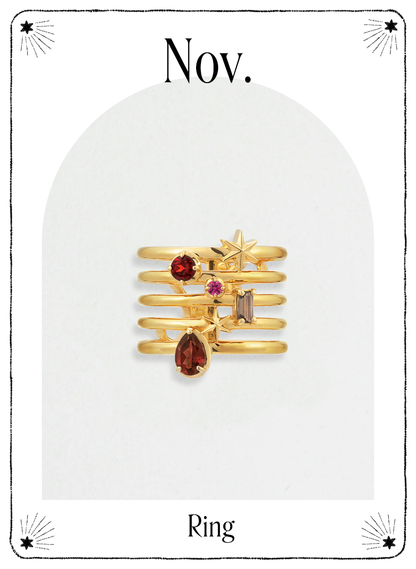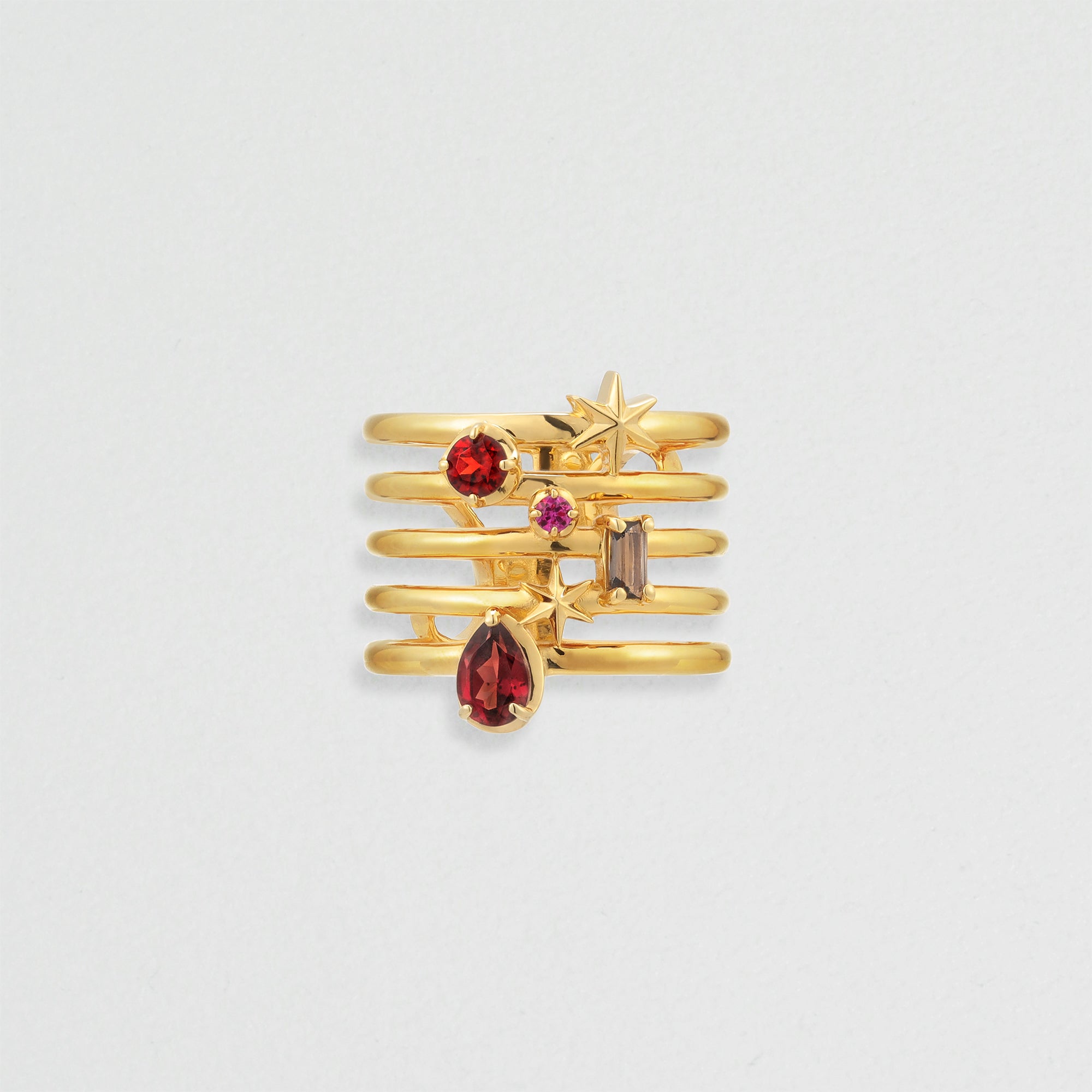 ガーネット、シンセティックルビー、スモーキークォーツ──煌めく色の瞬きが、冬の空に温もりのハーモニーを奏でながら、宇宙の五線譜の上で軽やかに踊り出す。