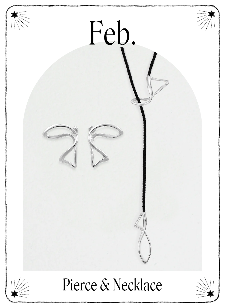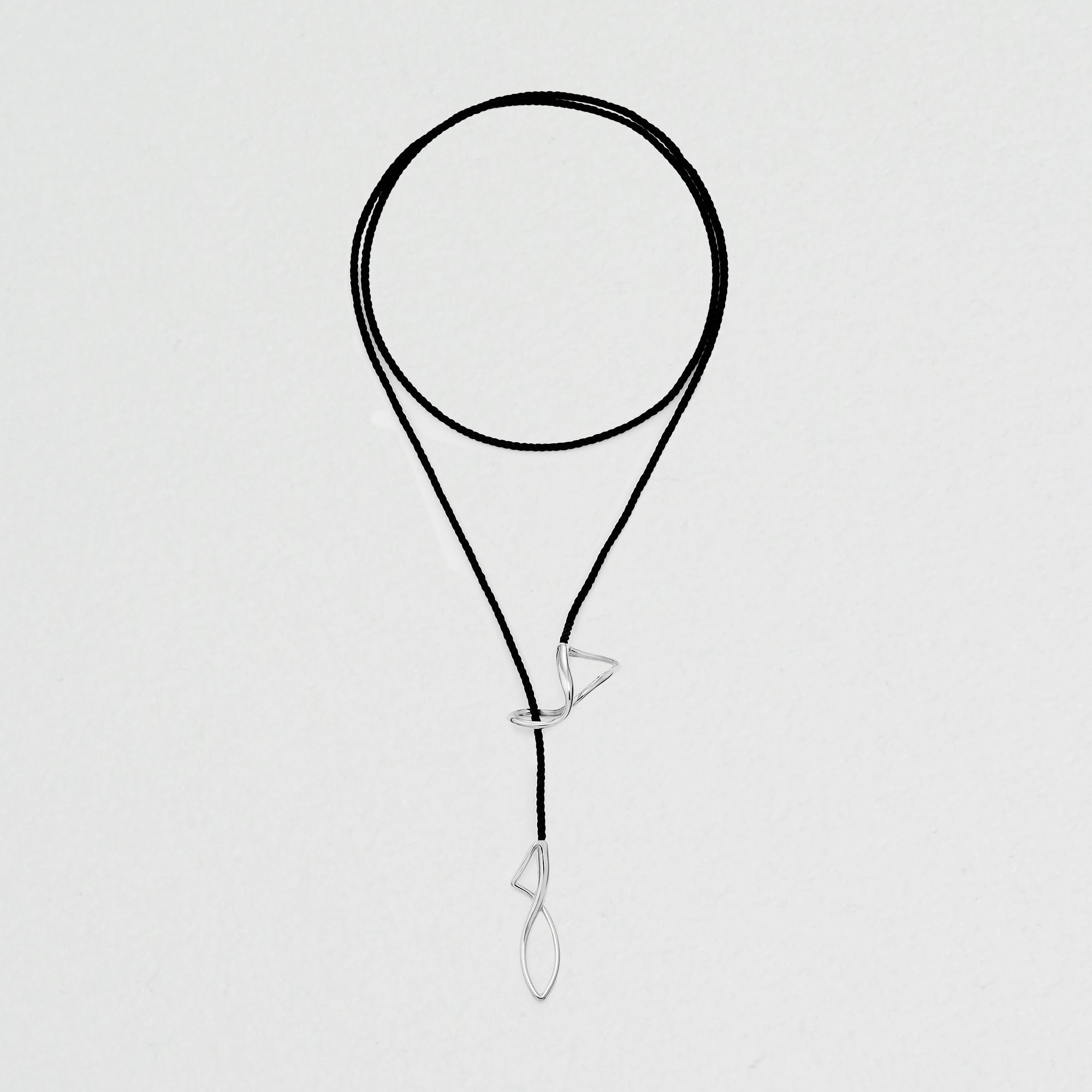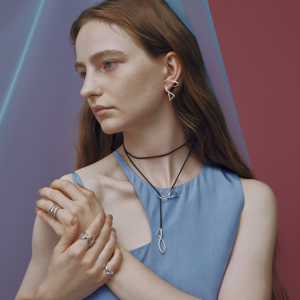 自由に泳ぐ二匹の魚をイメージした、リラクシングムードあふれるコードネックレスとモダンな地金のピアス。