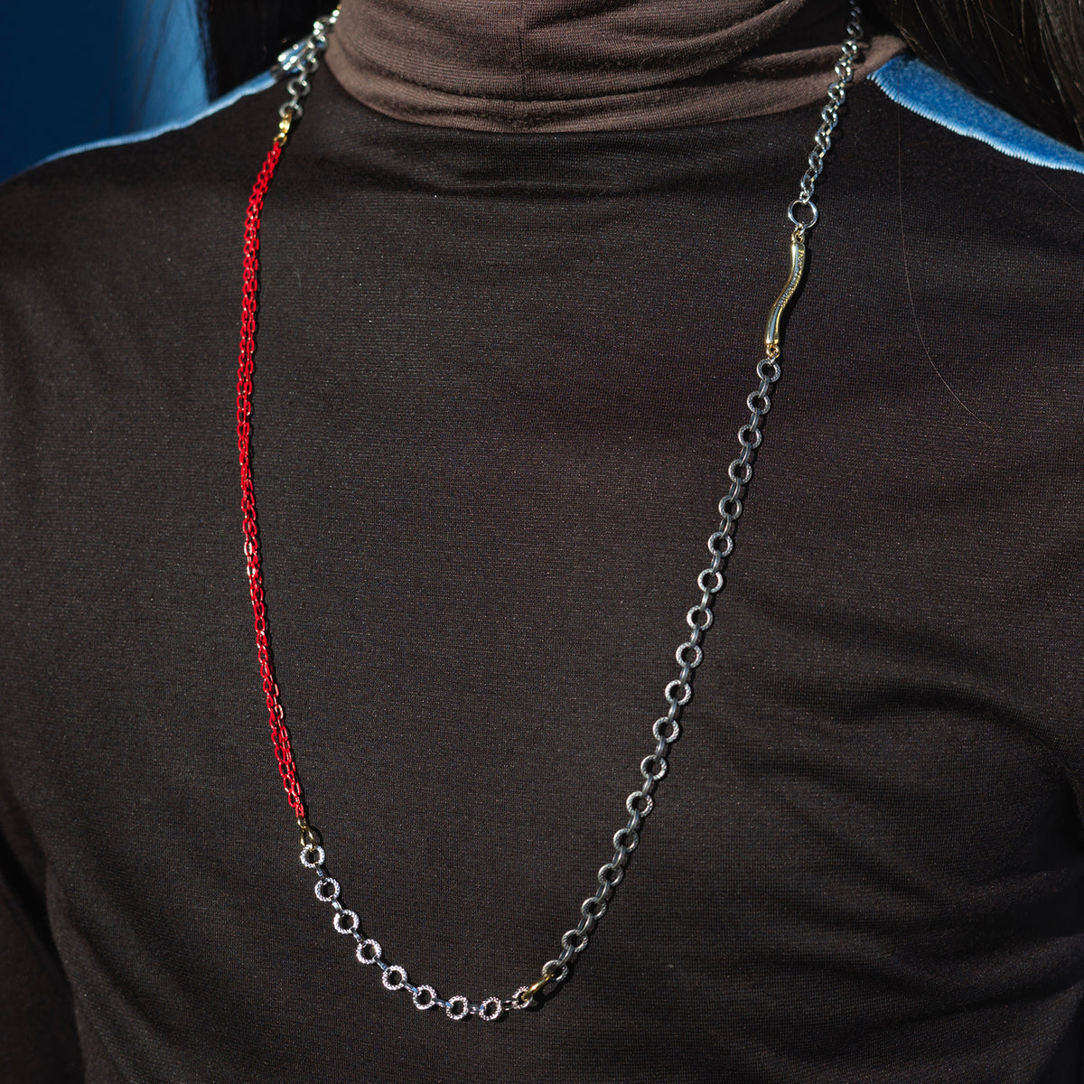 メーカーに眠る、量産時に生まれた様々な種類の真鍮の端切れチェーン。そんなLEMONADEチェーンをパッチワークのように繋ぎ合わせ、ユニセックスなチェーンアイテムに仕立てました。LEMONADEチャームと組み合わせてもバランスを取れるように組み上げられたロングネックレスは、60cmネックレスとブレスレットとしても着用できるマルチウェイ仕様。その日の気分で様々なスタイリングを楽しめます。スマートなシルエットながら、真紅色のチェーンが印象的な存在感を放ちます。