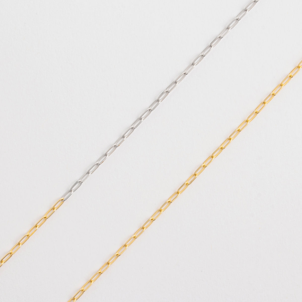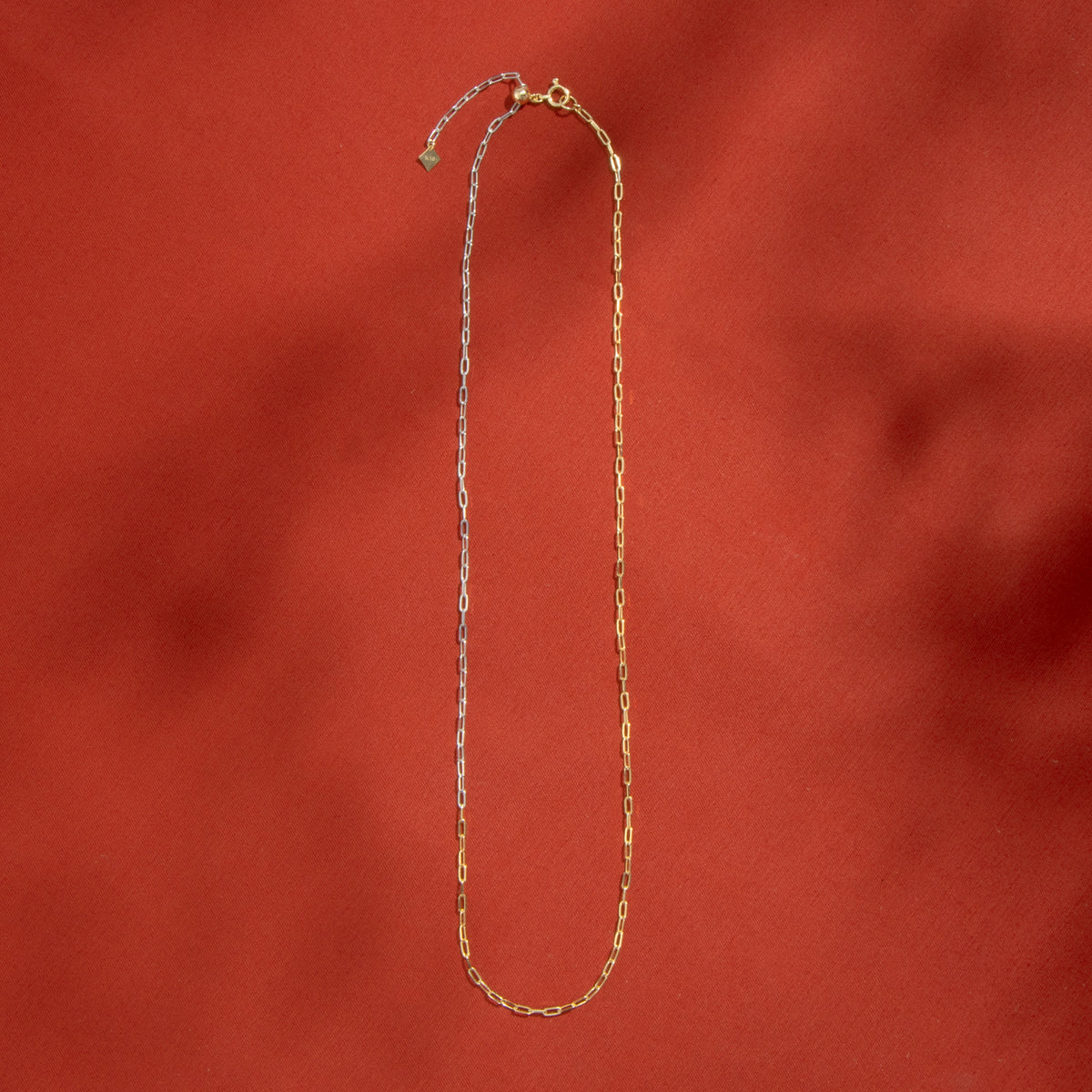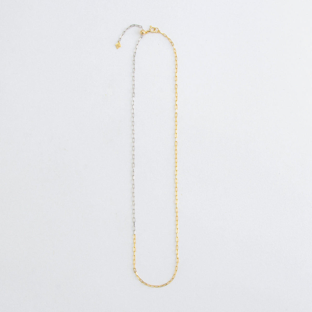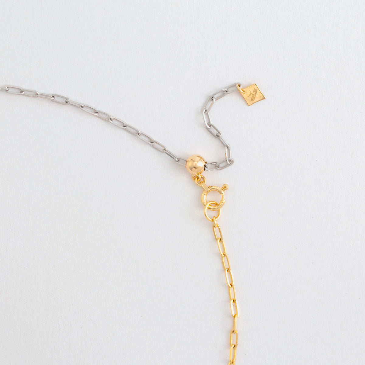 程よいボリューム感でシンプルながら存在感を放つコンビカラーのチェーンネックレス。美しくカットを施されたチェーンコマの一つ一つが動くたびに煌めきます。スライドアジャスターでお好きな長さに調節でき、チェーンチョーカーとしてもスタイリングできます。別売りのチャームとのコーディネートもおすすめです。