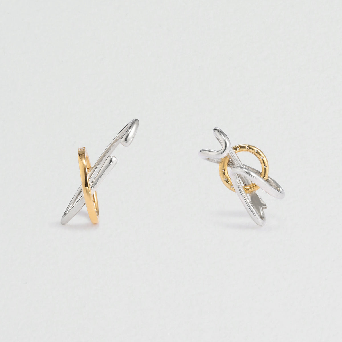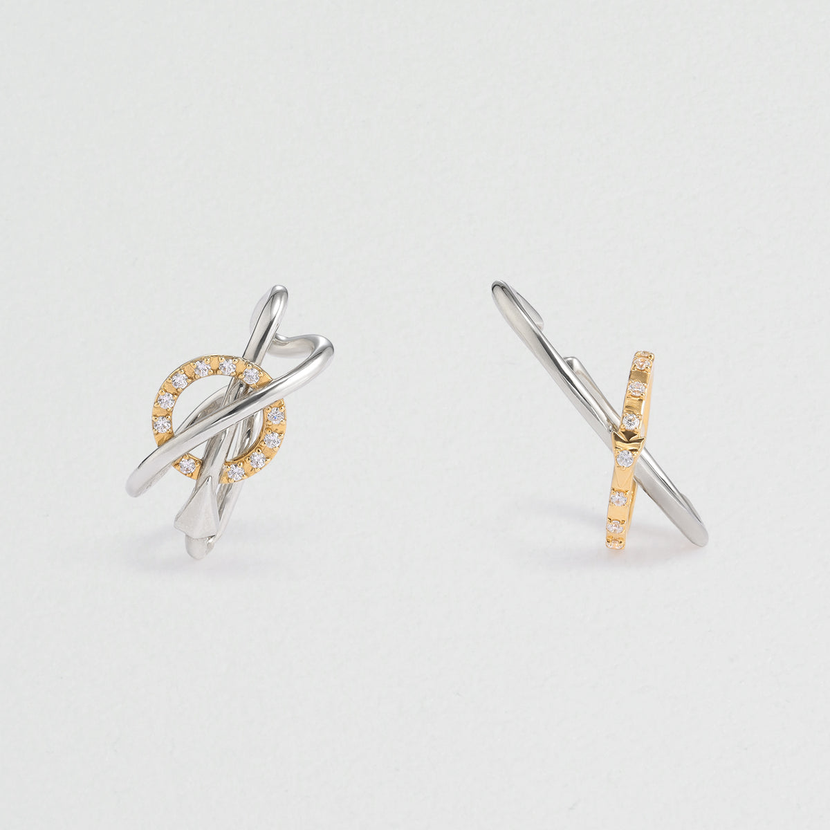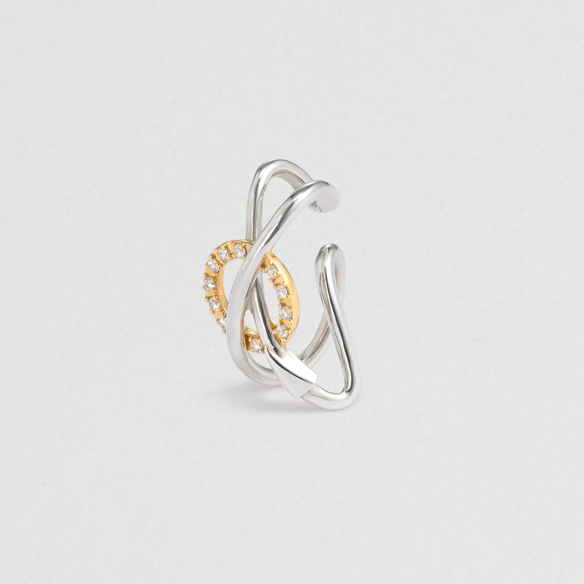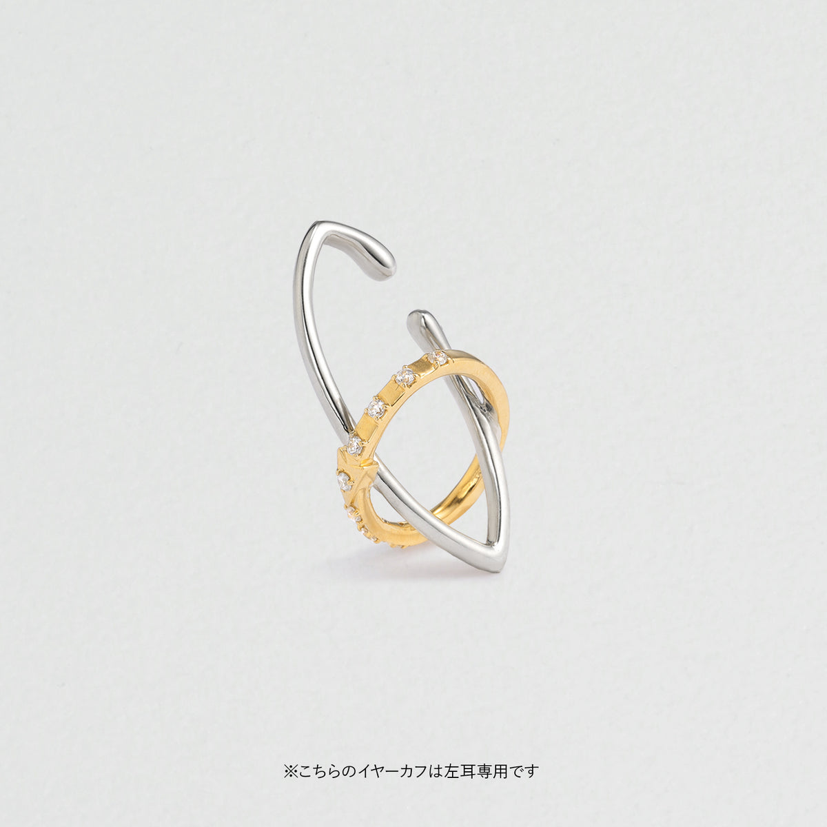 火星の惑星記号からインスパイアされた、アシンメトリースタイリングが完成する、モダンなイヤーカフセット。軍神アレースの盾と槍からインスパイアされた立体的な造形美が、耳元で洗練されたムードを放ちます。顔周りが一気に華やぐキュービックジルコニアのきらめきと、お手持ちのジュエリーともあわせやすい、さりげないコンビカラーもポイントです。