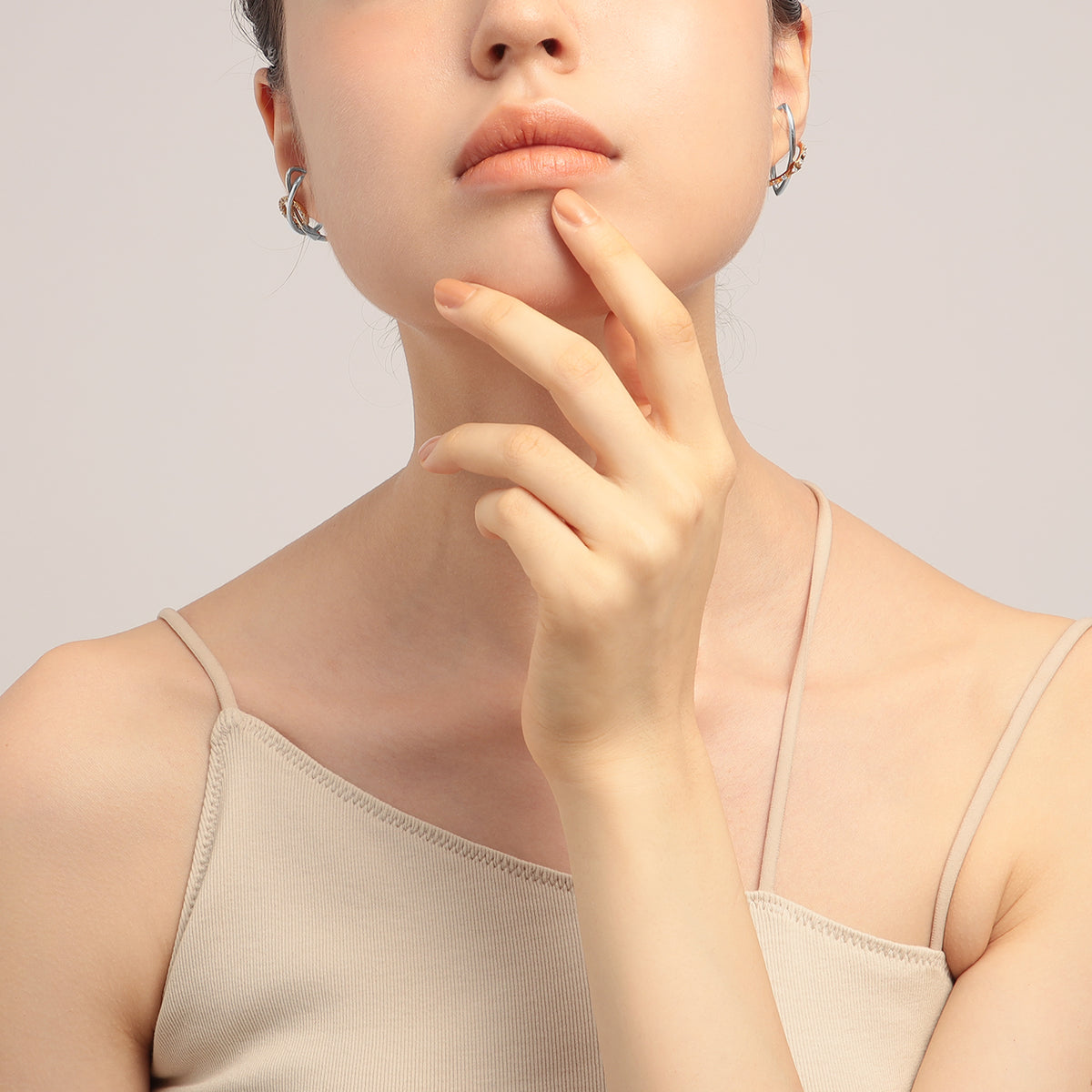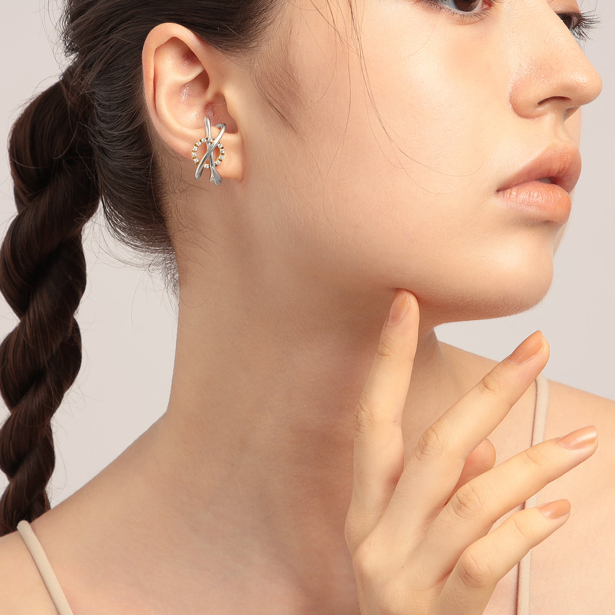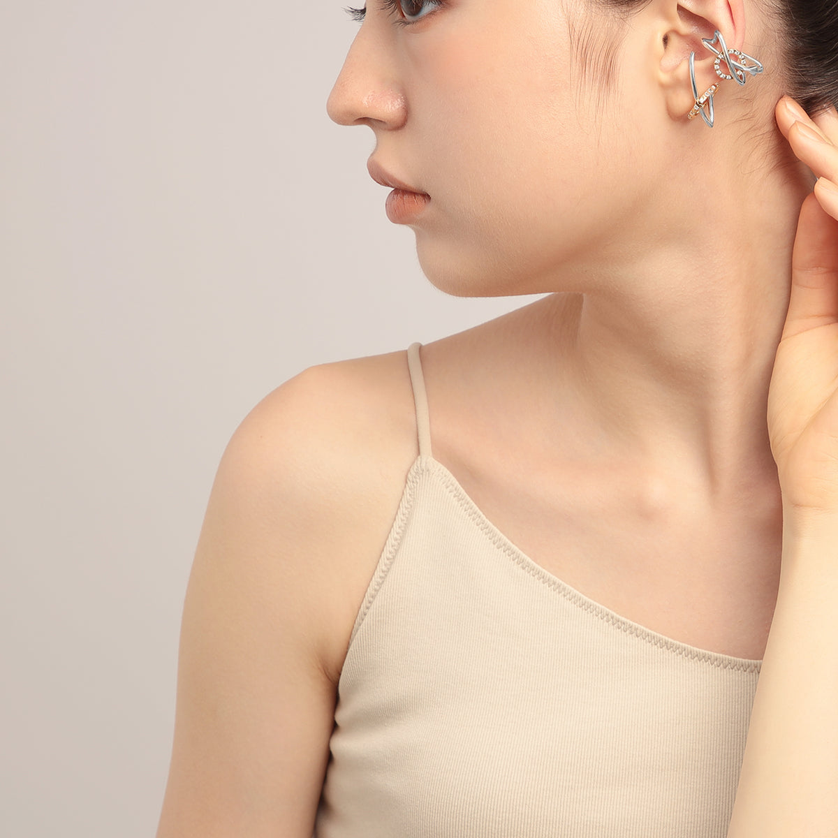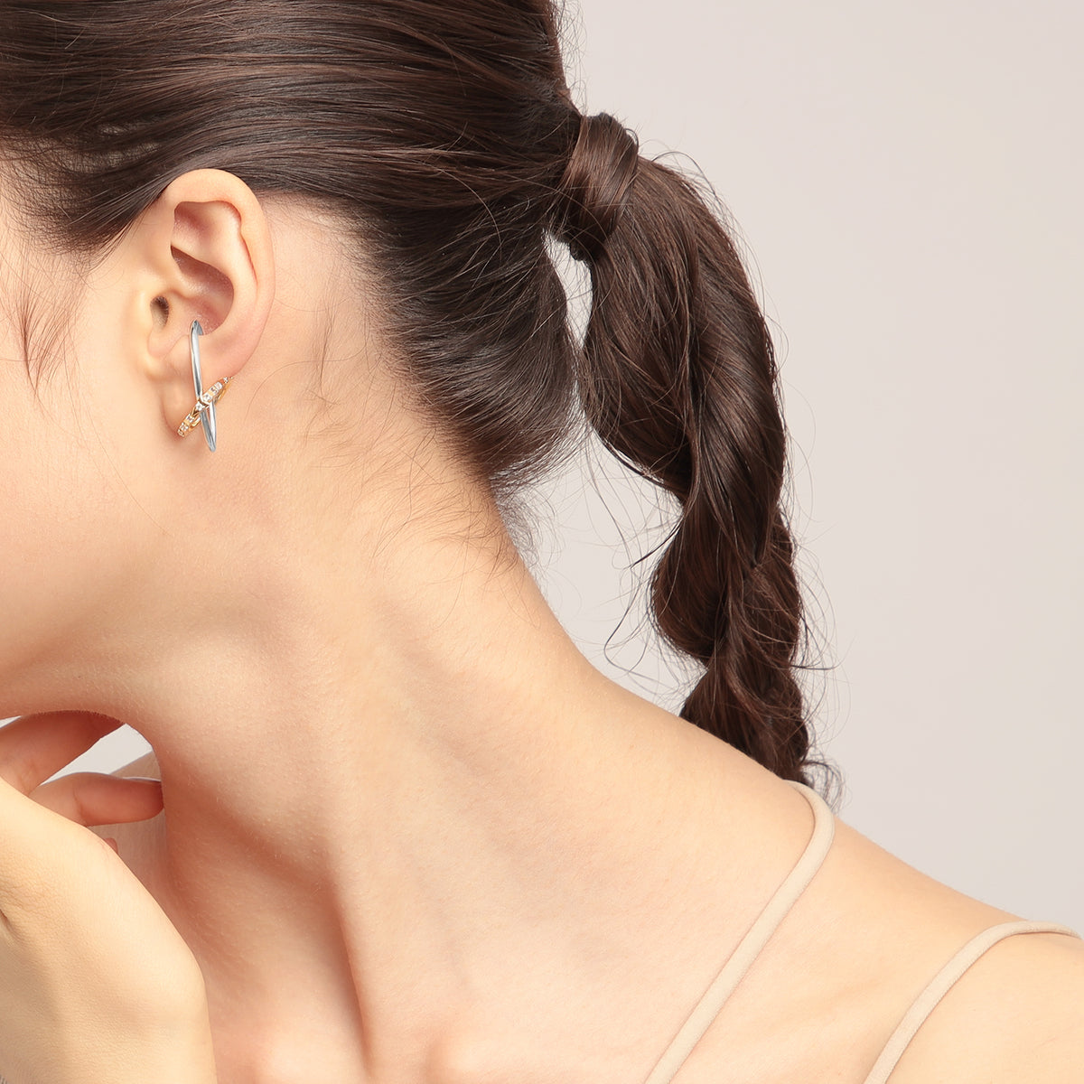 火星の惑星記号からインスパイアされた、アシンメトリースタイリングが完成する、モダンなイヤーカフセット。軍神アレースの盾と槍からインスパイアされた立体的な造形美が、耳元で洗練されたムードを放ちます。顔周りが一気に華やぐキュービックジルコニアのきらめきと、お手持ちのジュエリーともあわせやすい、さりげないコンビカラーもポイントです。