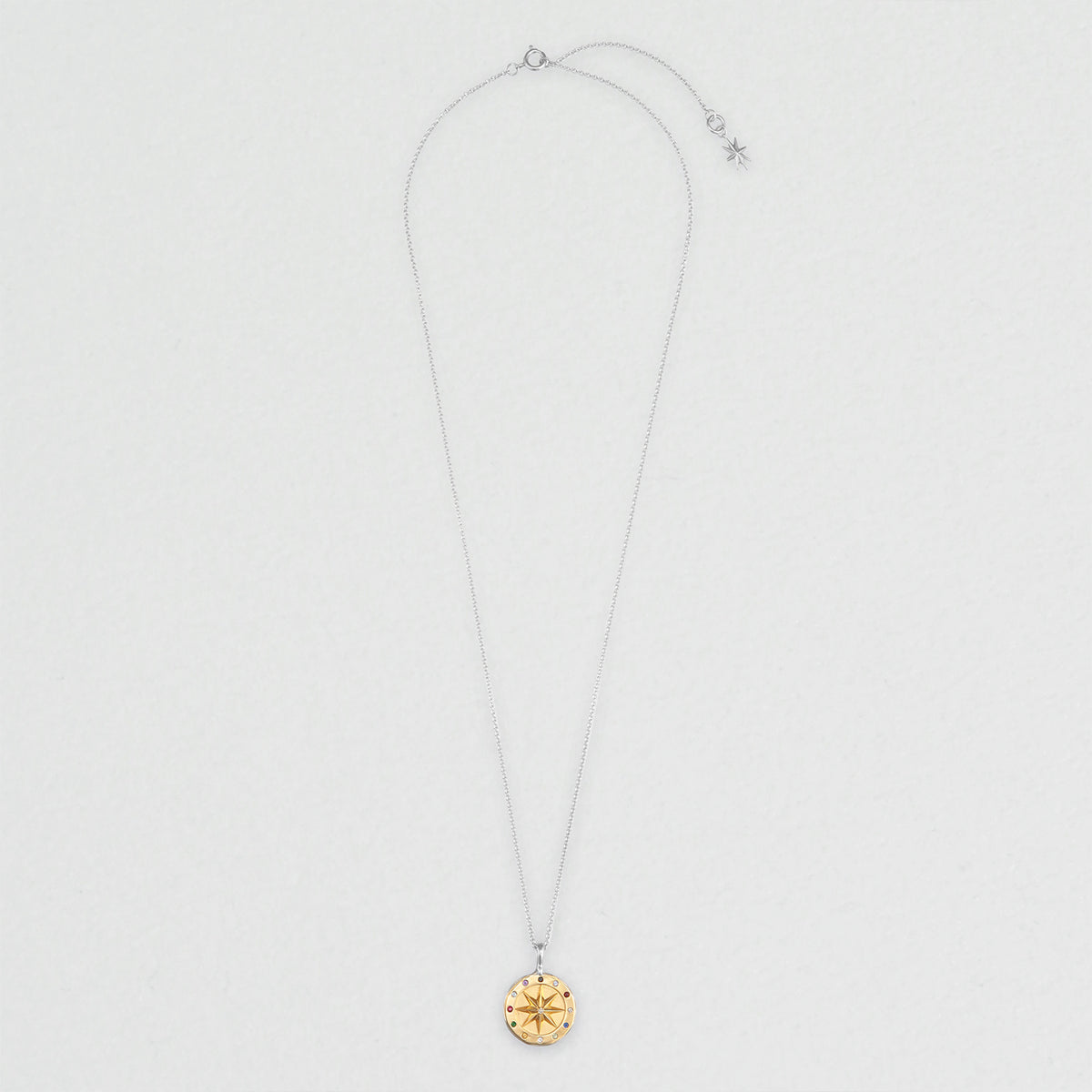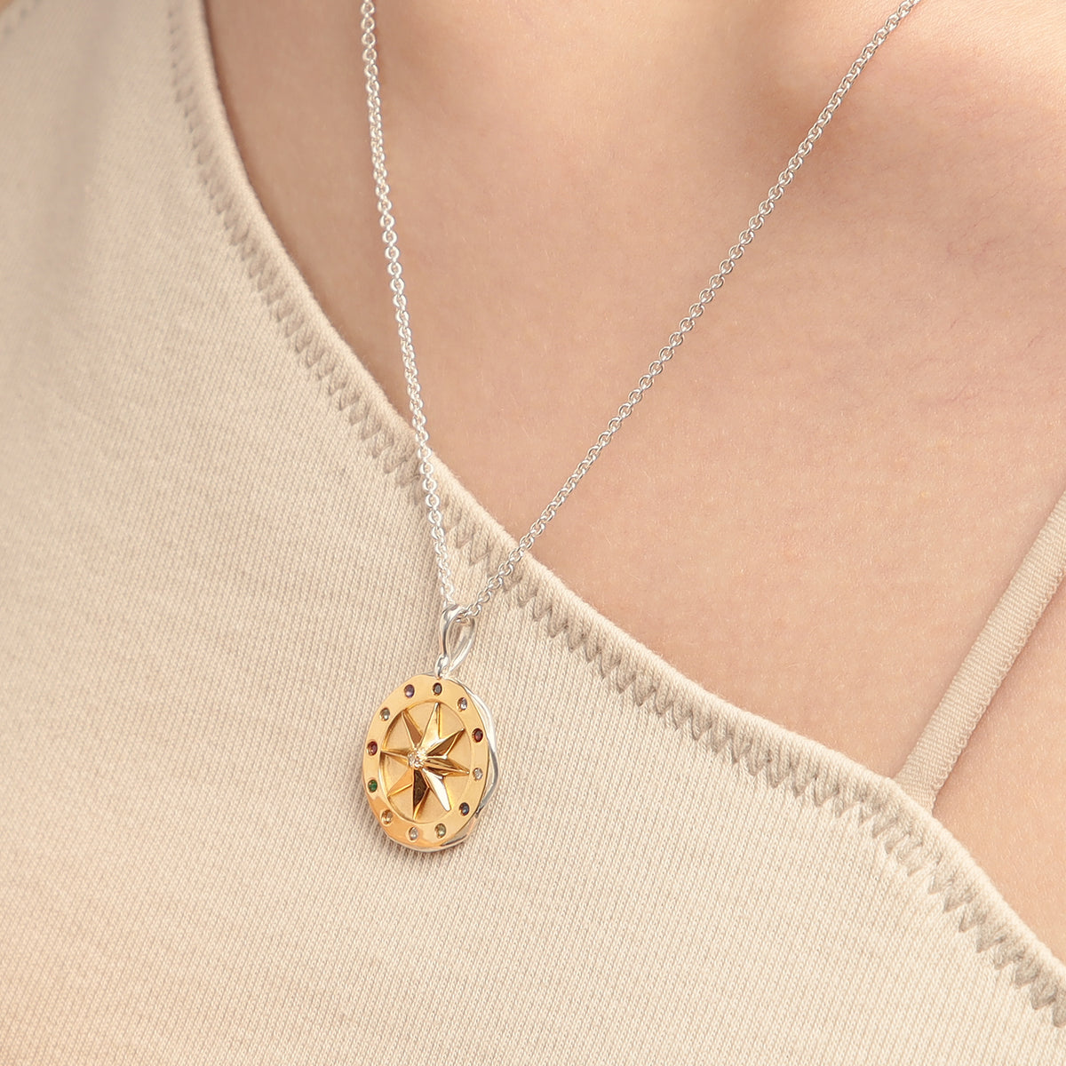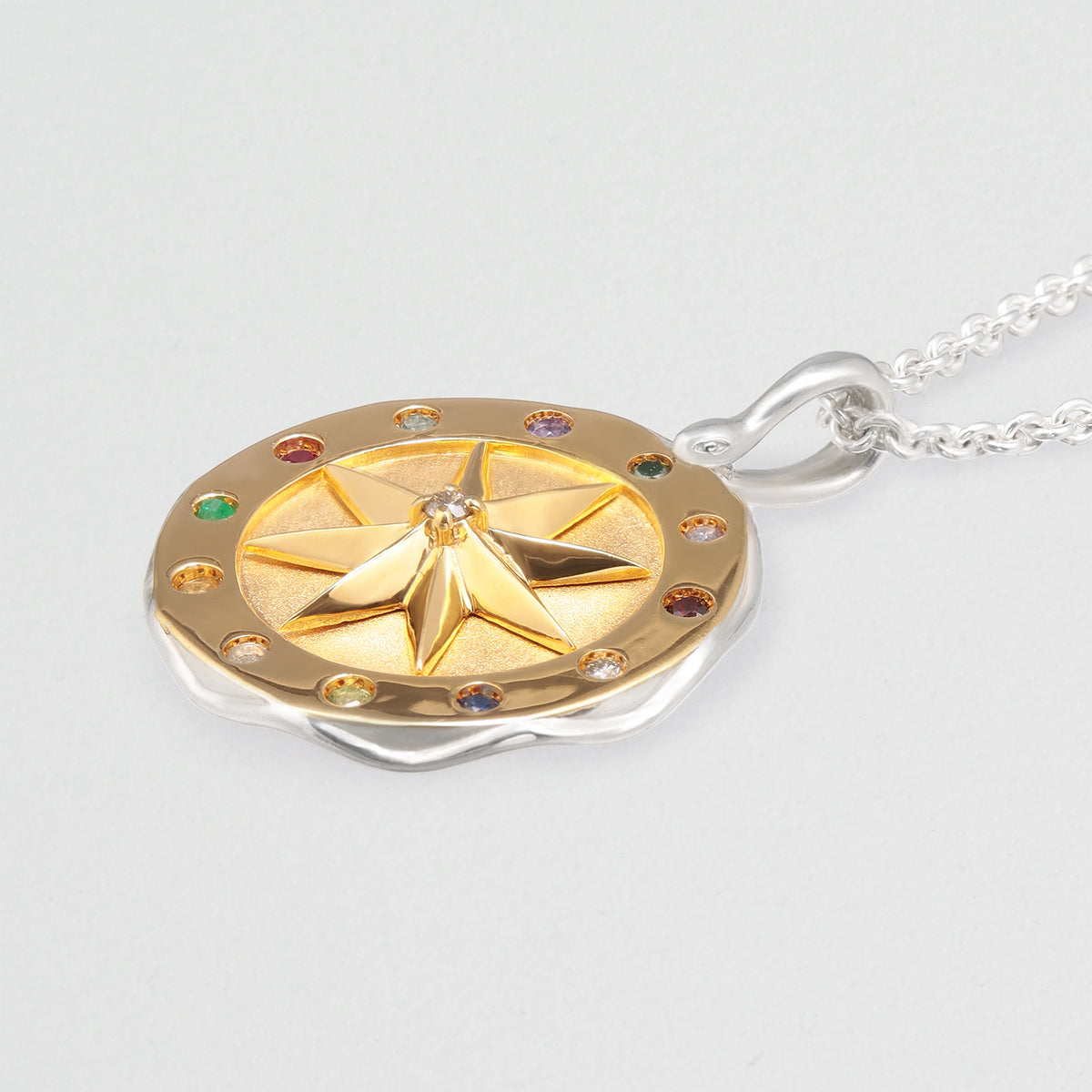 希望に満ちた新たな一年の幸運を願う、ハッピーなメッセージを宿したペンダントネックレス。一番星のように進むべき道を指し示してくれる幸運のコンパスモチーフには、12星座にまつわる守護石を贅沢にセッティング。色とりどりのパワーストーンたちが、始まったばかりのまっさらな日々にポジティブなフォーチュンを運んでくれそう。トップのバチカンから繋がる側面には、生命力あふれるスネークモチーフがあしらわれ、富と叡智を示唆しています。裏面は月と太陽の陰陽が一体化した、完全性を表す神秘的なデザインに。その日のスタイリングに合わせて、リバーシブルで楽しめます。