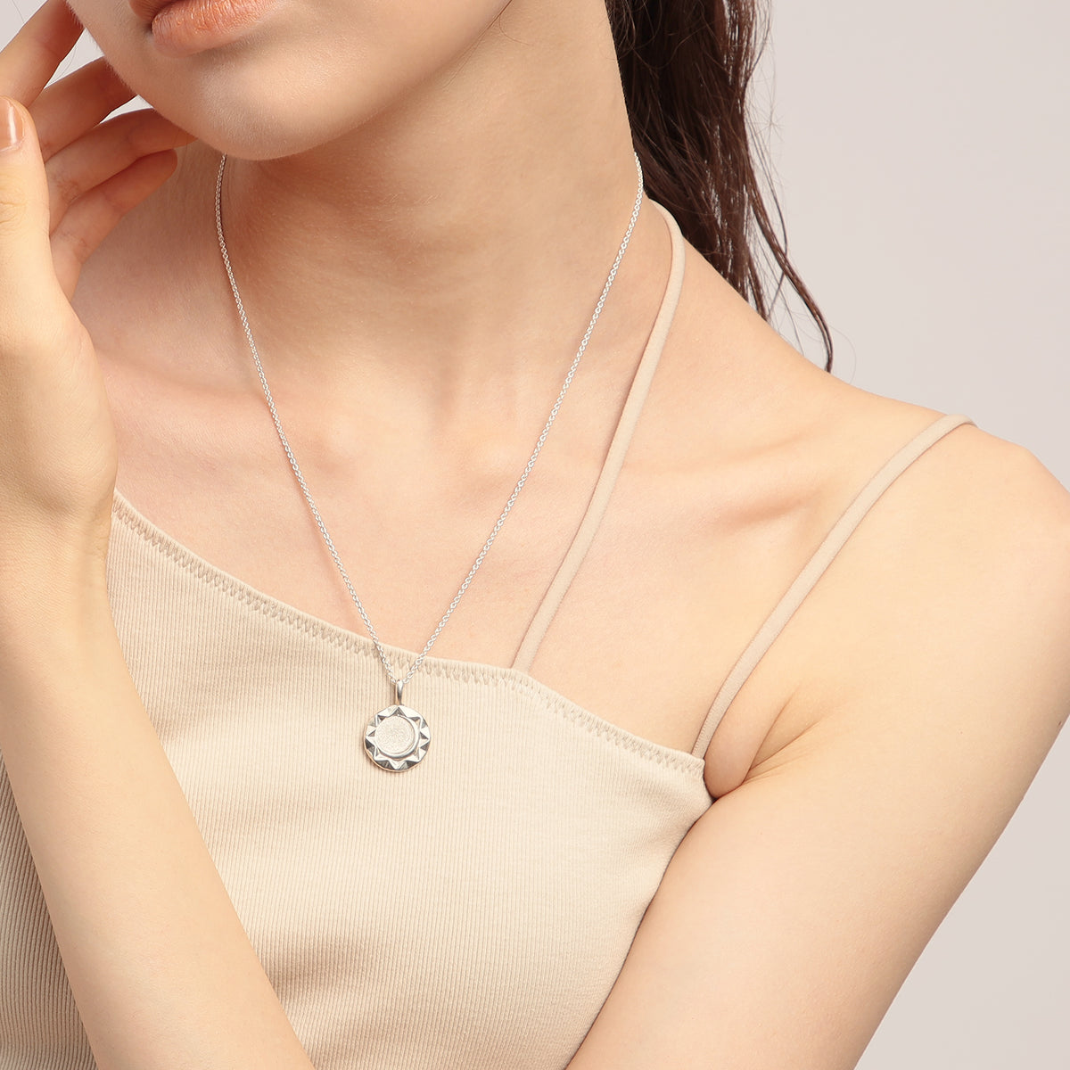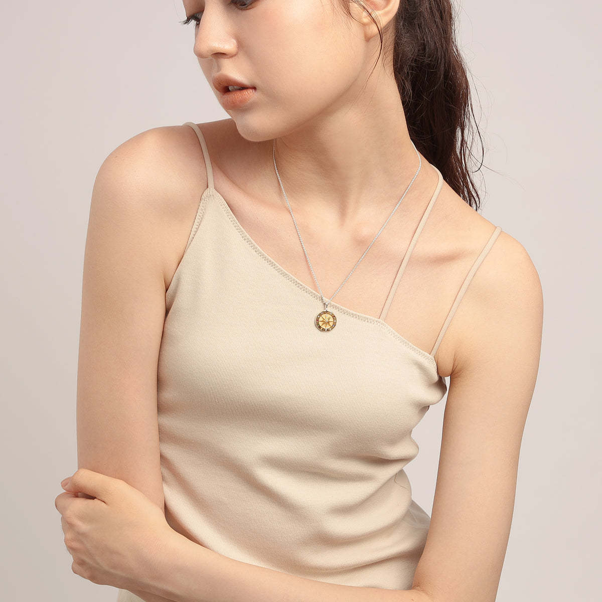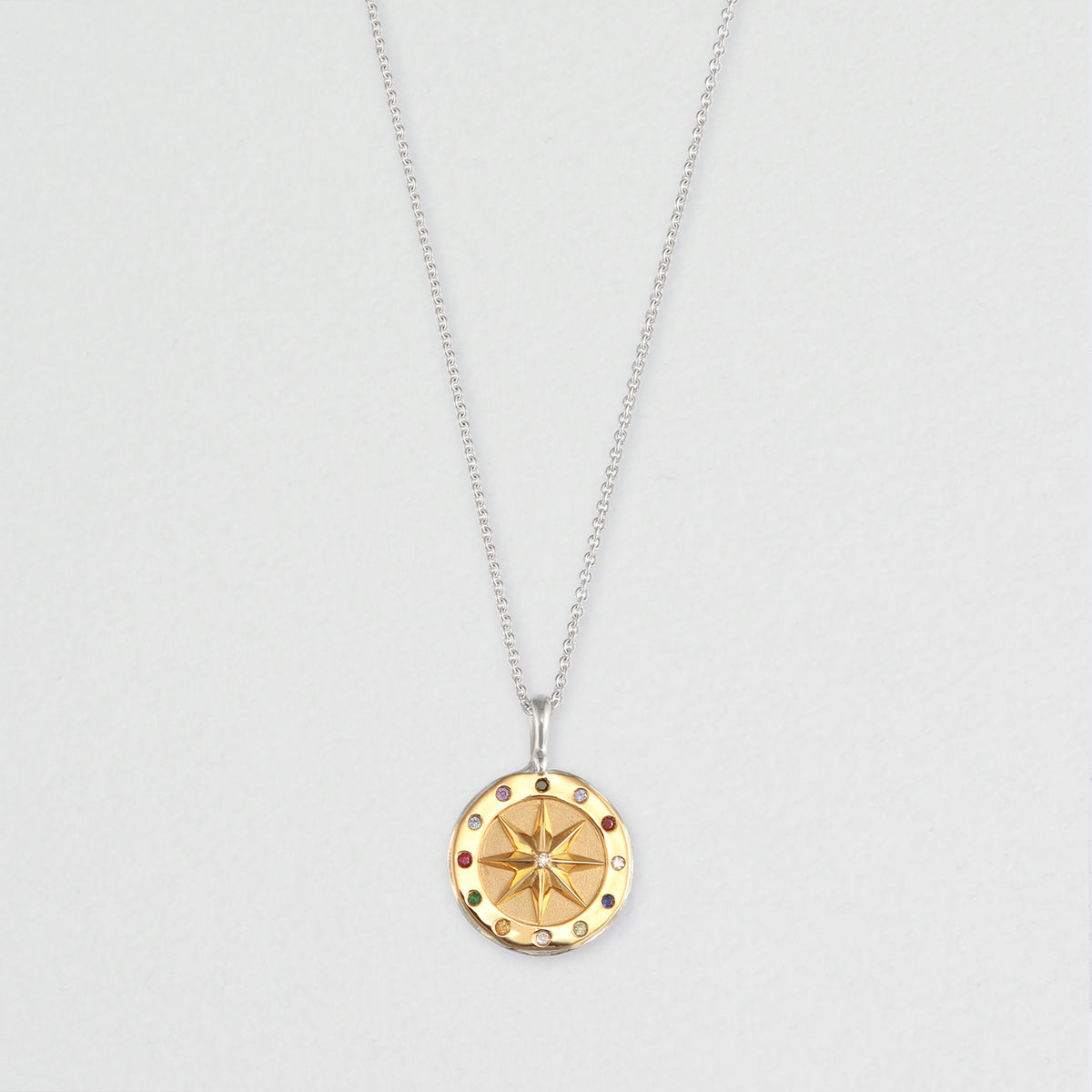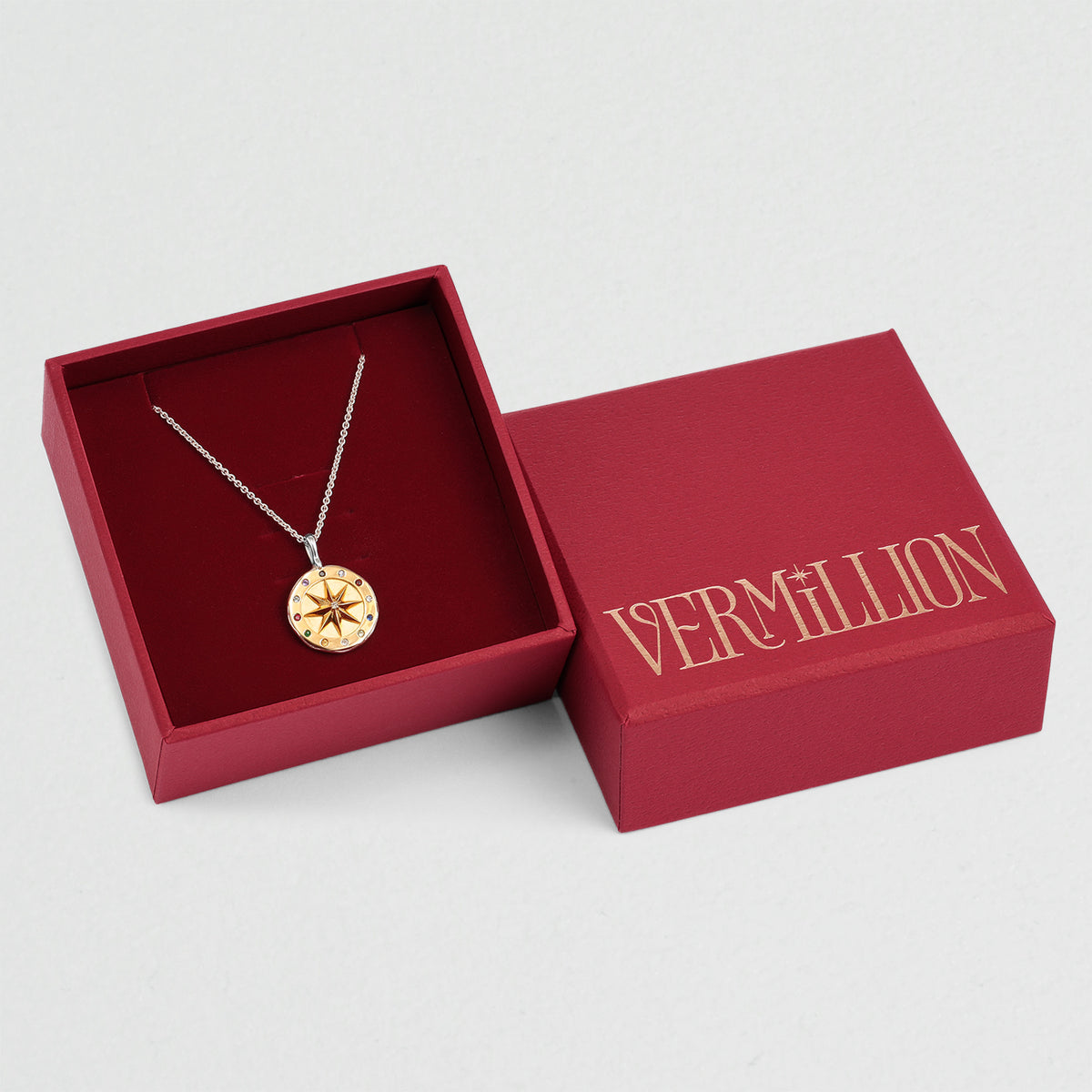 希望に満ちた新たな一年の幸運を願う、ハッピーなメッセージを宿したペンダントネックレス。一番星のように進むべき道を指し示してくれる幸運のコンパスモチーフには、12星座にまつわる守護石を贅沢にセッティング。色とりどりのパワーストーンたちが、始まったばかりのまっさらな日々にポジティブなフォーチュンを運んでくれそう。トップのバチカンから繋がる側面には、生命力あふれるスネークモチーフがあしらわれ、富と叡智を示唆しています。裏面は月と太陽の陰陽が一体化した、完全性を表す神秘的なデザインに。その日のスタイリングに合わせて、リバーシブルで楽しめます。