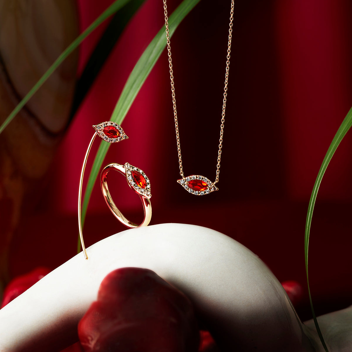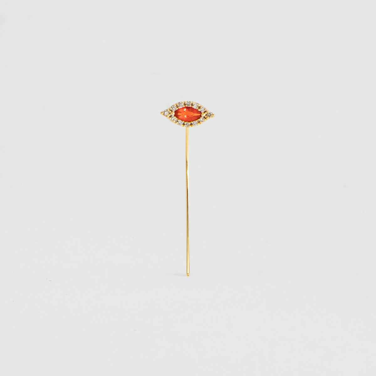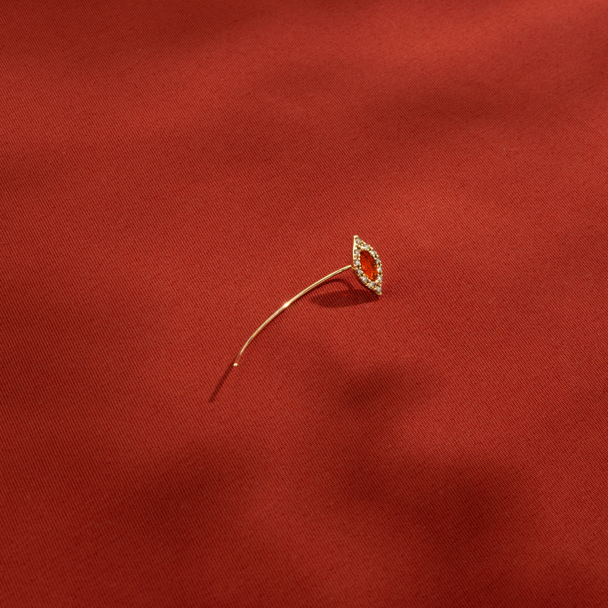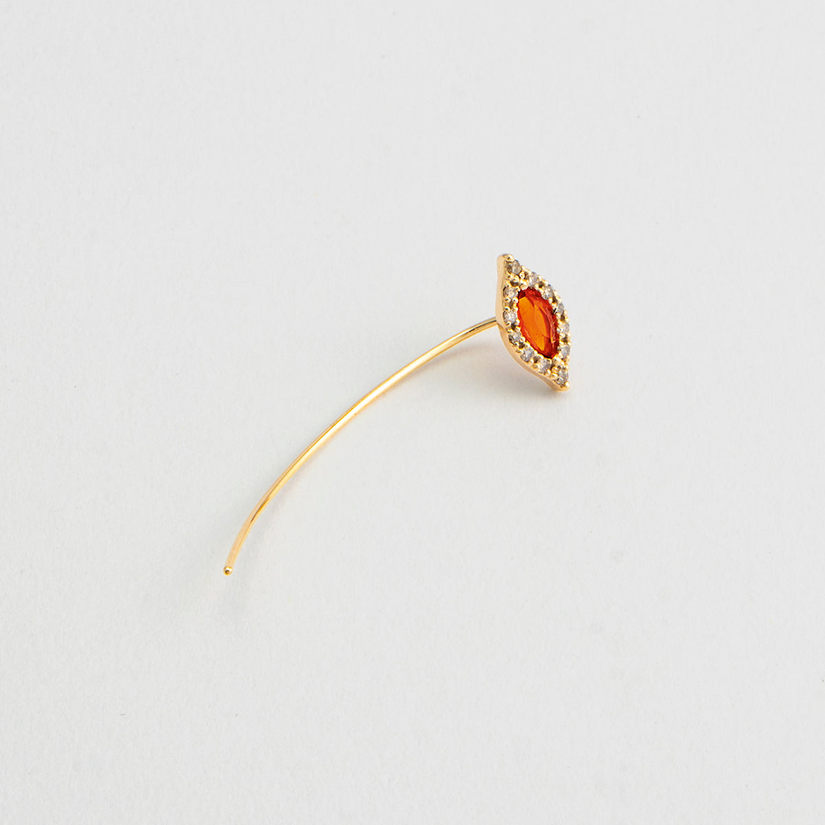 古来から富と幸運のサインと呼ばれる一等星、アルデバランをイメージしたシングルピアス。アルデバランとは、アラビア語で「後に続くもの 」という意味を持ち、牡牛座の目に位置することから「ブルズ・アイ」とも呼ばれます。オレンジ色に輝く星を、炎のようにきらめくファイアオパールで表現しました。取り巻くブラウンダイヤモンドはビビッドなオレンジカラーを引き立てながら華やかな光を放ち、存在感のあるデザインで明るくプレイフルな表情を演出してくれます。