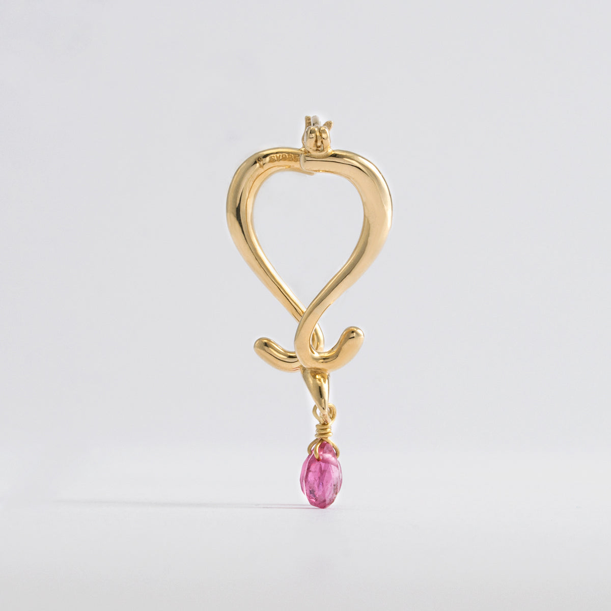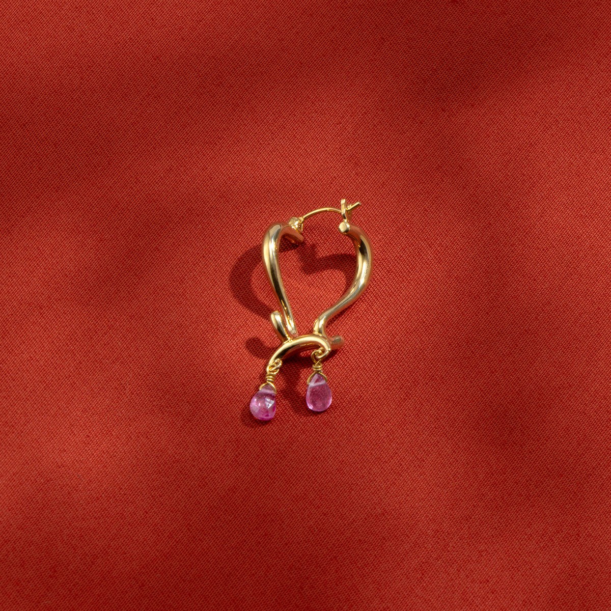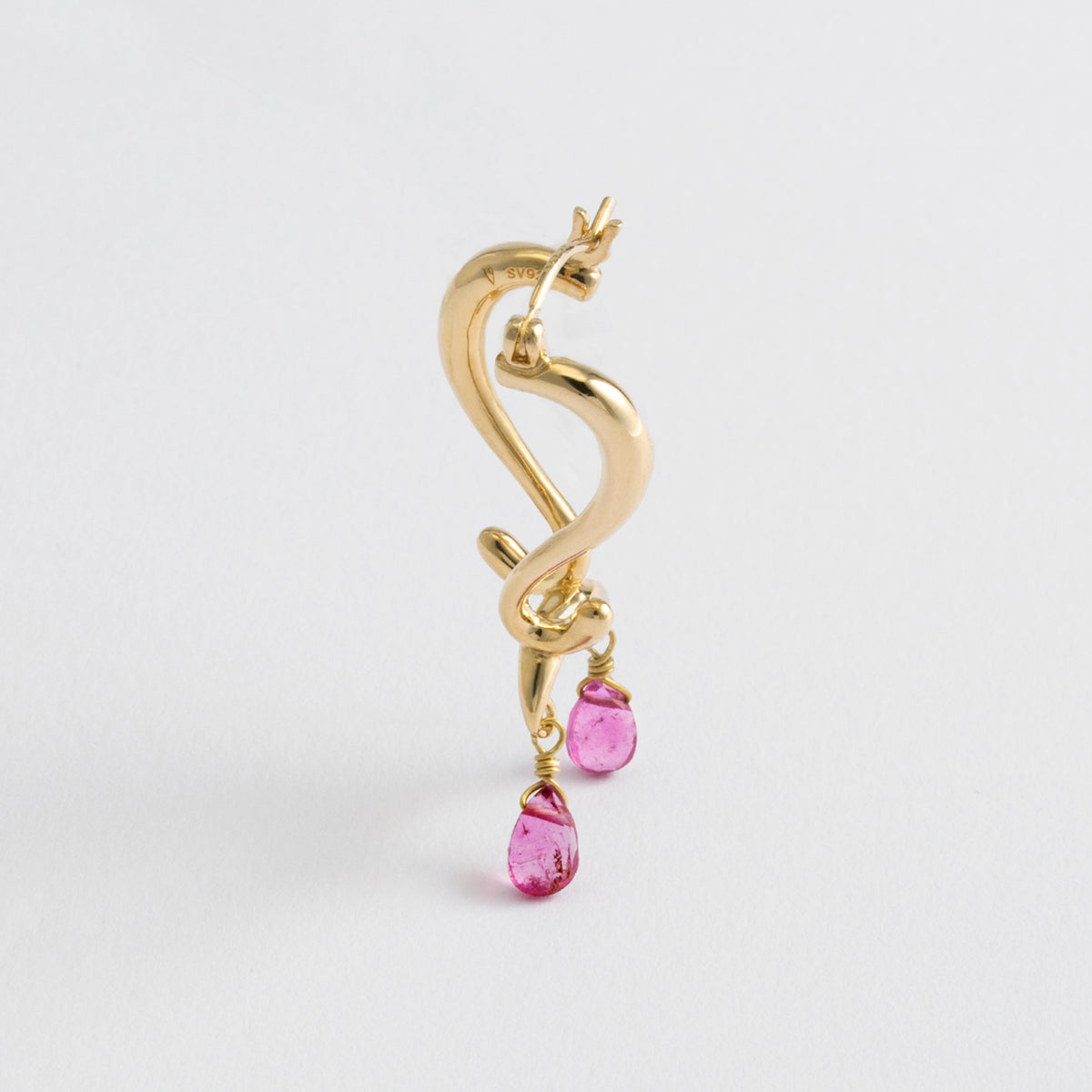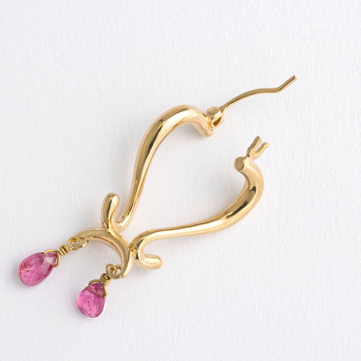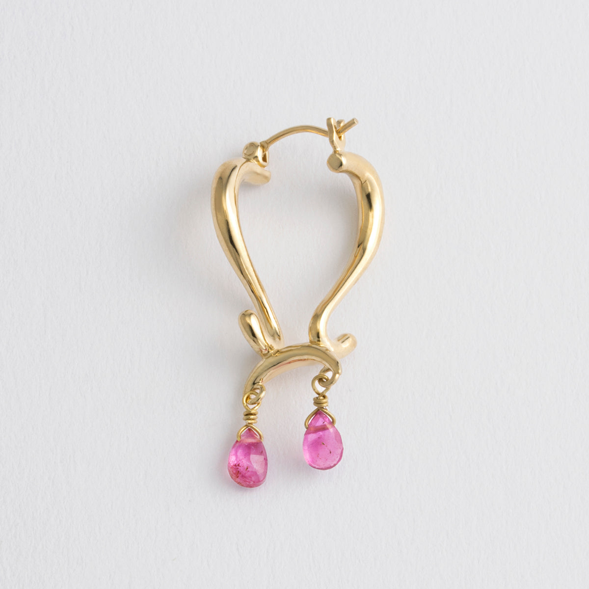 てんびん座の星座記号を大胆にアレンジした、アートピースのようなシングルピアス。艶やかに磨き上げられた美しい地金が耳元で立体的に輝きます。天秤のように星座石であるピンクトルマリンを2石セッティングしました。薔薇のようなピンクカラーが耳元で揺れ、美しい耳元を演出します。