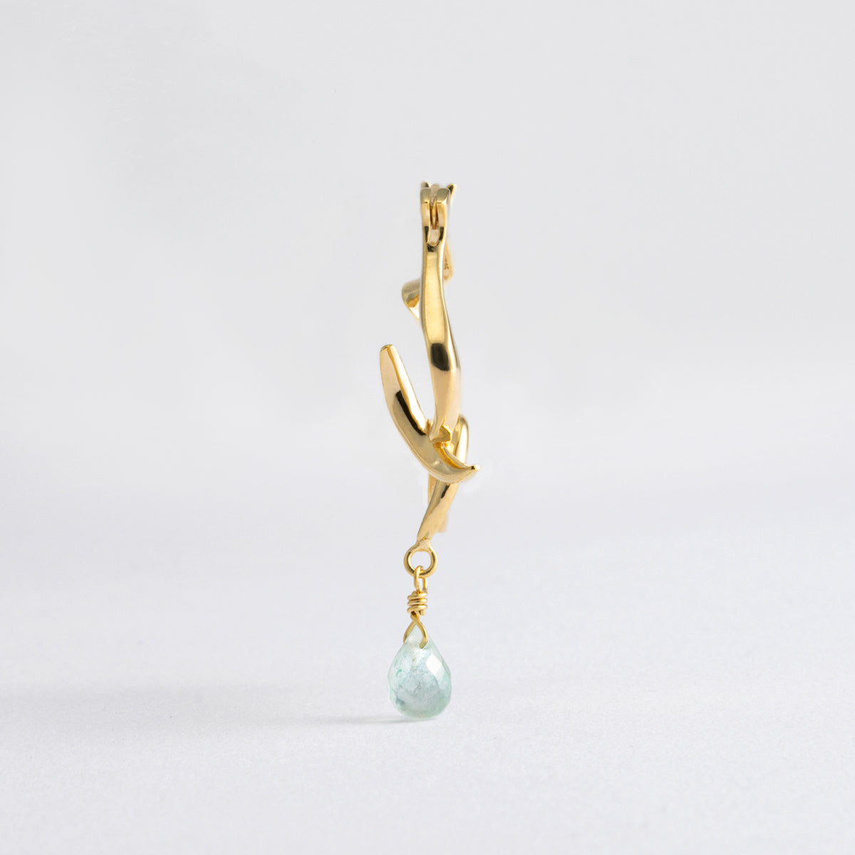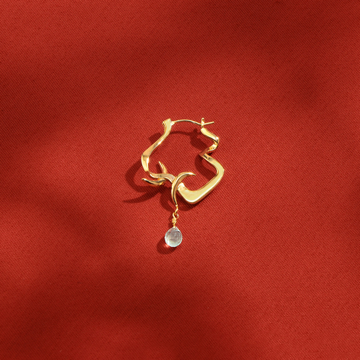 うお座の星座記号を大胆にアレンジした、アートピースのようなシングルピアス。艶やかに磨き上げられた美しい地金が耳元で立体的に輝きます。うお座の神話をイメージソースにし、水面に流れるリボンを象ったフープから星座石であるアクアマリンをセッティング。深い癒しの心と共鳴する、海の色のような優しいブルーが耳元を彩ります。