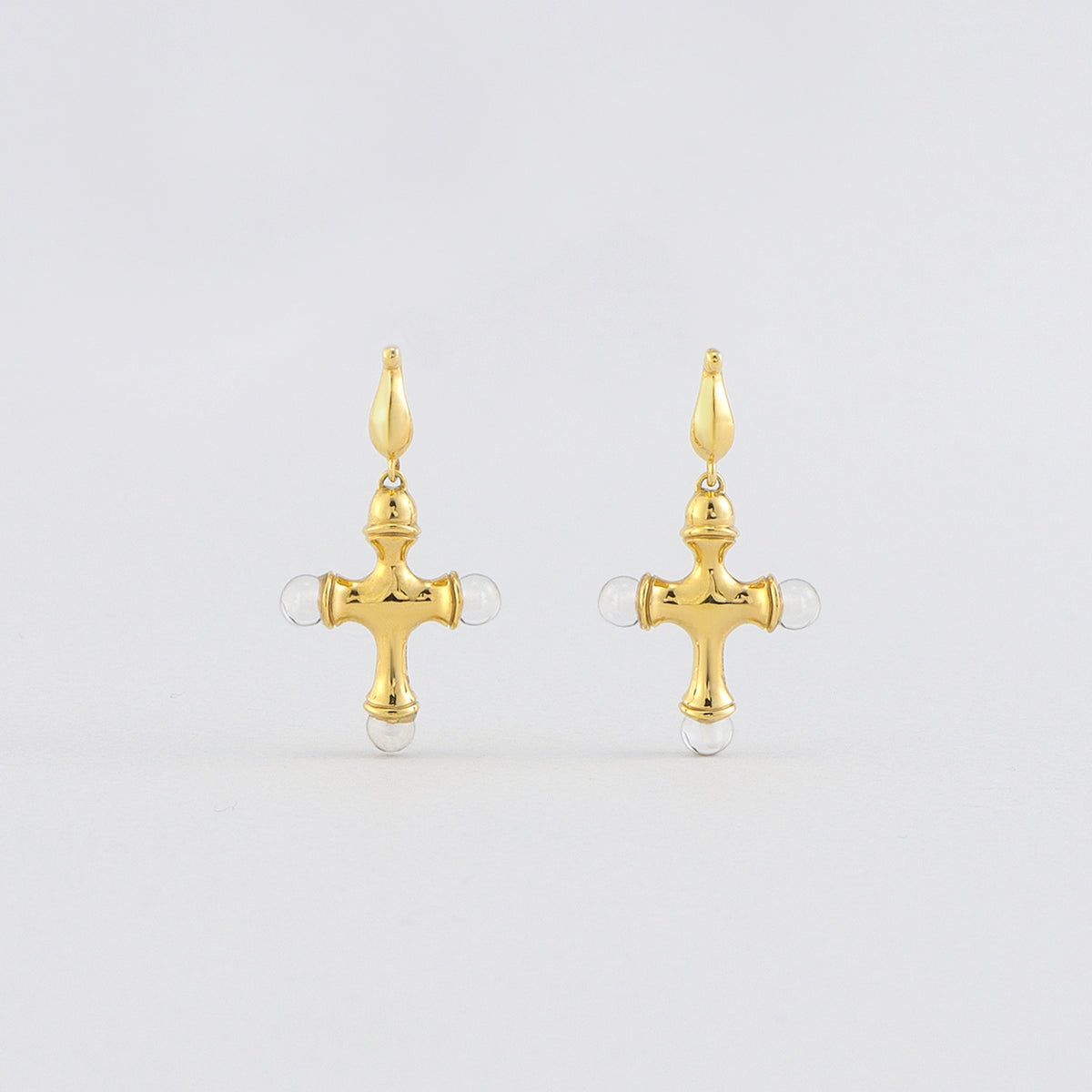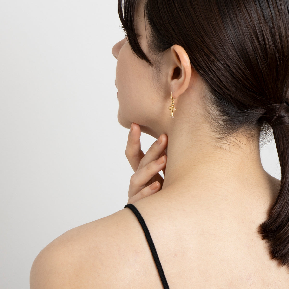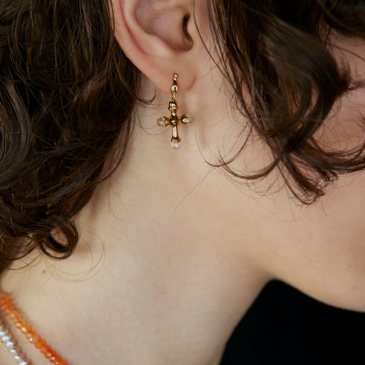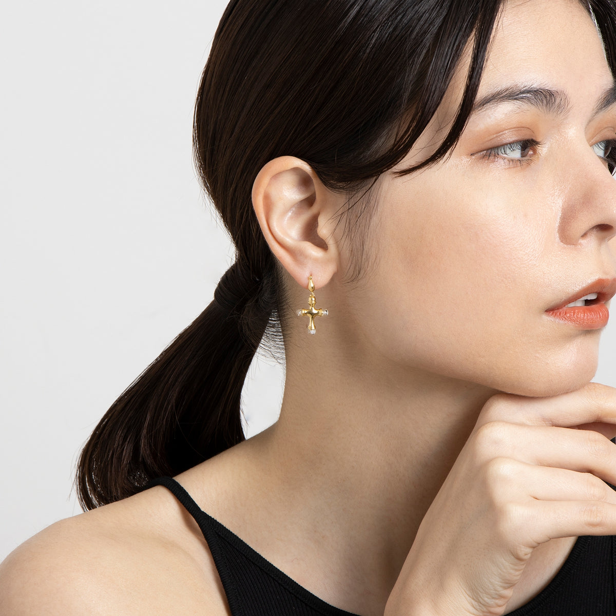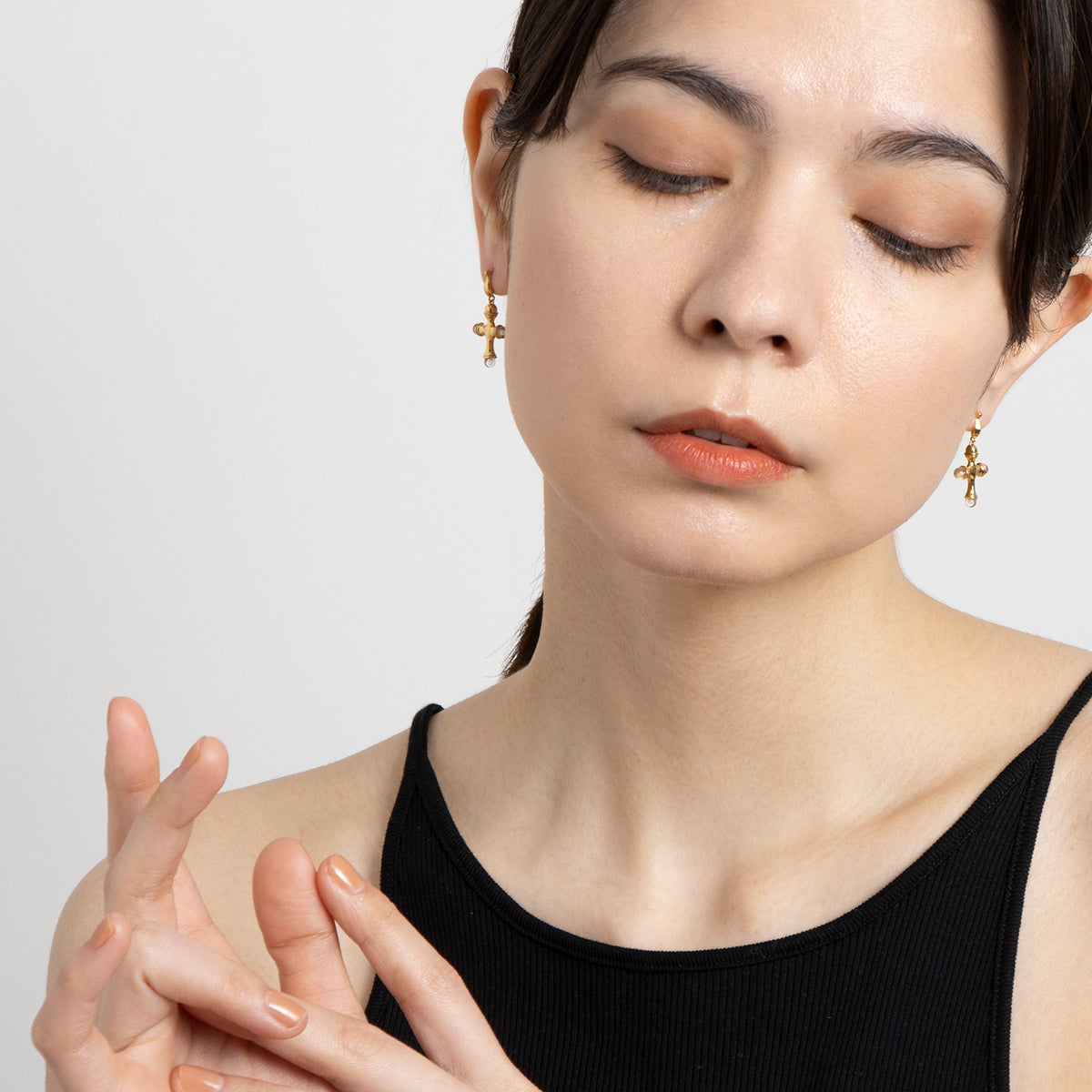 クロスは、万物を構成する火・水・風・土の4つのエレメントが完璧に調和した姿を表しているといわれるタリスマン。裏表のないふっくらとしたフォルムとラウンドストーンが古代のタリスマンを彷彿とさせるモチーフピアスです。ほどよいボリューム感とクリアなストーンが耳元に煌めきとムードをもたらします。