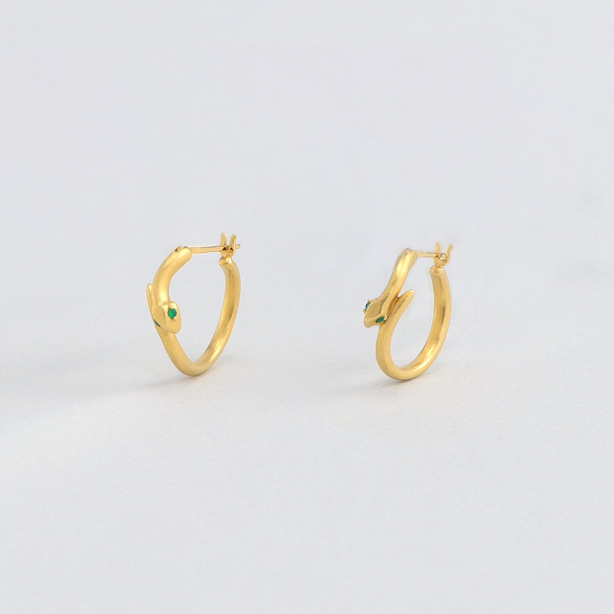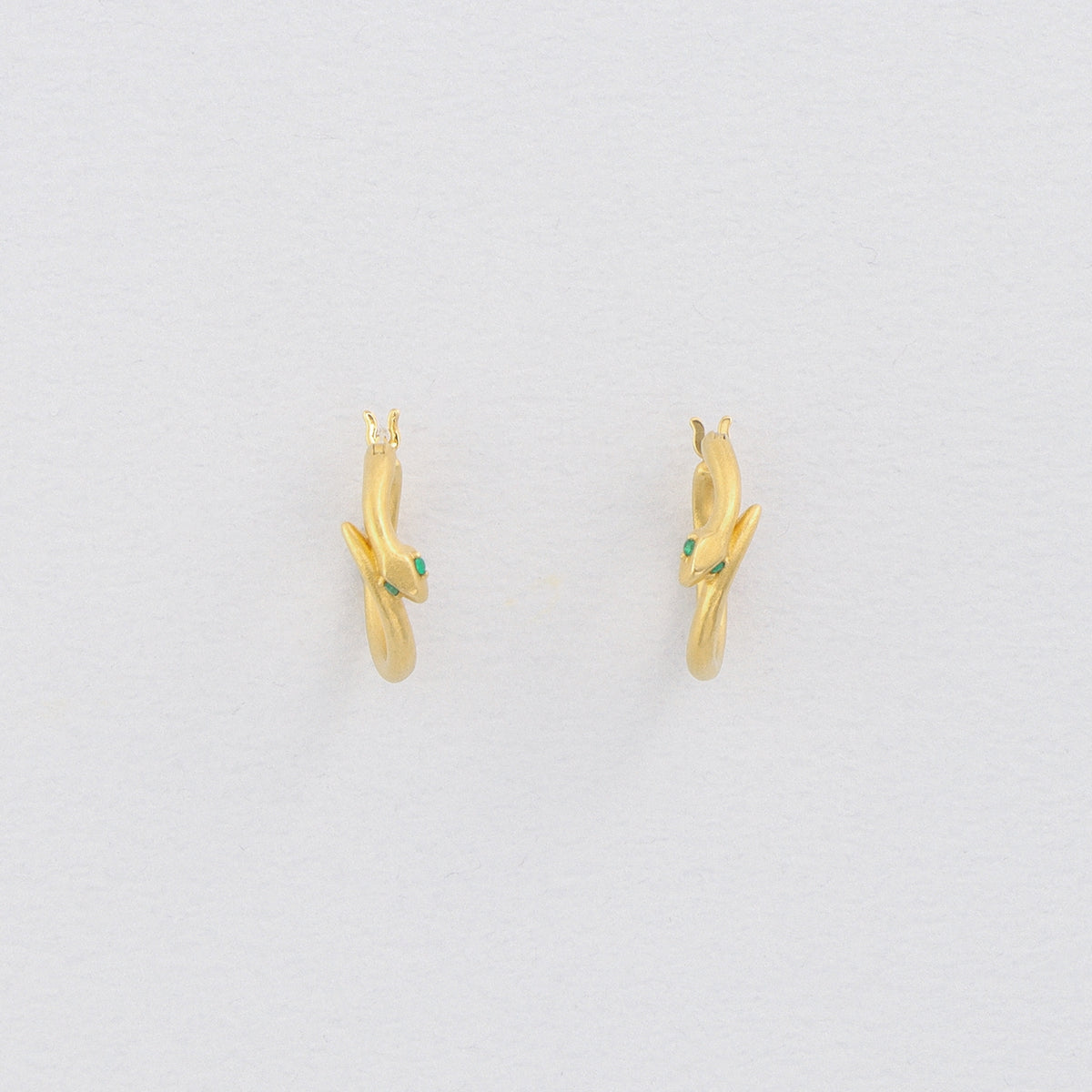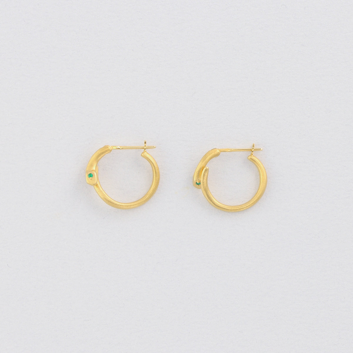 金色に輝く蛇がお守りのように耳元に寄り添うフープピアス。両目には鮮やかな発色が美しいエメラルドをあしらい、その透明感溢れるグリーンの光が優しい表情をたたえています。古来より幸運や永遠の象徴とされてきた蛇モチーフ。金運や健康のお守りとしても人気のあるモチーフです。
