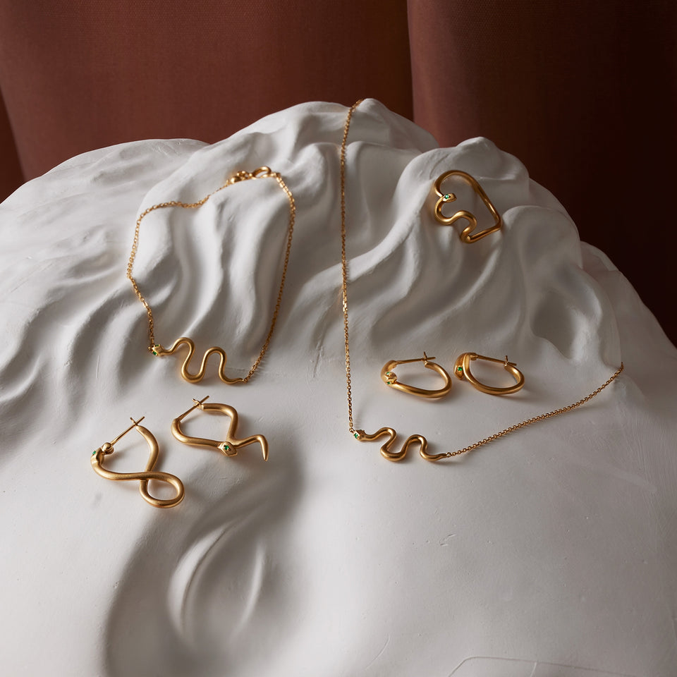 金色に輝く蛇がお守りのように耳元に寄り添うフープピアス。両目には鮮やかな発色が美しいエメラルドをあしらい、その透明感溢れるグリーンの光が優しい表情をたたえています。古来より幸運や永遠の象徴とされてきた蛇モチーフ。金運や健康のお守りとしても人気のあるモチーフです。