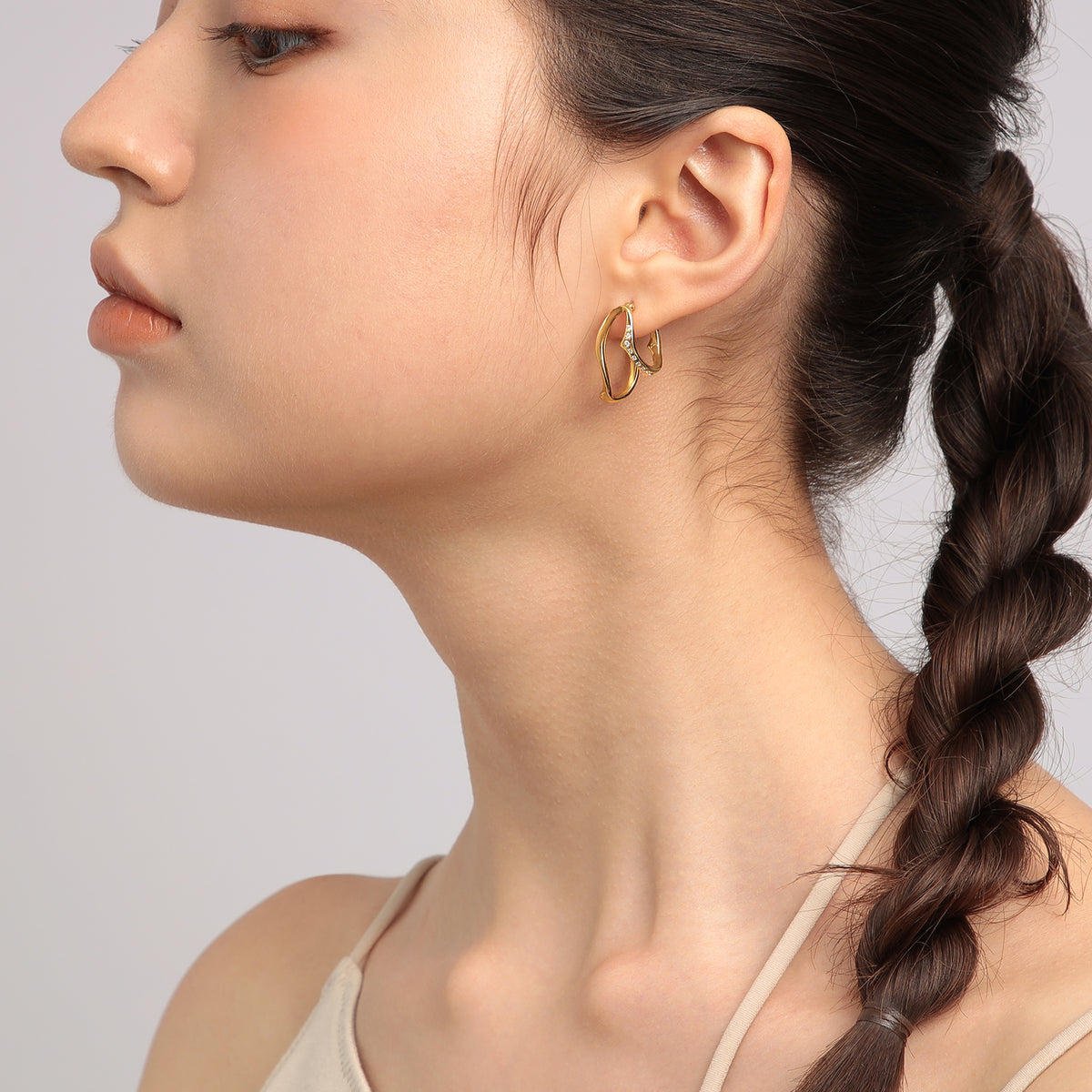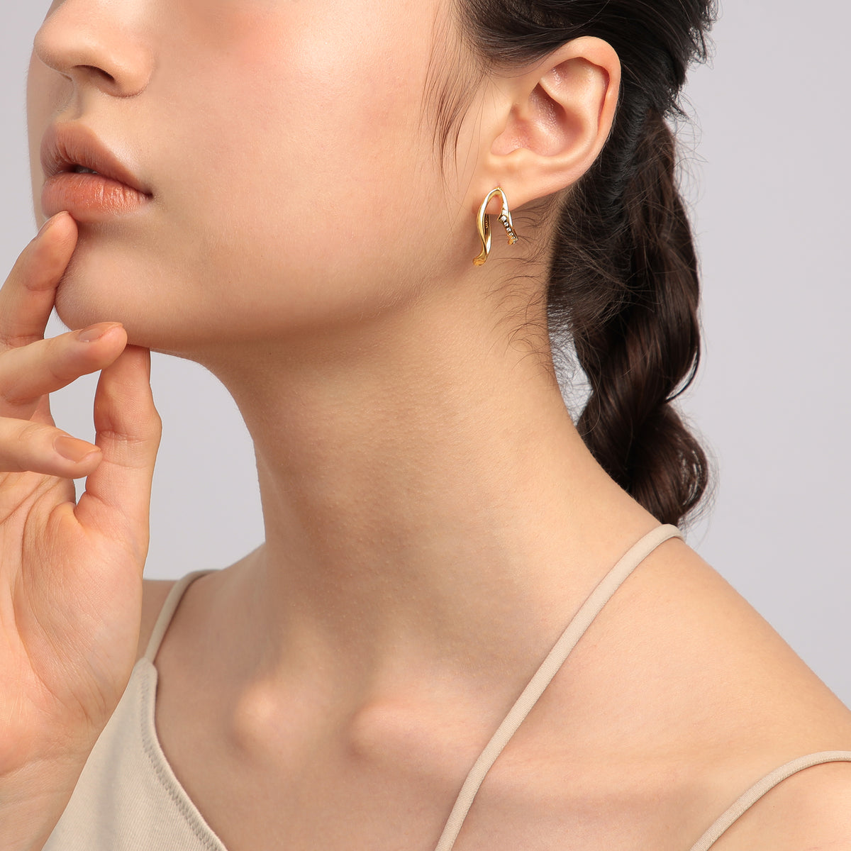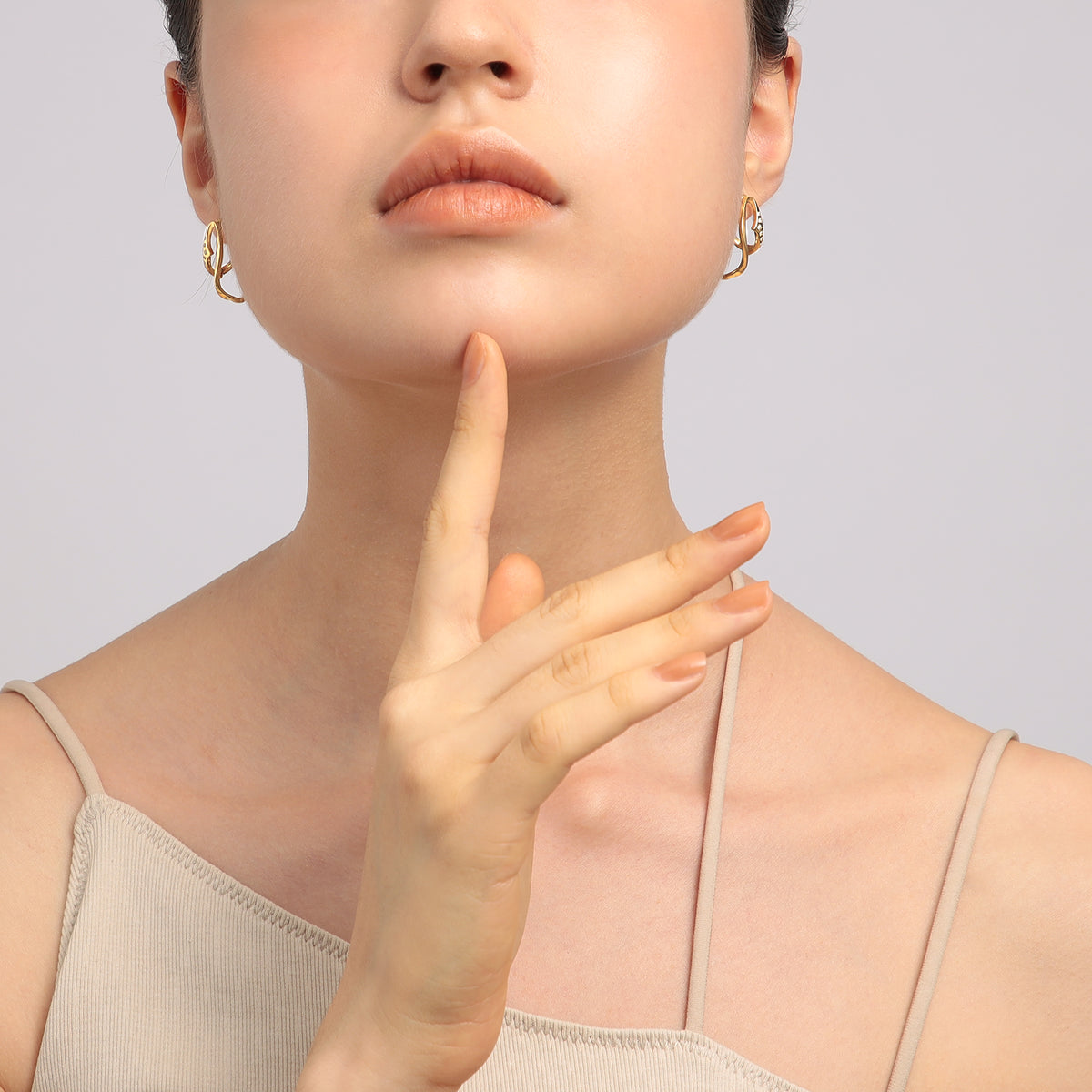 金星と繋がる、愛と美の女神・アフロディーテからインスパイアされたエレガントなフープピアス。女神がまとうローブ(衣)のようなフォルムと、ヴィーナスを象徴する薔薇の棘をイメージした相反するシルエットが、耳元にエレガントな輝きをプラスします。優雅なカーブを描く有機的なフォルムは、地金の光沢とキュービックジルコニアの輝きのコントラストが印象的。フェイスラインを一層美しく、洗練されたムードに導きます。