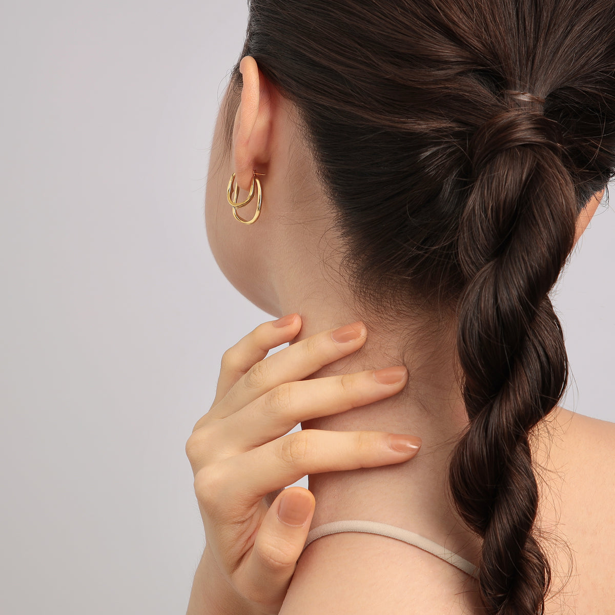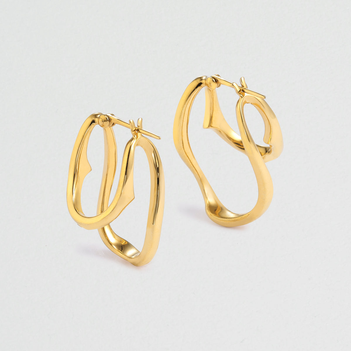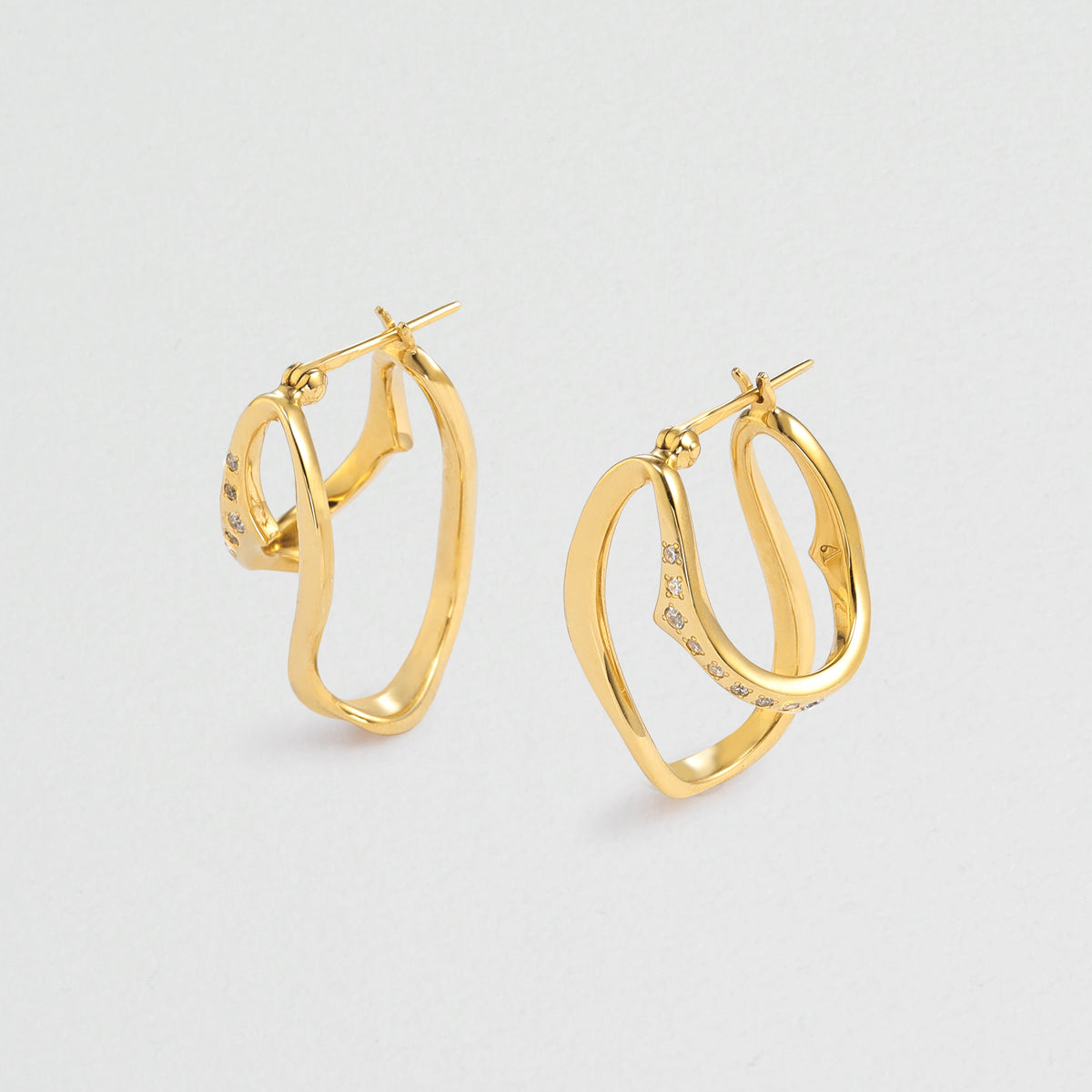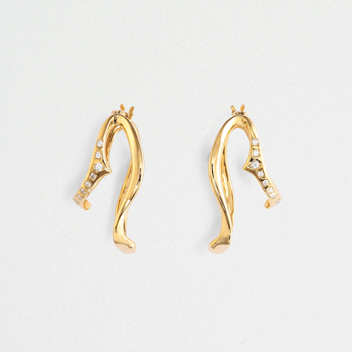 金星と繋がる、愛と美の女神・アフロディーテからインスパイアされたエレガントなフープピアス。女神がまとうローブ(衣)のようなフォルムと、ヴィーナスを象徴する薔薇の棘をイメージした相反するシルエットが、耳元にエレガントな輝きをプラスします。優雅なカーブを描く有機的なフォルムは、地金の光沢とキュービックジルコニアの輝きのコントラストが印象的。フェイスラインを一層美しく、洗練されたムードに導きます。