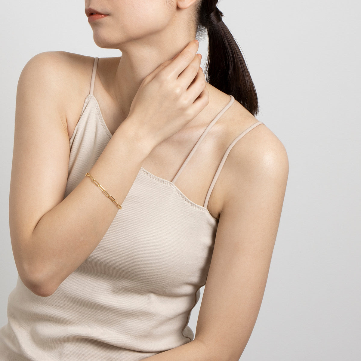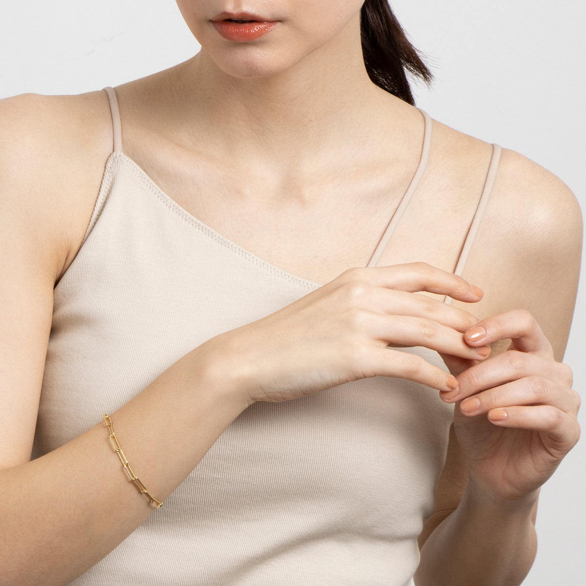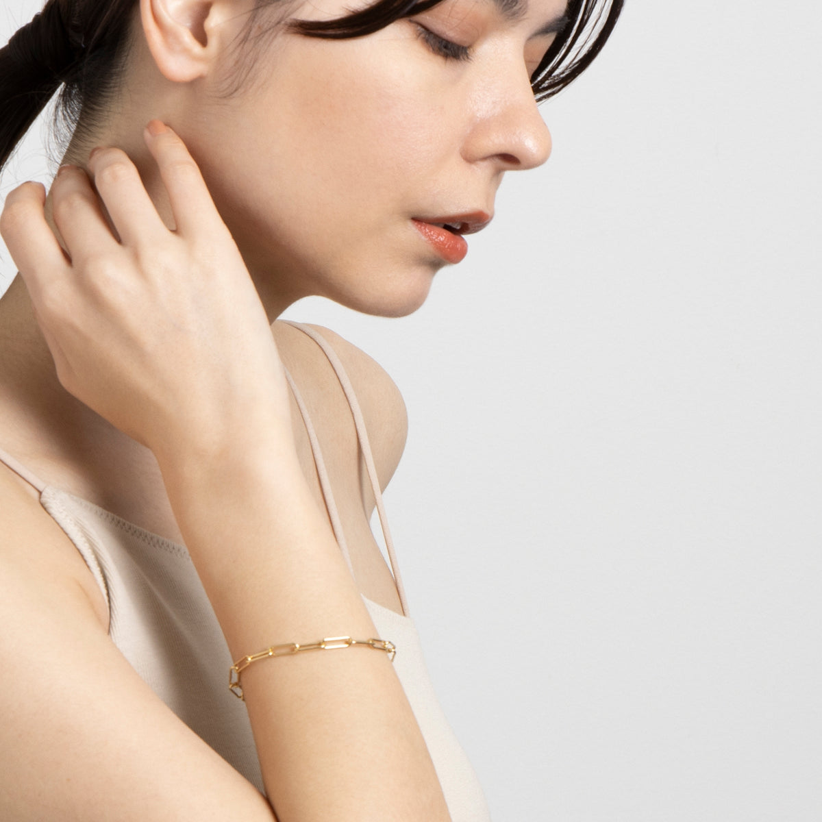ボリューム感がありながら軽やかな柔らかさを感じさせてくれる、1本で着け映えのするチェーンブレスレット。 別売りのチャームと組み合わせて自分だけのアレンジを楽しめます。ややゆとりのある19cmに設定していますが、お好きな位置のコマで着用いただくことで長さ調整が可能です。先端のコマにチャームを下げるアレンジもおすすめ。
