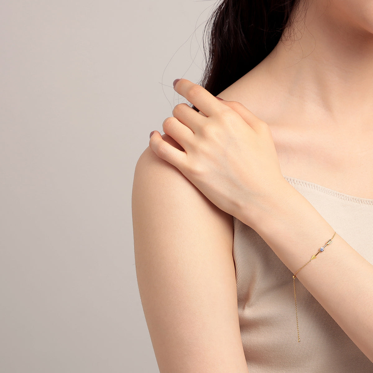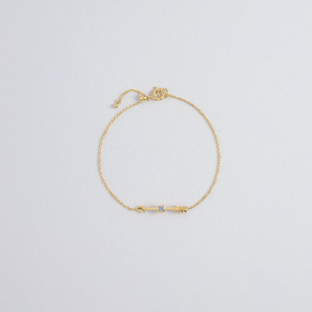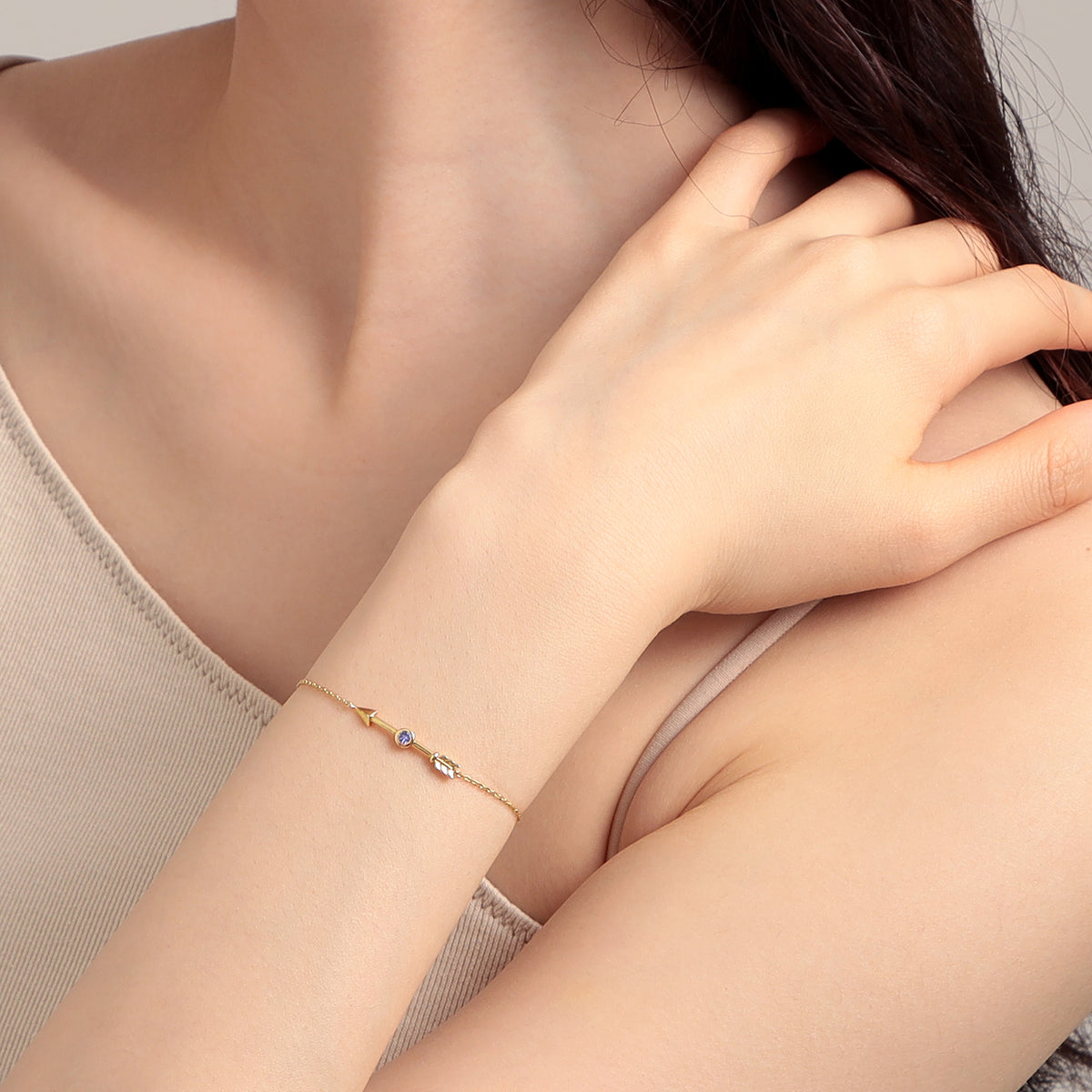 いて座の星座記号をアレンジしたモチーフが、お守りのように手元に寄り添うブレスレット。ドラマティックな陰影を生み出す艶やかに磨き上げられた地金に、深い精神性を象徴するタンザナイトをセッティング。手首に沿うようにわずかにカーブをつけたデザインと、スライドアジャスター付きのチェーンで、手首に心地よくフィットする仕立てに。内なるアンデンティティを表す12星座が、ふと手元を見た時にも心を彩り、コーディネートに印象的な輝きをもたらします。