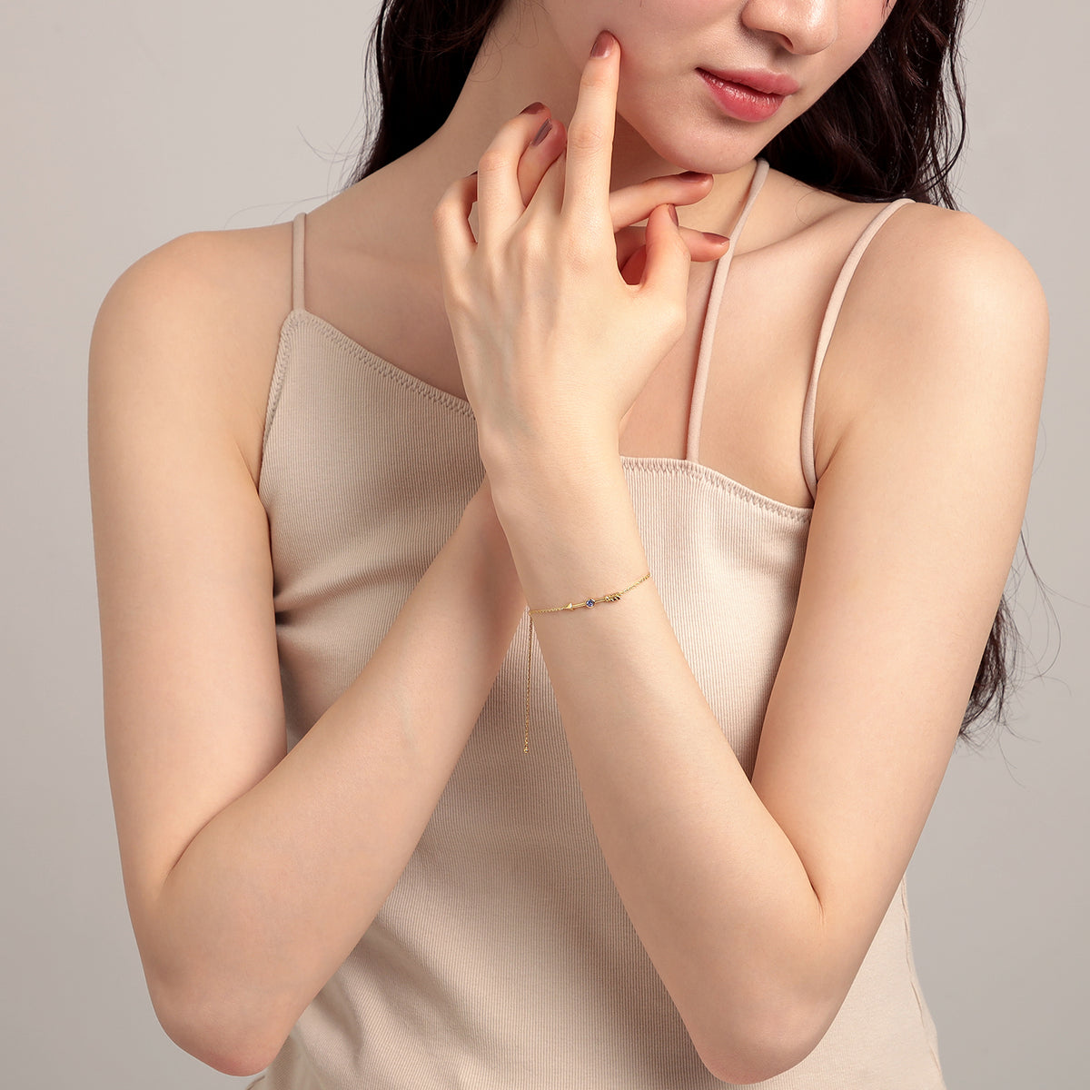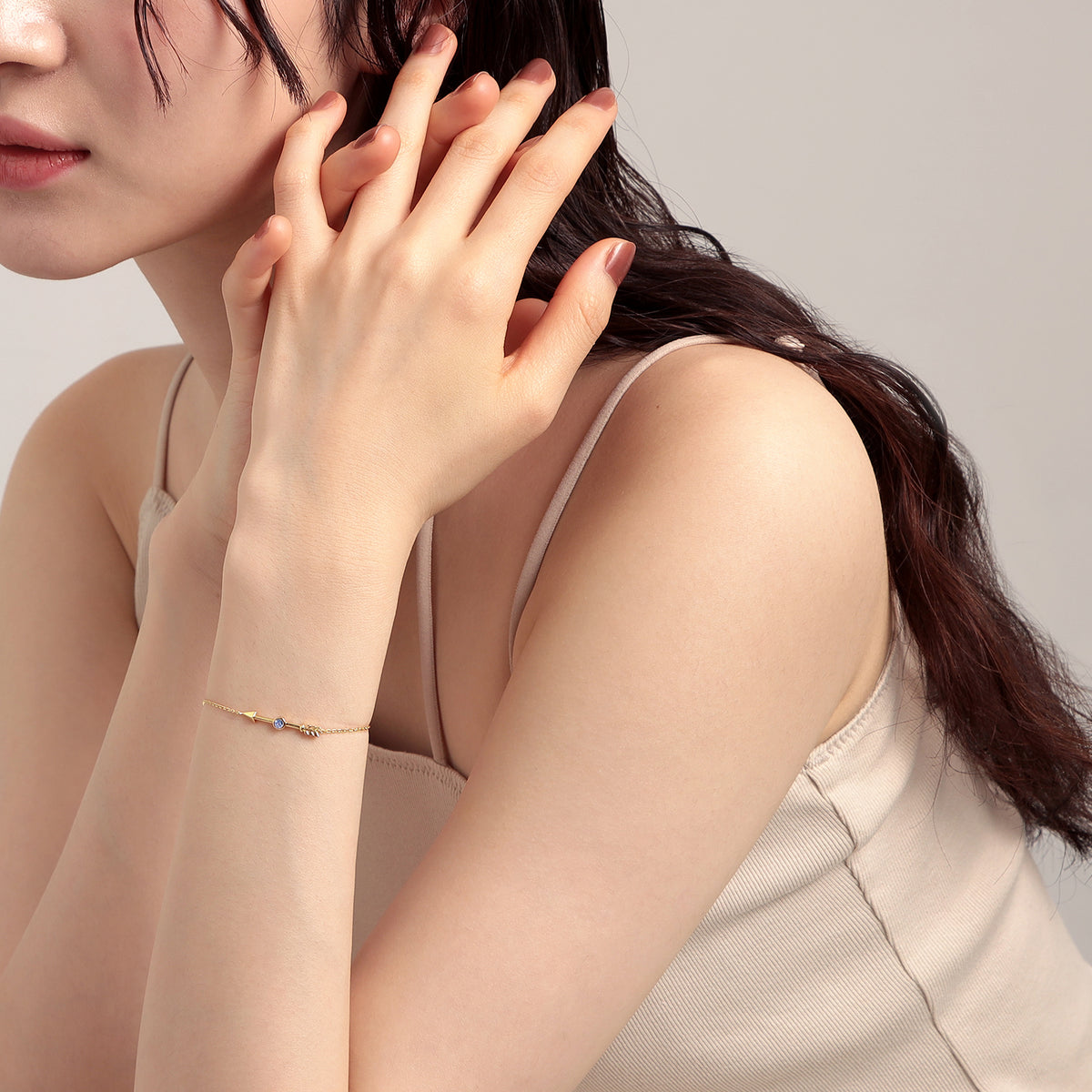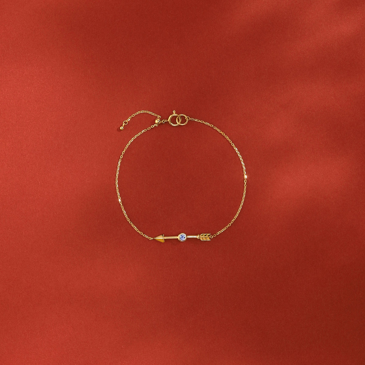 いて座の星座記号をアレンジしたモチーフが、お守りのように手元に寄り添うブレスレット。ドラマティックな陰影を生み出す艶やかに磨き上げられた地金に、深い精神性を象徴するタンザナイトをセッティング。手首に沿うようにわずかにカーブをつけたデザインと、スライドアジャスター付きのチェーンで、手首に心地よくフィットする仕立てに。内なるアンデンティティを表す12星座が、ふと手元を見た時にも心を彩り、コーディネートに印象的な輝きをもたらします。
