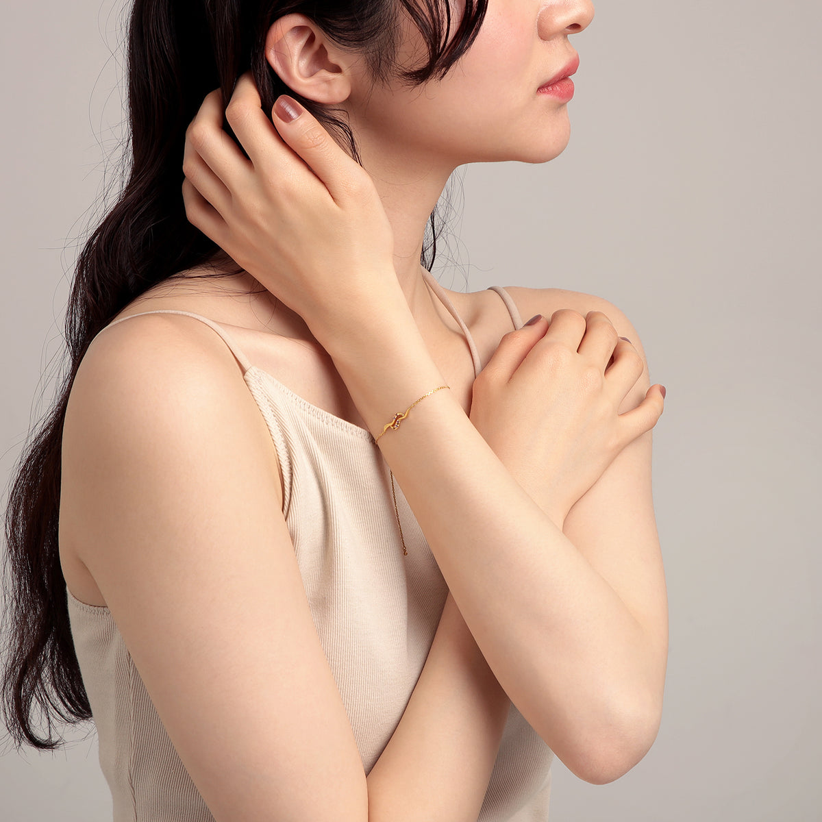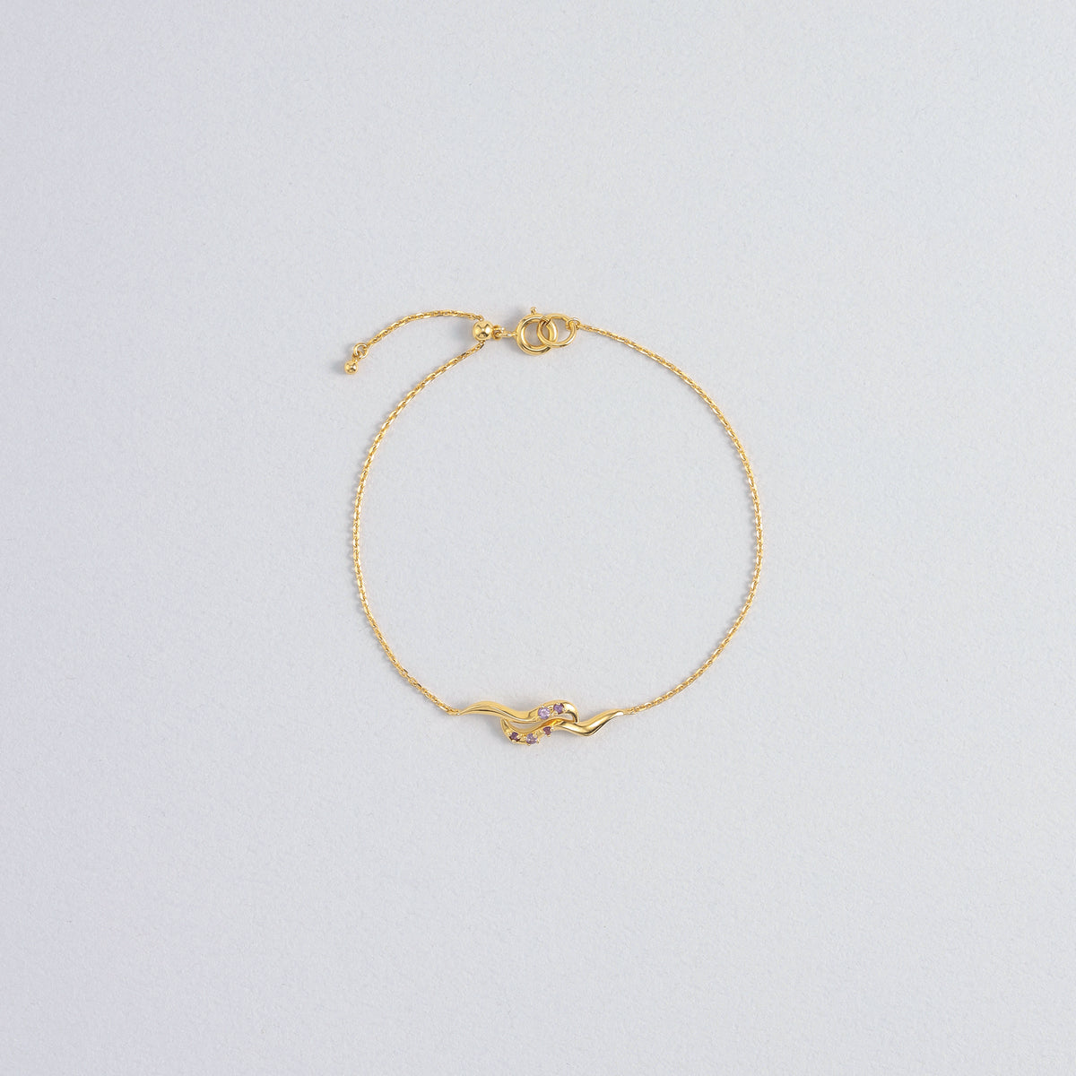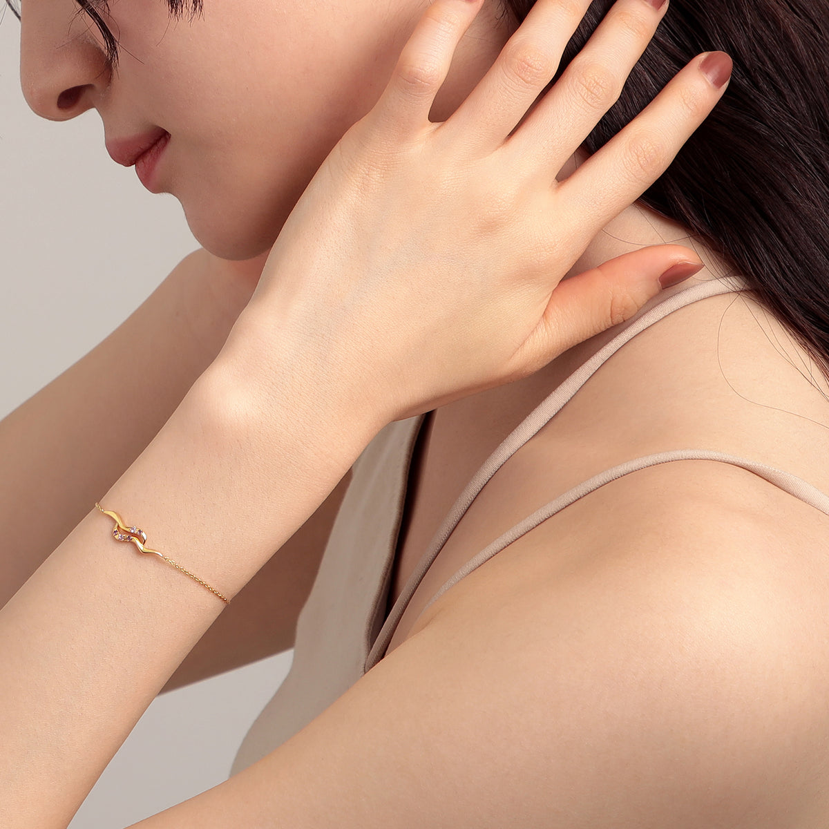 みずがめ座の星座記号をアレンジしたモチーフが、お守りのように手元に寄り添うブレスレット。ドラマティックな陰影を生み出す艶やかに磨き上げられた地金に、愛の守護石である瑞々しいアメシストをセッティング。手首に沿うようにわずかにカーブをつけたデザインと、スライドアジャスター付きのチェーンで、手首に心地よくフィットする仕立てに。内なるアンデンティティを表す12星座が、ふと手元を見た時にも心を彩り、コーディネートに印象的な輝きをもたらします。