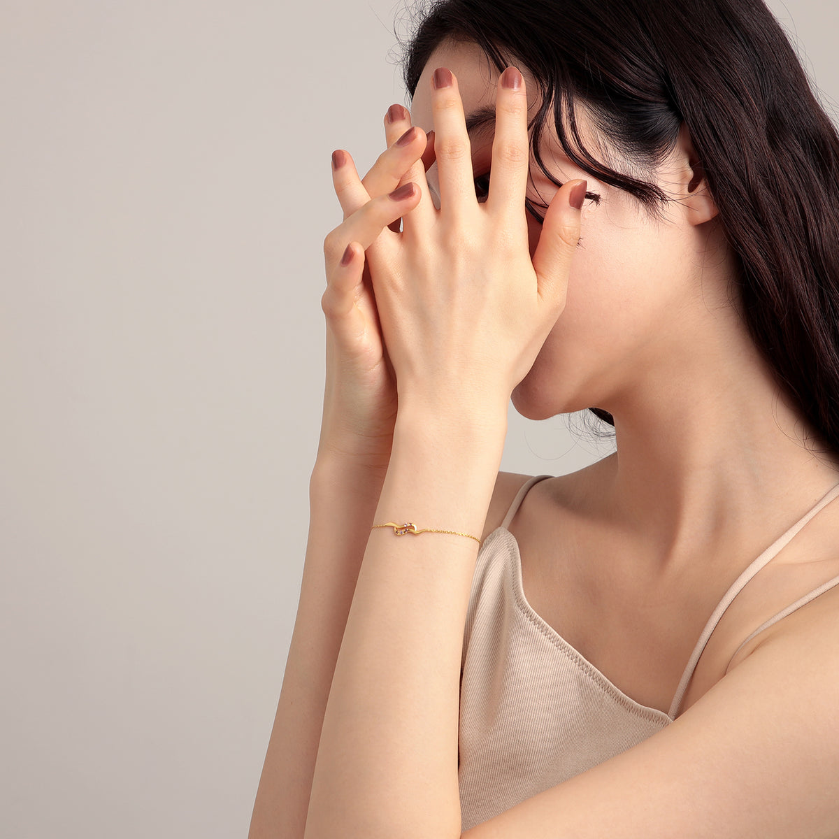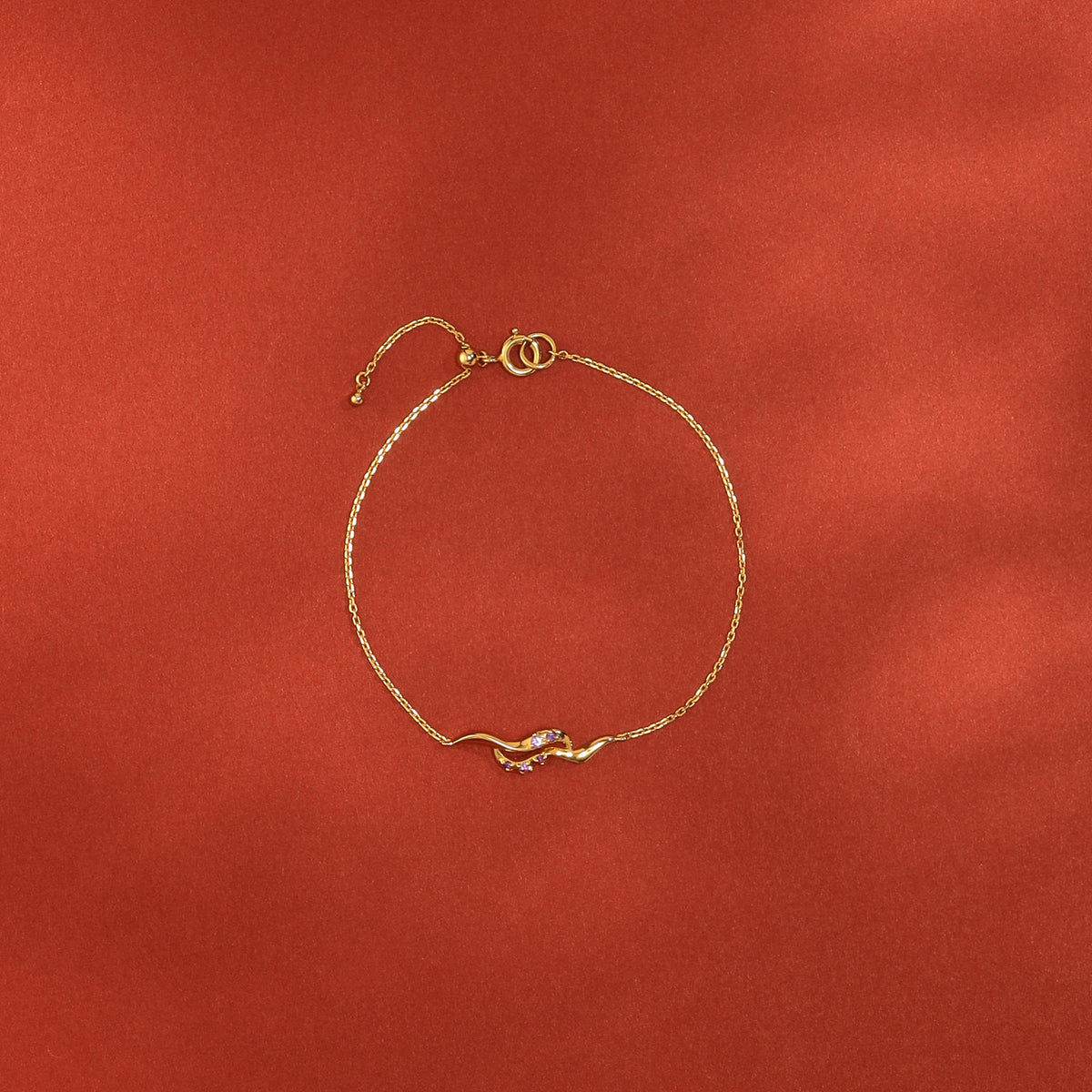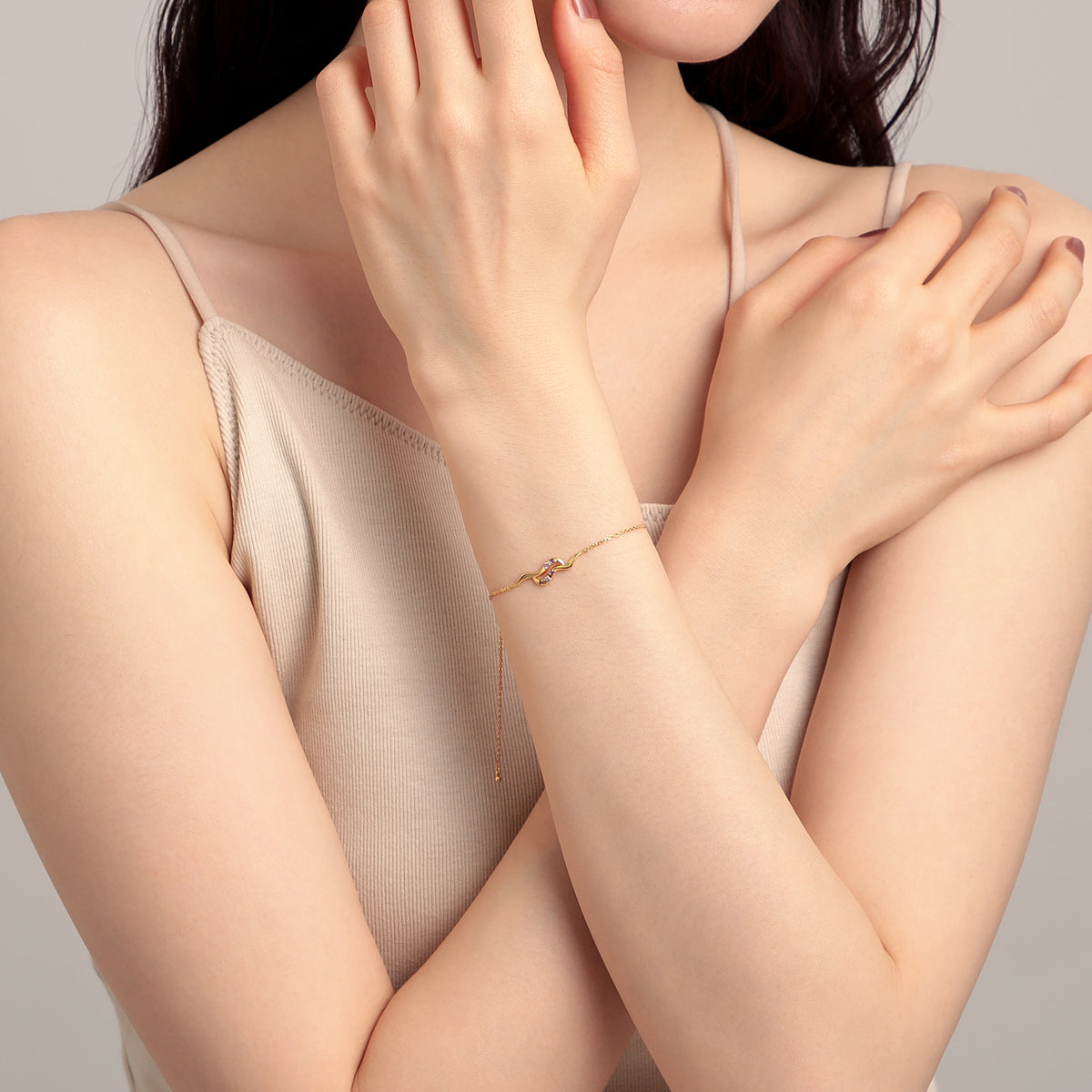 みずがめ座の星座記号をアレンジしたモチーフが、お守りのように手元に寄り添うブレスレット。ドラマティックな陰影を生み出す艶やかに磨き上げられた地金に、愛の守護石である瑞々しいアメシストをセッティング。手首に沿うようにわずかにカーブをつけたデザインと、スライドアジャスター付きのチェーンで、手首に心地よくフィットする仕立てに。内なるアンデンティティを表す12星座が、ふと手元を見た時にも心を彩り、コーディネートに印象的な輝きをもたらします。