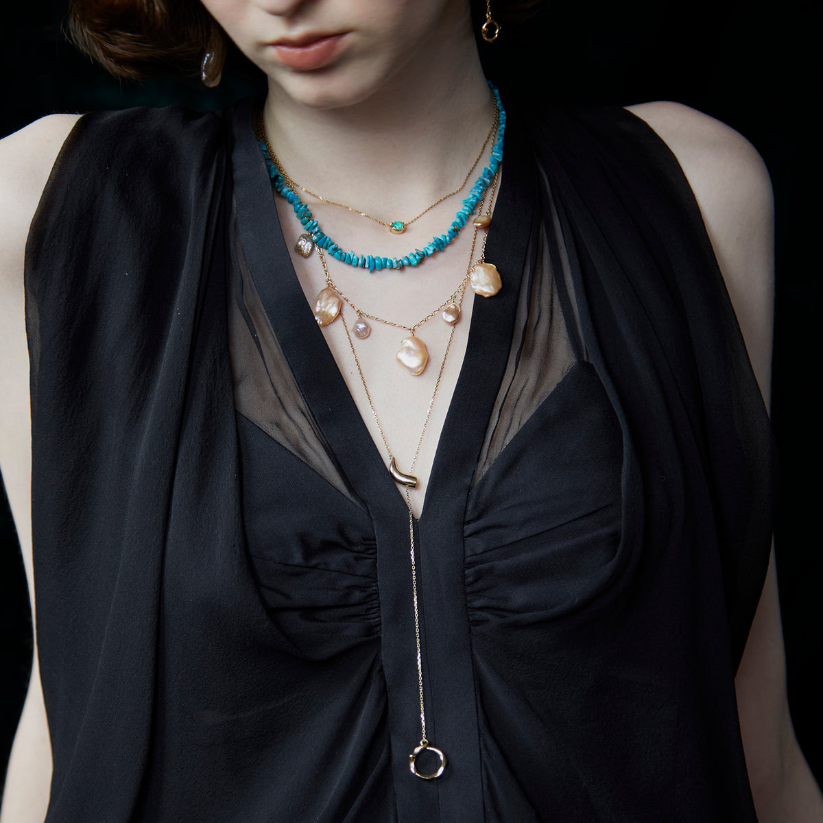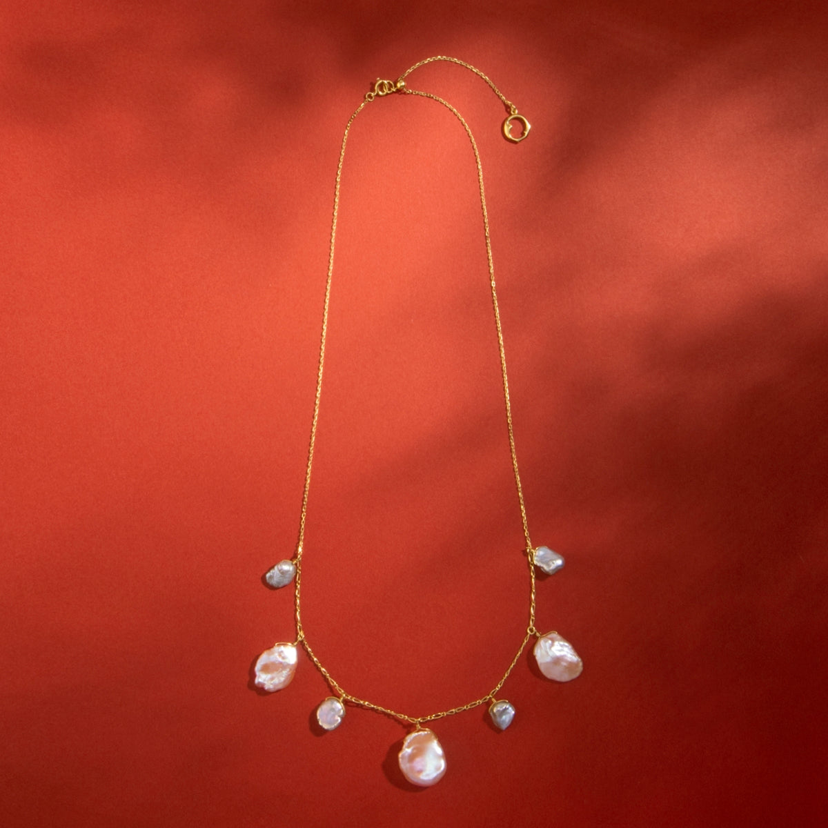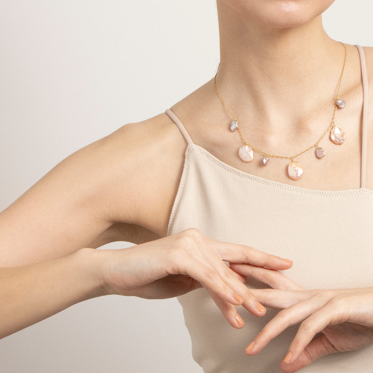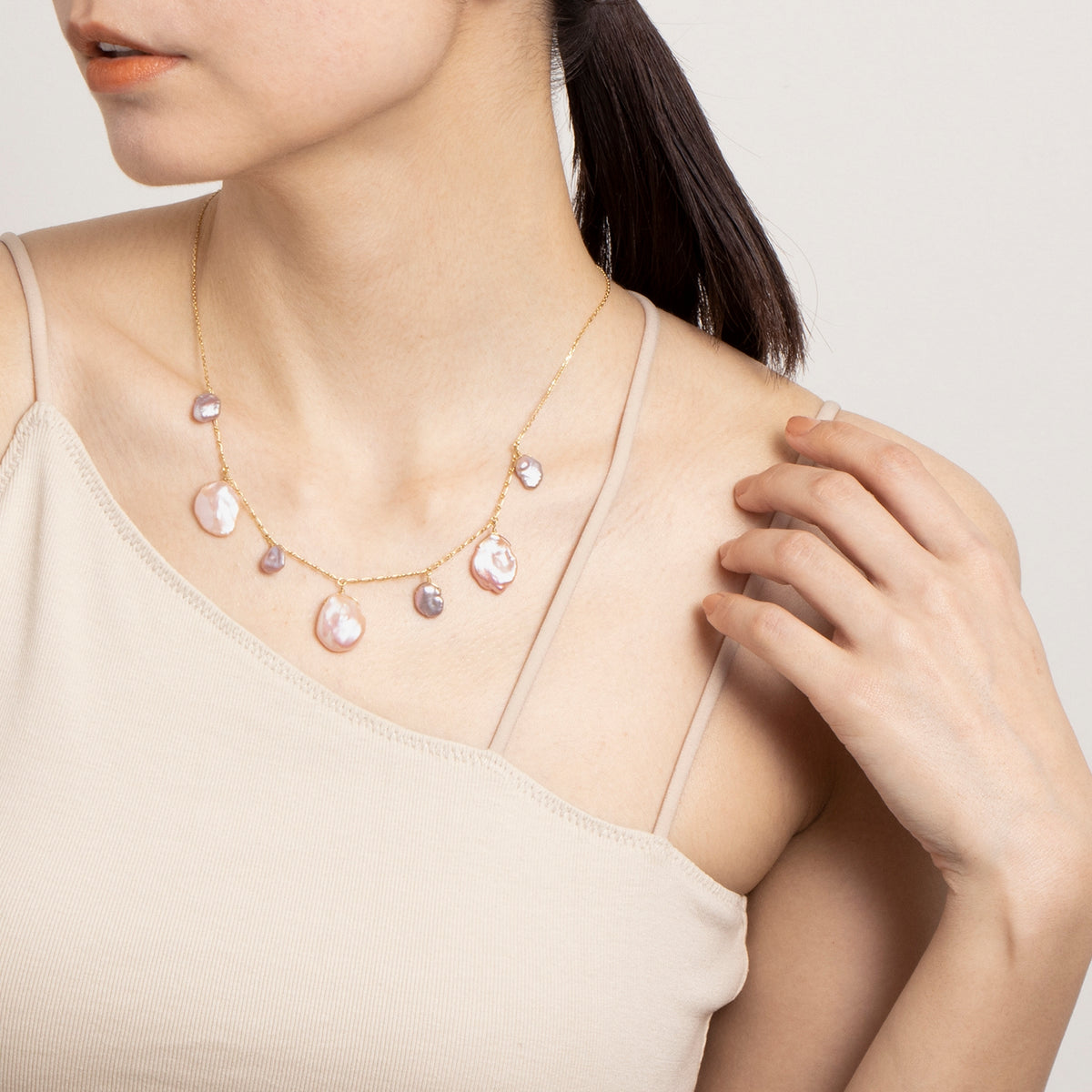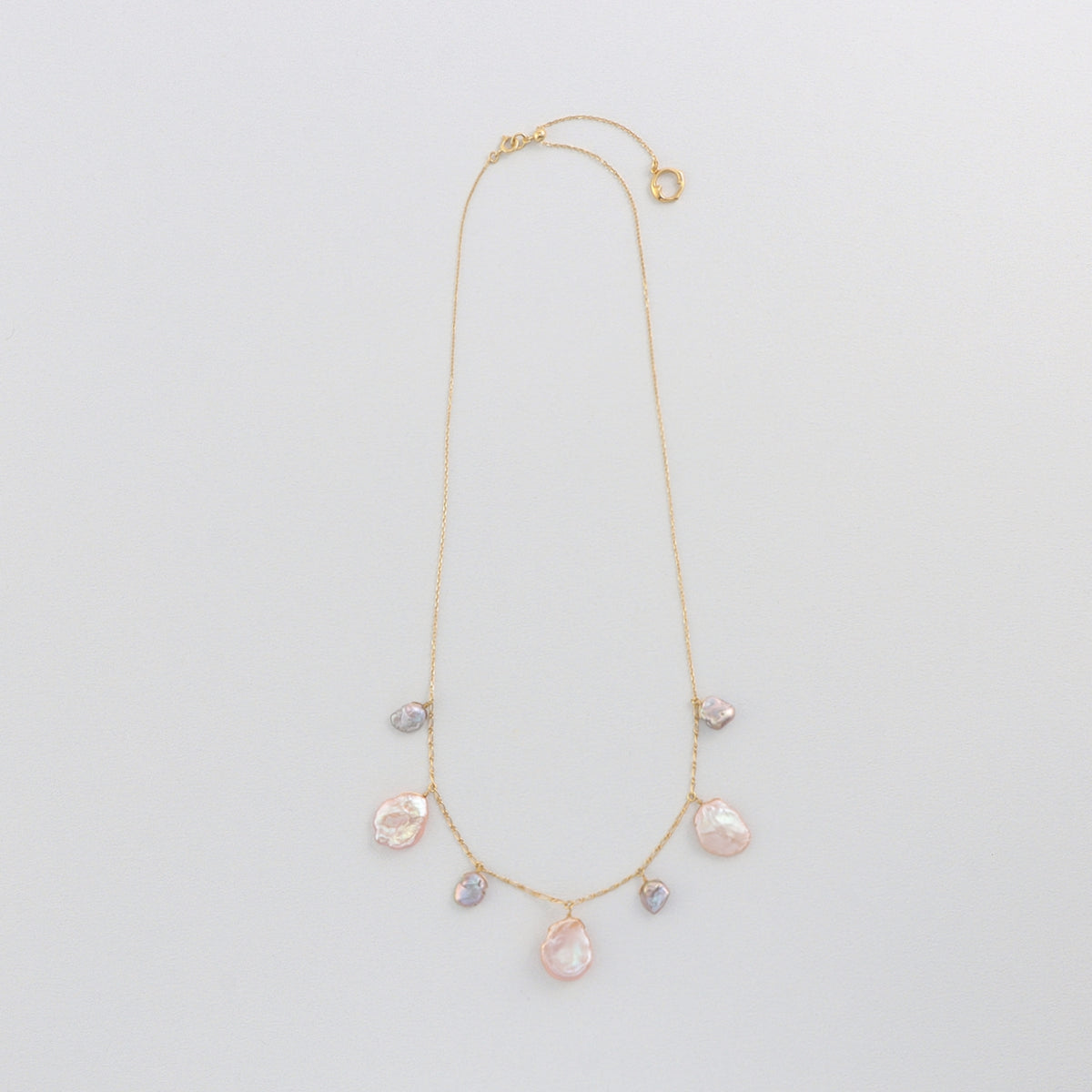 愛と美の女神、アフロディーテと共に生まれた薔薇の神話から着想した、ナチュラルなフォルムのパールを花びらに見立てた優雅なネックレス。ほんのり蒸気した頬のような優しいピンクカラーが、首元に艶やかな彩りをもたらします。お好きな長さで調節できるスライドアジャスターチェーンのエンドには、棘から着想したチャームをセッティング。美しいバックスタイルを演出します。