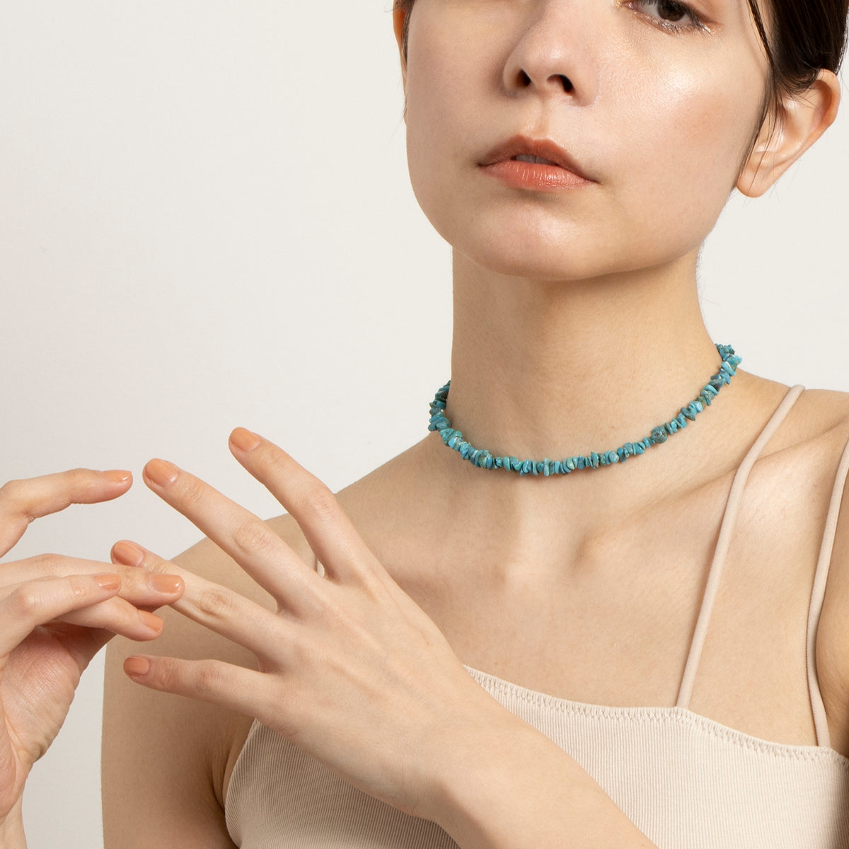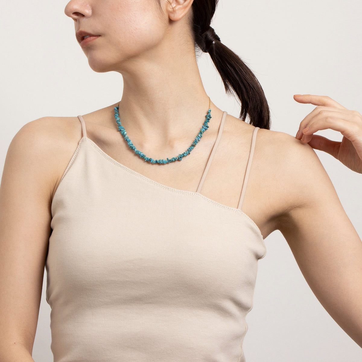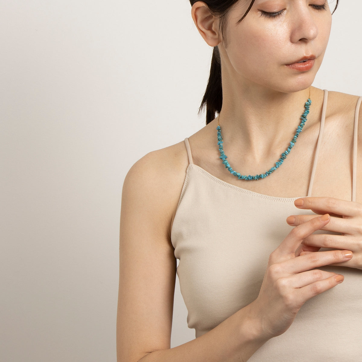 五感の季節を象徴する、鮮やかなさざれターコイズを連ねたスライドネックレス。晴れ渡る空をイメージさせるターコイズブルーが、顔まわりに彩りとムードをもたらします。お好きな長さで調節できるスライドアジャスターチェーンのエンドには、棘から着想したチャームをセッティング。美しいバックスタイルを演出します。首元までスライドして、チョーカーとして着用するのもおすすめです。