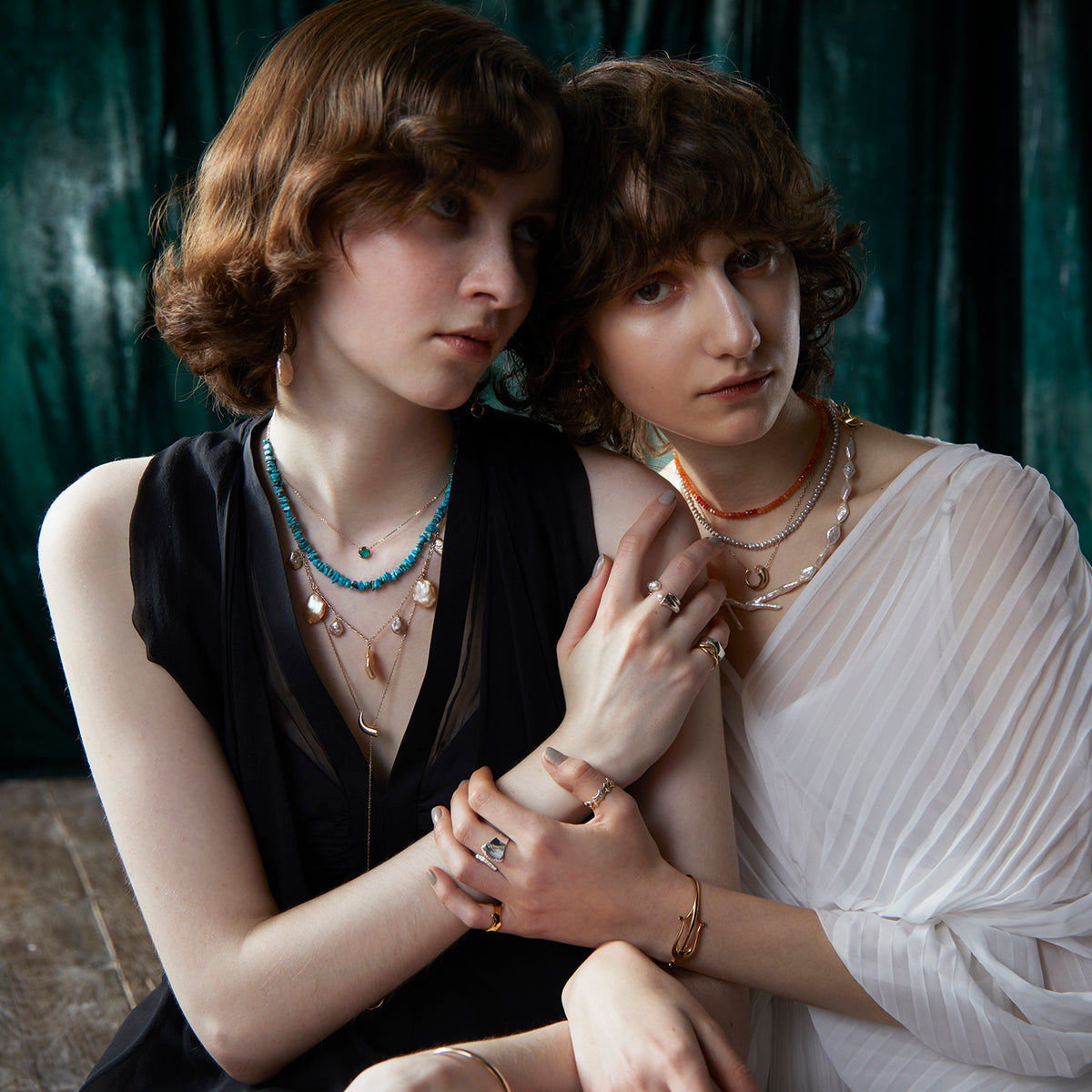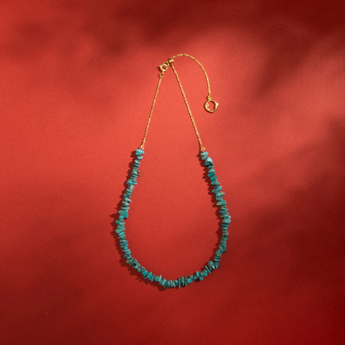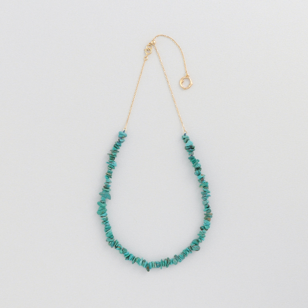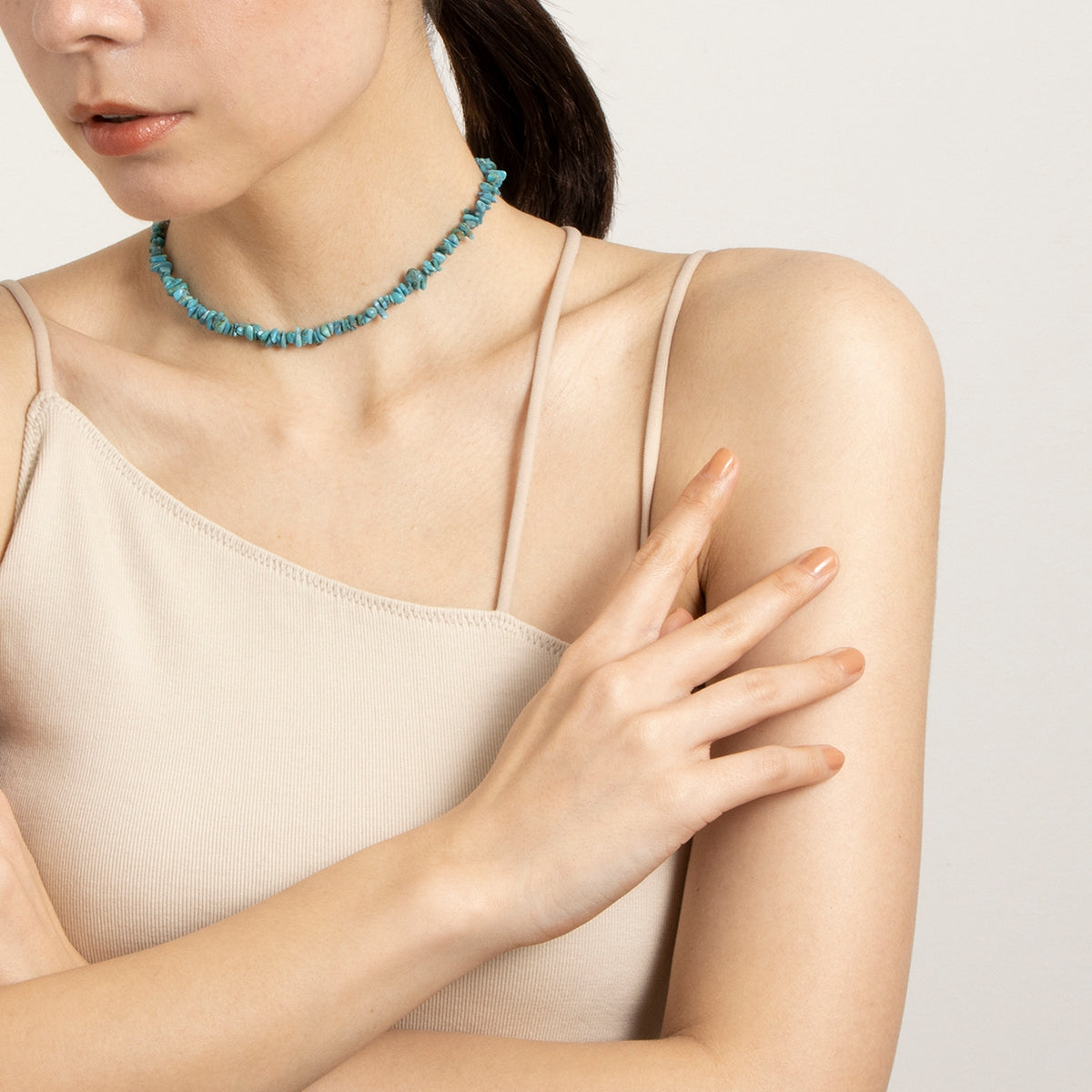五感の季節を象徴する、鮮やかなさざれターコイズを連ねたスライドネックレス。晴れ渡る空をイメージさせるターコイズブルーが、顔まわりに彩りとムードをもたらします。お好きな長さで調節できるスライドアジャスターチェーンのエンドには、棘から着想したチャームをセッティング。美しいバックスタイルを演出します。首元までスライドして、チョーカーとして着用するのもおすすめです。