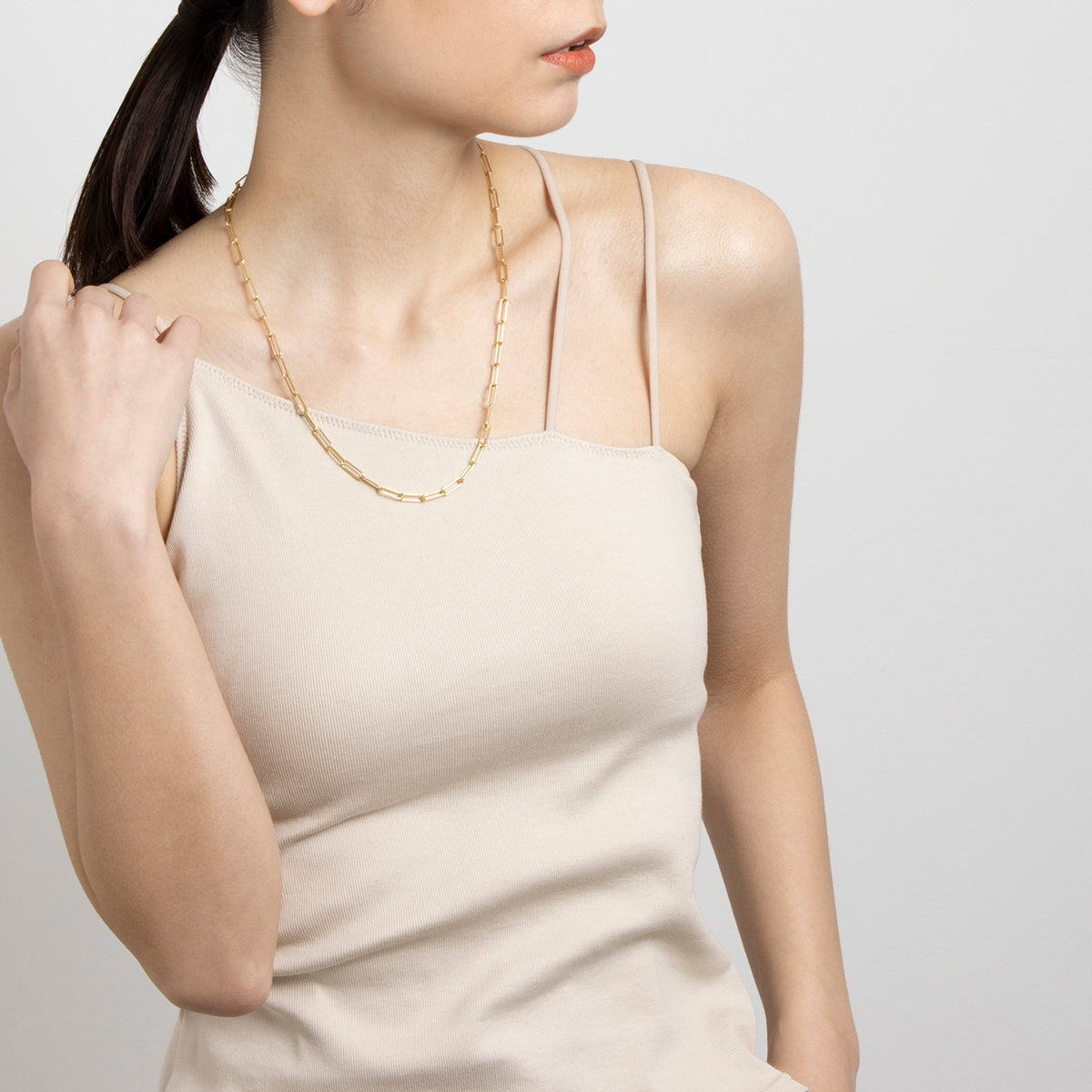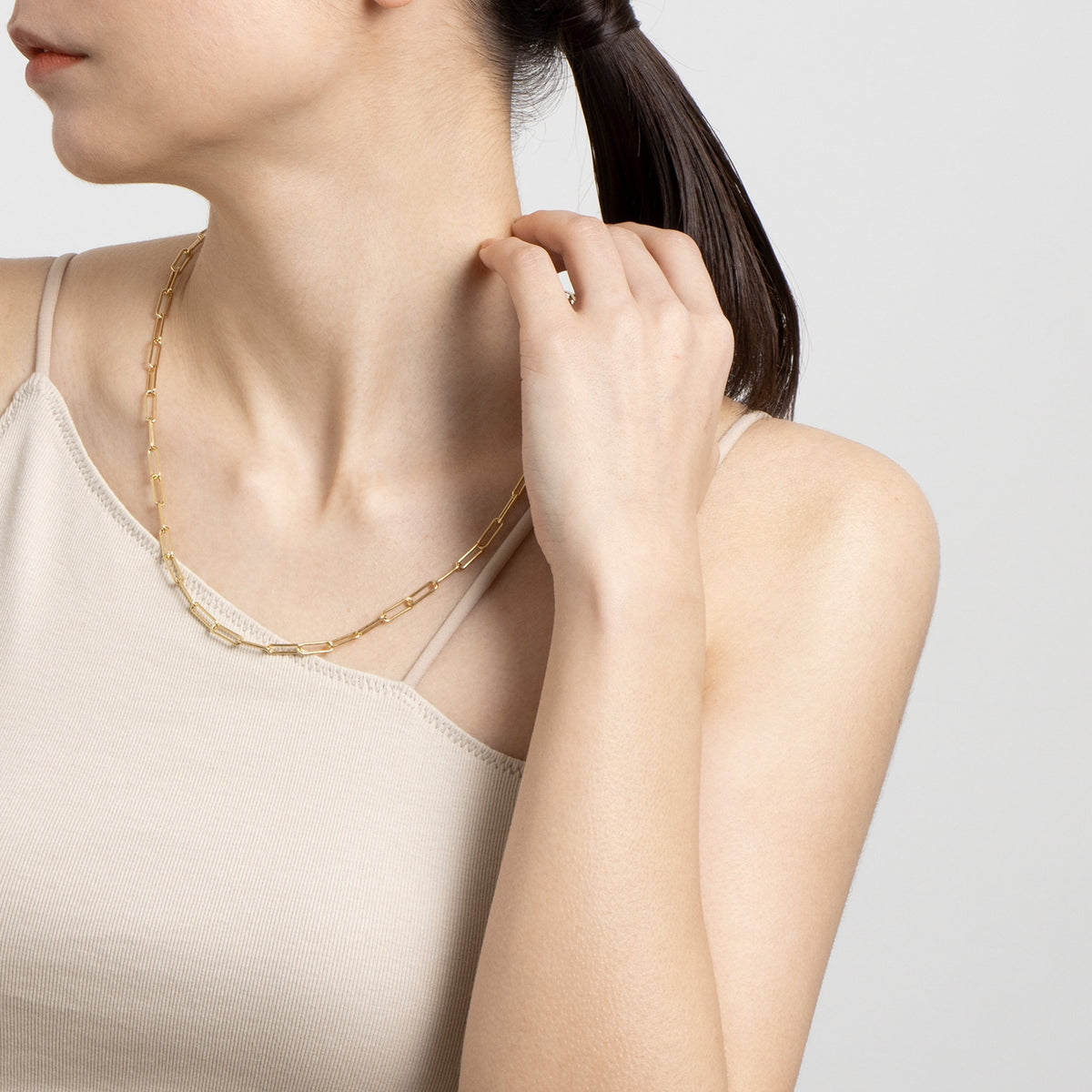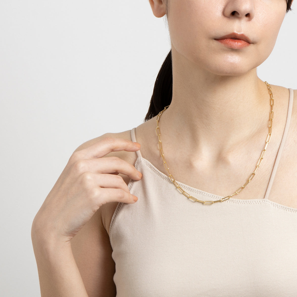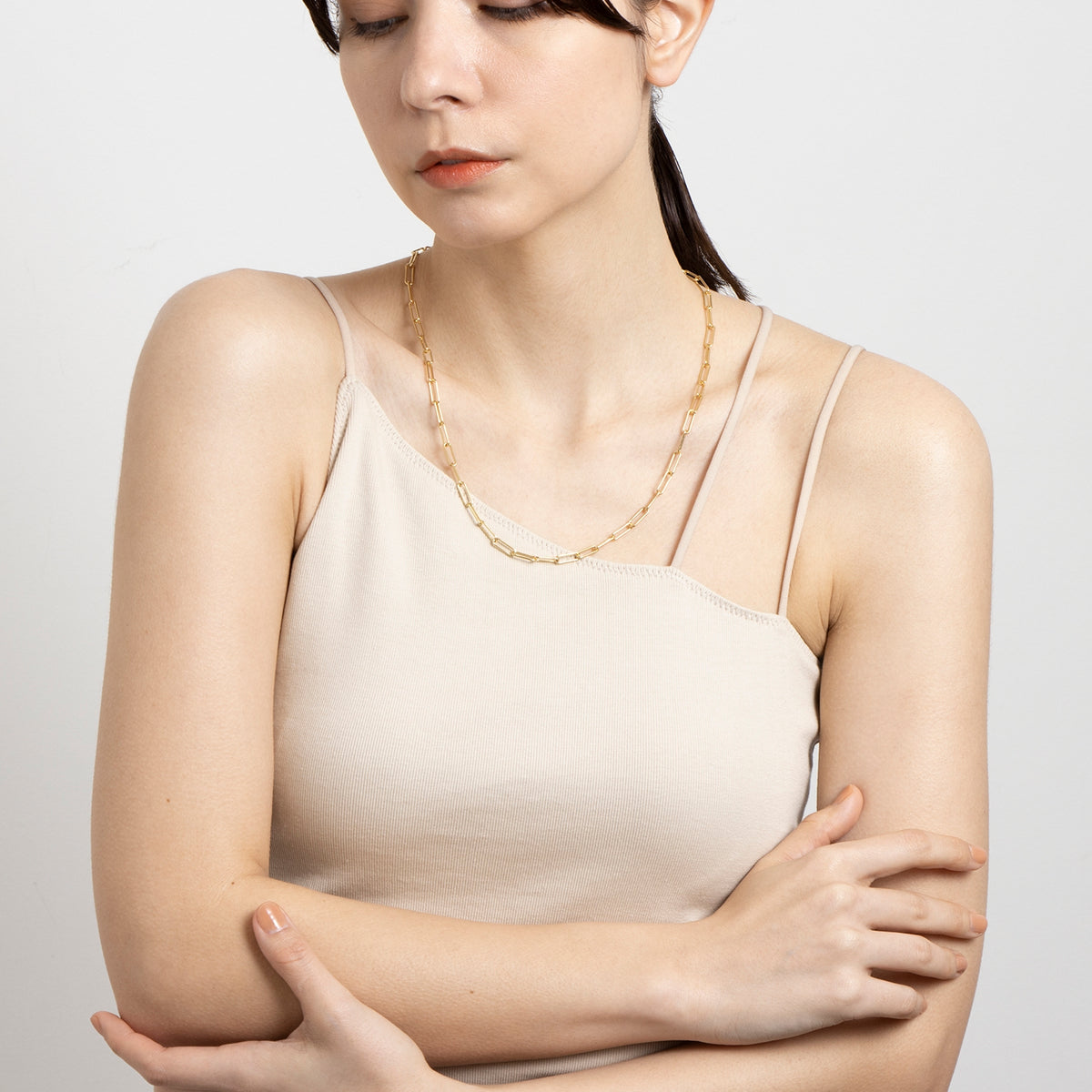 ボリューム感がありながら軽やかさを感じさせてくれる、1本で着け映えのするチェーンネックレス。 別売りのチャームと組み合わせて自分だけのアレンジを楽しめます。スタイリングに合わせやすい55cmの長さもポイント。 お好きな位置のコマで着用いただくことで長さ調整が可能です。先端のコマにチャームを下げ、Y字シルエットのスタイリングもおすすめ。