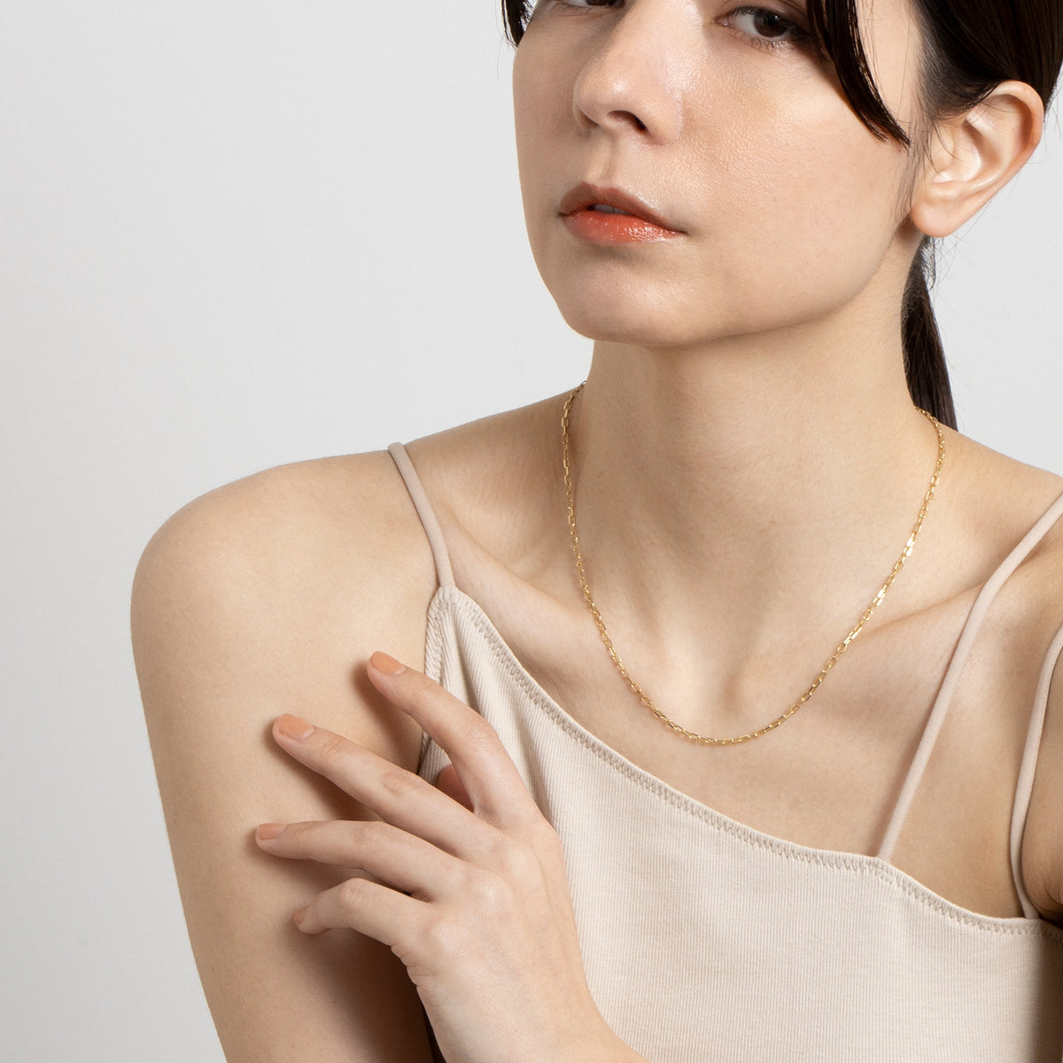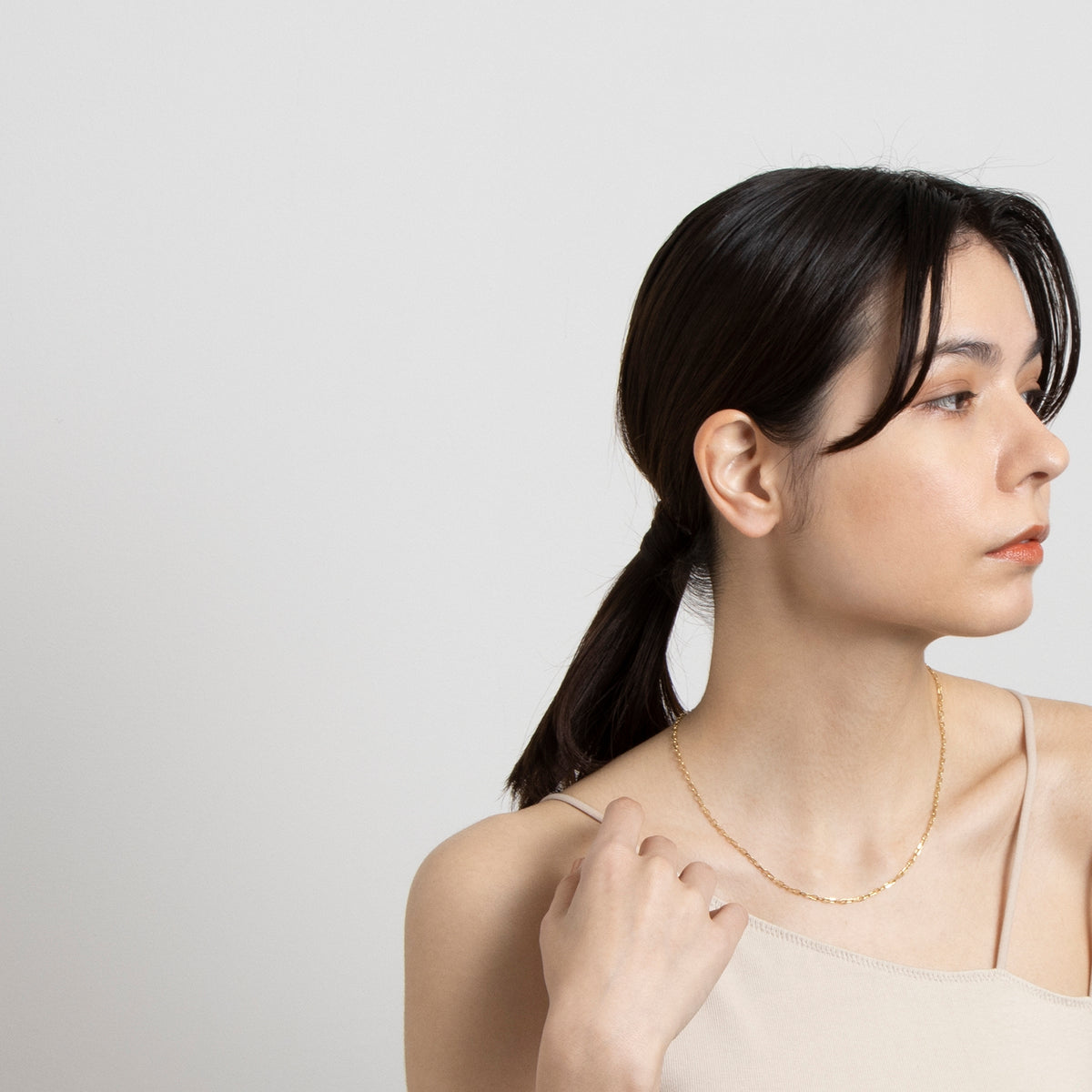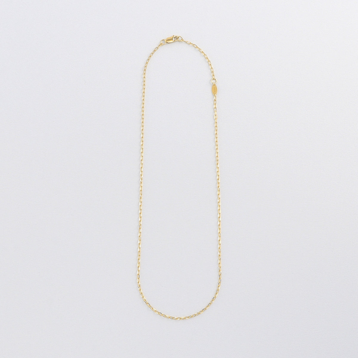 美しくカットを施されたチェーンコマの一つ一つが動くたびにきらめく、シンプルながら存在感を放つチェーン。 別売りのチャームと組み合わせて、ペンダントとしても使いやすい50cmの長さに設定。 デイリーなスタイリングに合わせやすい、ユースフルなチェーンです。
