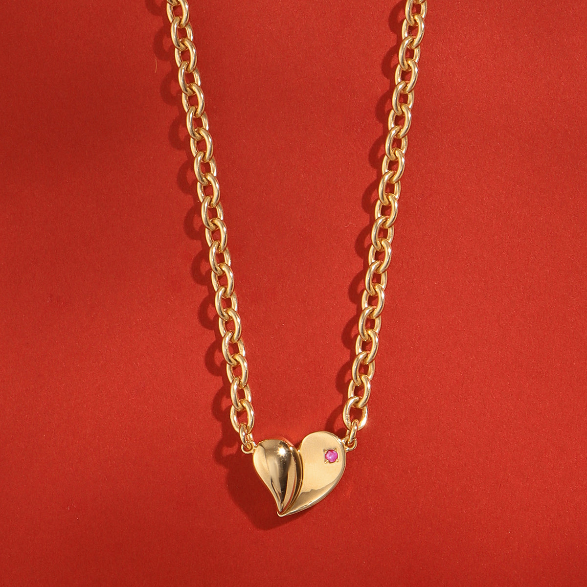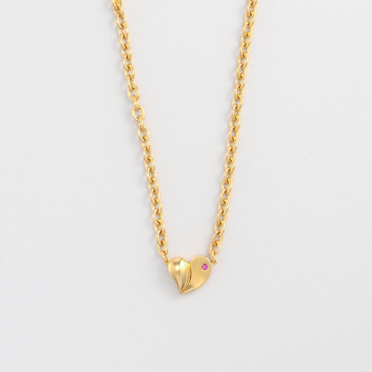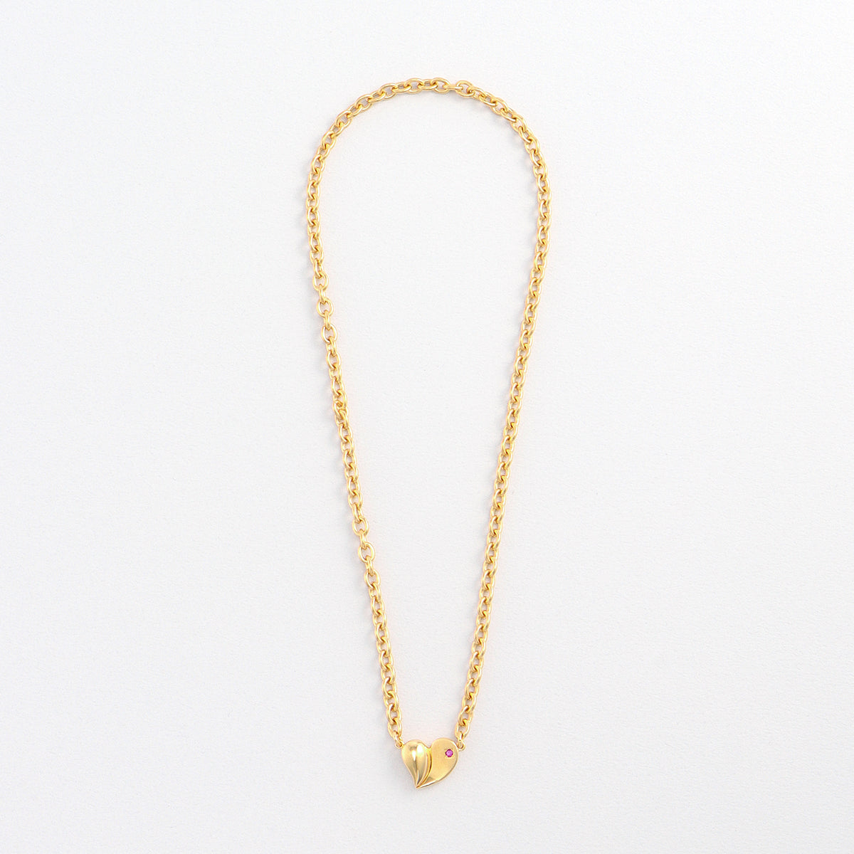 「感情」を司る水のエレメントから着想した、印象的なハートモチーフネックレス。 ハートモチーフに蠍座の一等星・アンタレスをイメージした煌めくルビーをセッティングし、スマートなシルエットを叶えるマグネットクラスプにアレンジ。磨き上げられた地金面とリバーシブルでお使いいただけます。程よいボリューム感のチェーンとクールなハートモチーフが旬のスタイリングを叶えてくれます。