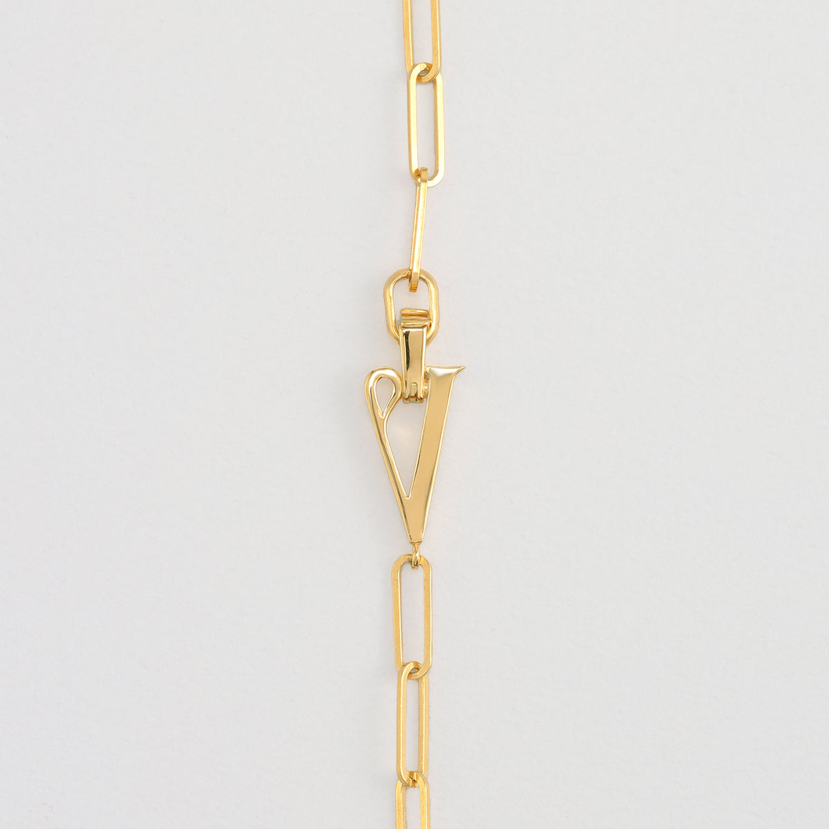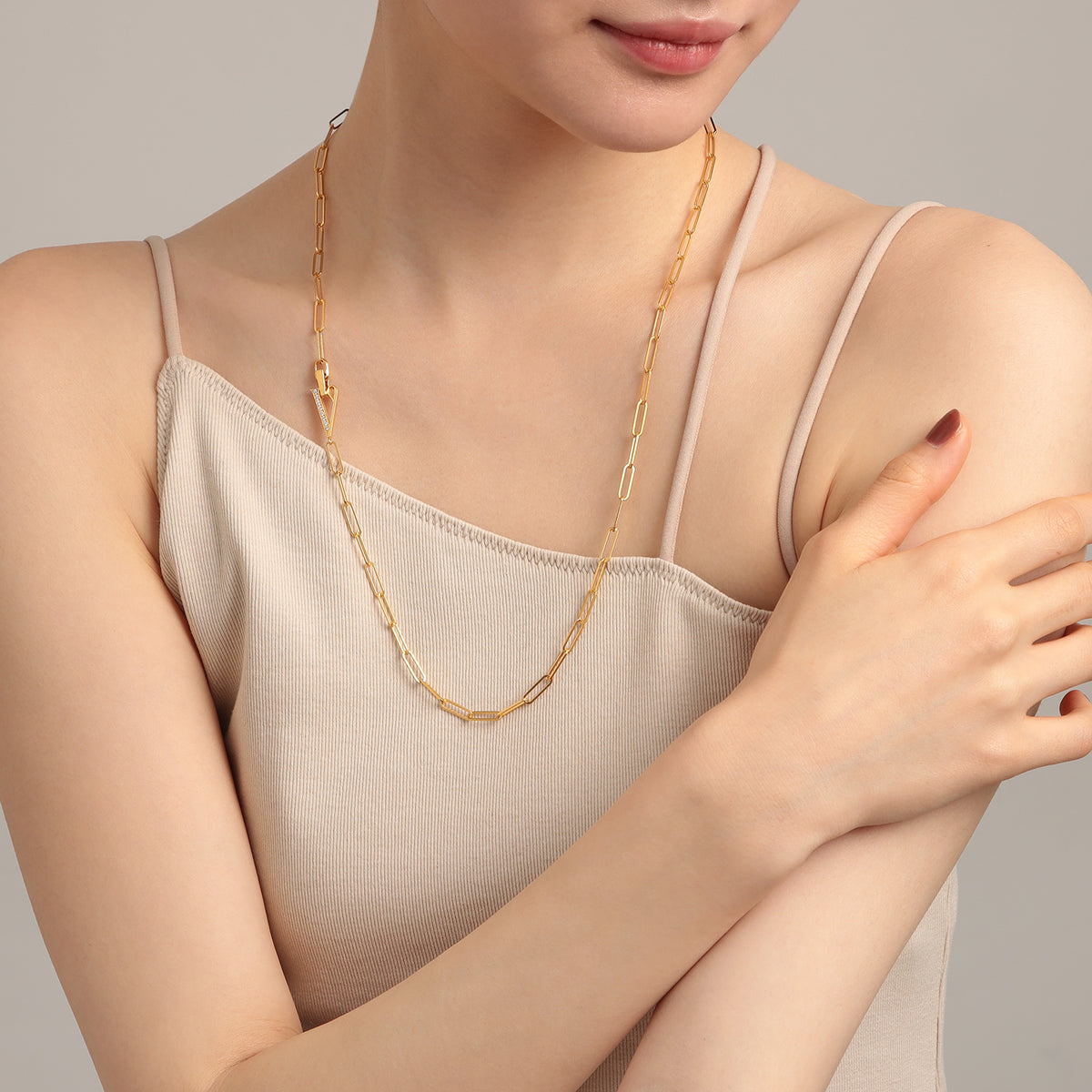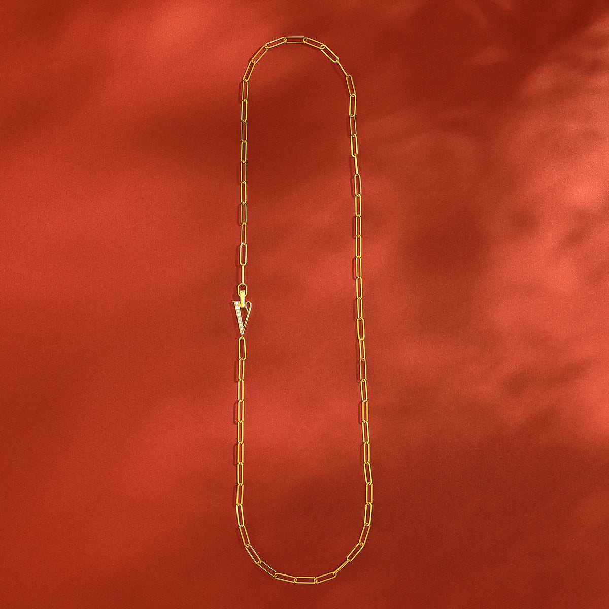 2024SSシーズンテーマ<PRISM>の世界観を体現したシンボリックなコレクション。古くより神秘的な形として存在してきた三角形のフォルムをブランドロゴであるVで表現。ロゴクラスプにセッティングされたキュービックジルコニアの輝きとシャープな地金のコントラストが軽やかで洗練されたムードを演出します。クラスプはお好きな位置のチェーンコマで着用することで長さ調整ができ、また同シリーズのネックレスやブレスレットと連結することでアレンジが広がります。ジェンダーフリーでスマートなシェアジュエリーとしてもおすすめ。一つの光が屈折し響き合うプリズムのように、プレイフルなスタイリングを楽しんで。
