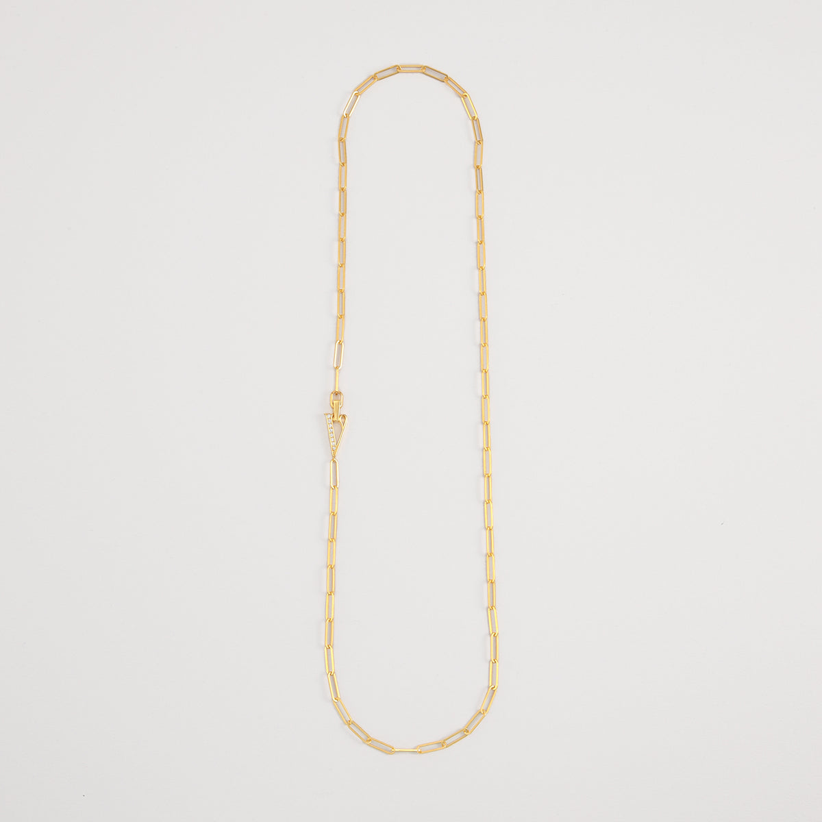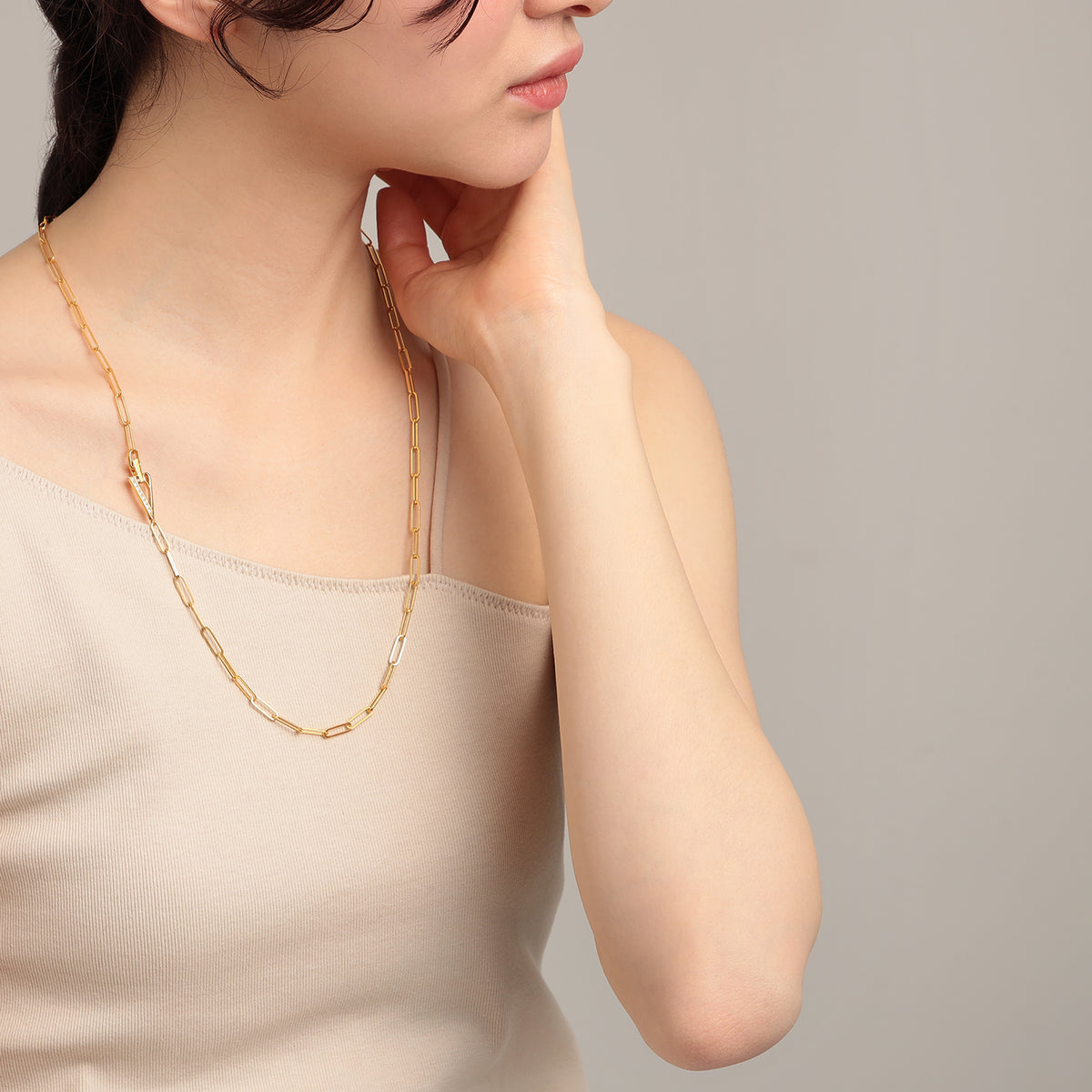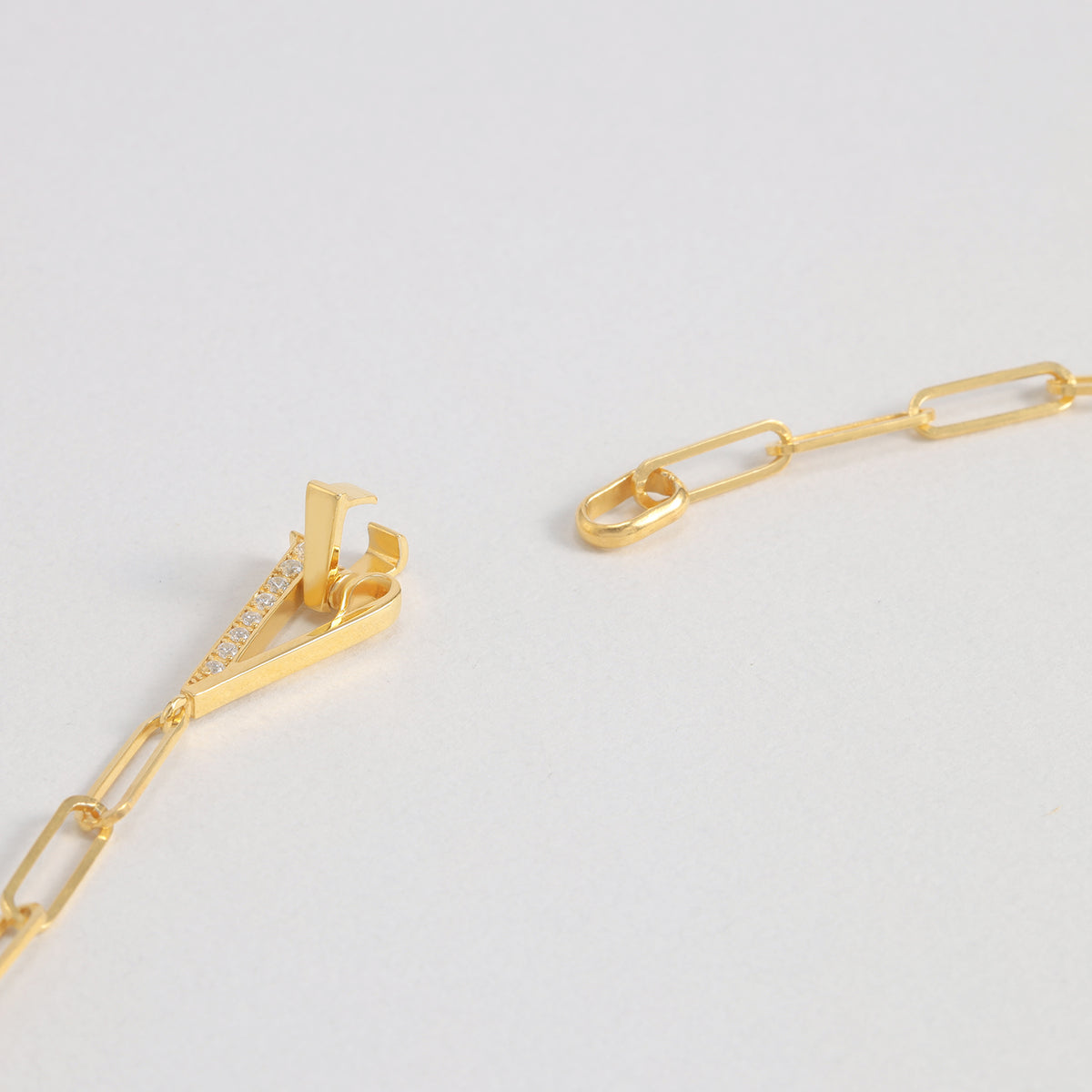 2024SSシーズンテーマ<PRISM>の世界観を体現したシンボリックなコレクション。古くより神秘的な形として存在してきた三角形のフォルムをブランドロゴであるVで表現。ロゴクラスプにセッティングされたキュービックジルコニアの輝きとシャープな地金のコントラストが軽やかで洗練されたムードを演出します。クラスプはお好きな位置のチェーンコマで着用することで長さ調整ができ、また同シリーズのネックレスやブレスレットと連結することでアレンジが広がります。ジェンダーフリーでスマートなシェアジュエリーとしてもおすすめ。一つの光が屈折し響き合うプリズムのように、プレイフルなスタイリングを楽しんで。