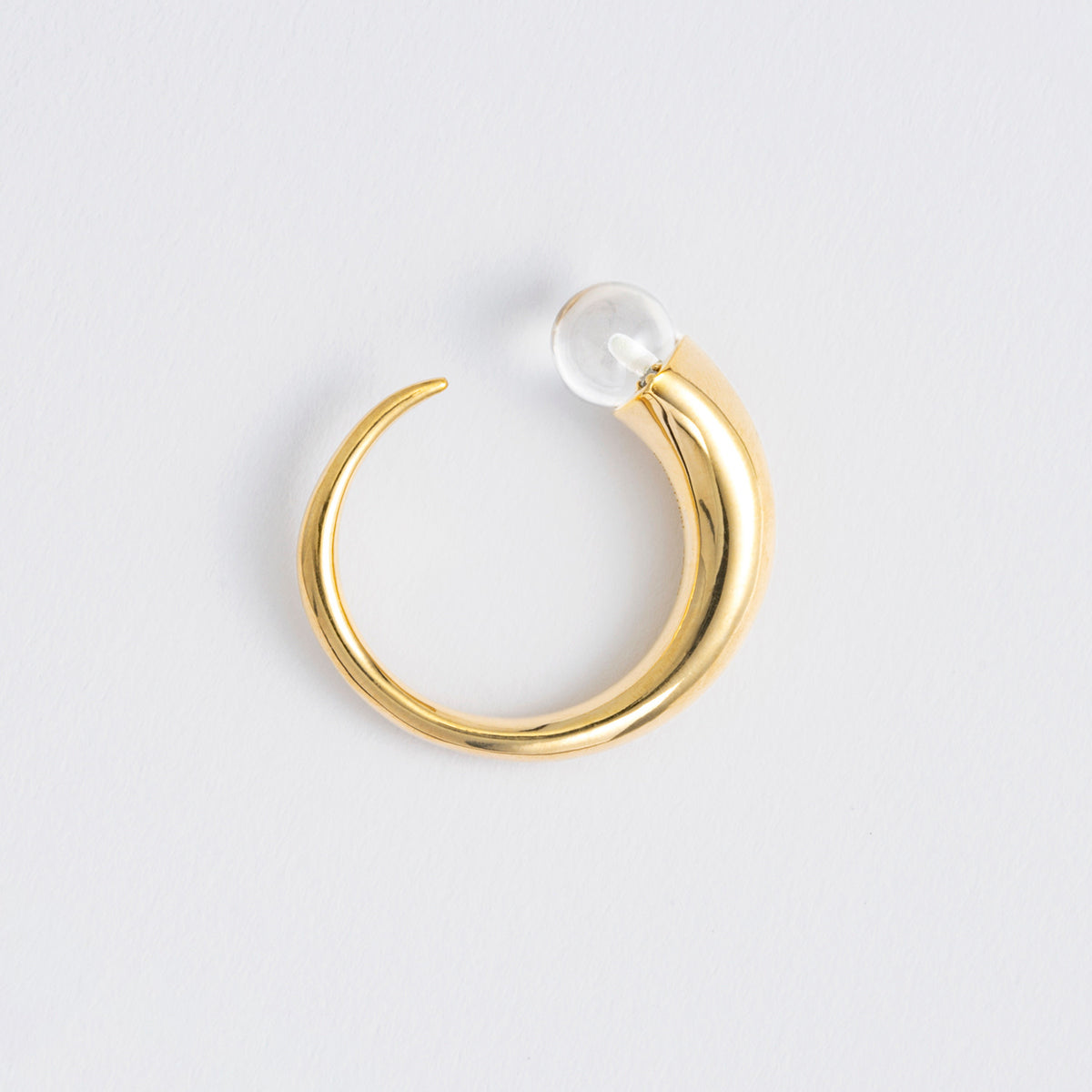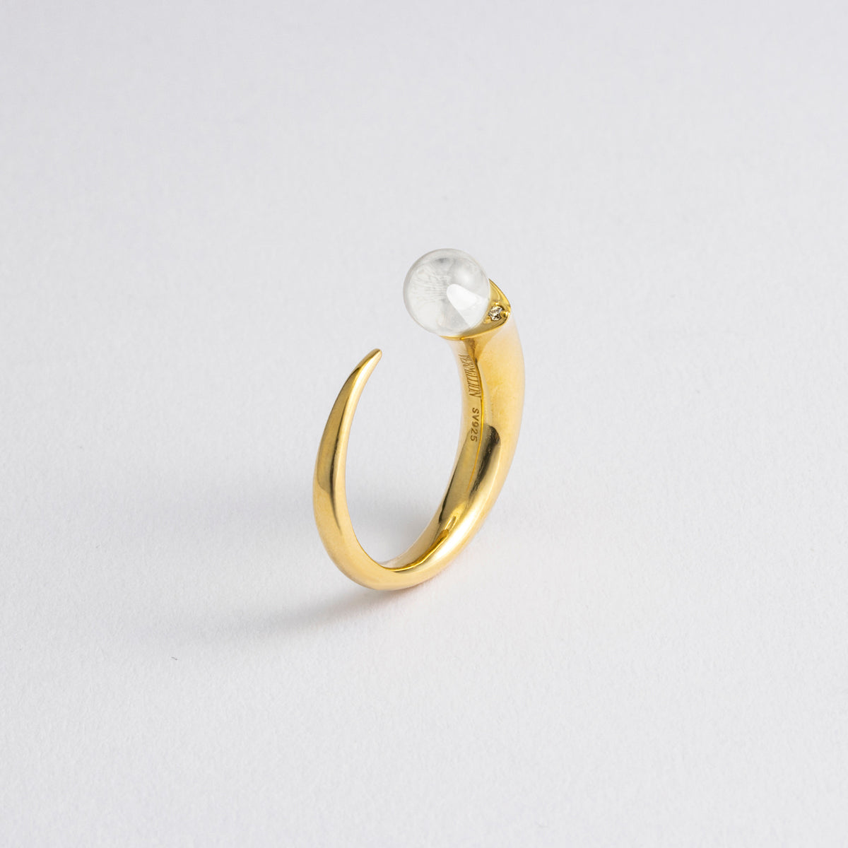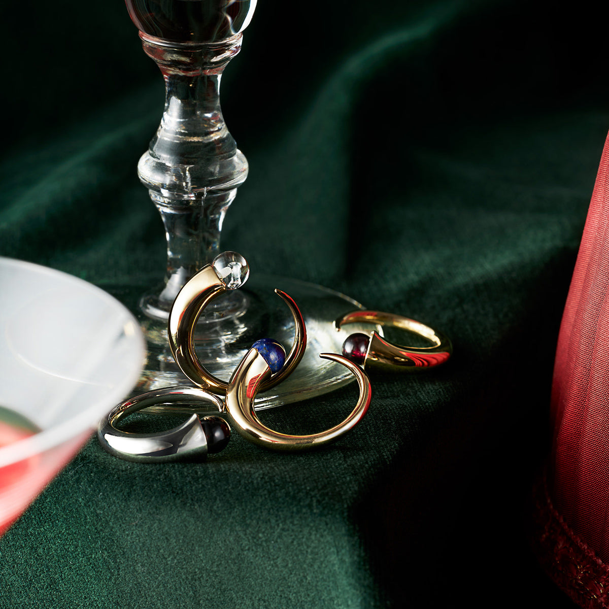 地金をたっぷりと使用したホーンモチーフはオブジェのように美しいカーブを描きながら光を放ち、宇宙を表すラウンドストーンは印象的なカラーバリエーションで心を彩ります。ストーンの両側に留めたブラウンダイヤモンドは自分だけのお守りのよう。互い違いにスタッキングすれば、一層ボリューム感のある表情を見せてくれます。自由な感性でオリジナルのカラーコーディネートをお楽しみください。クリエイティブなデザインのリングは性別を超え、新たな時代のペアジュエリーとしても存在感を放ちます。