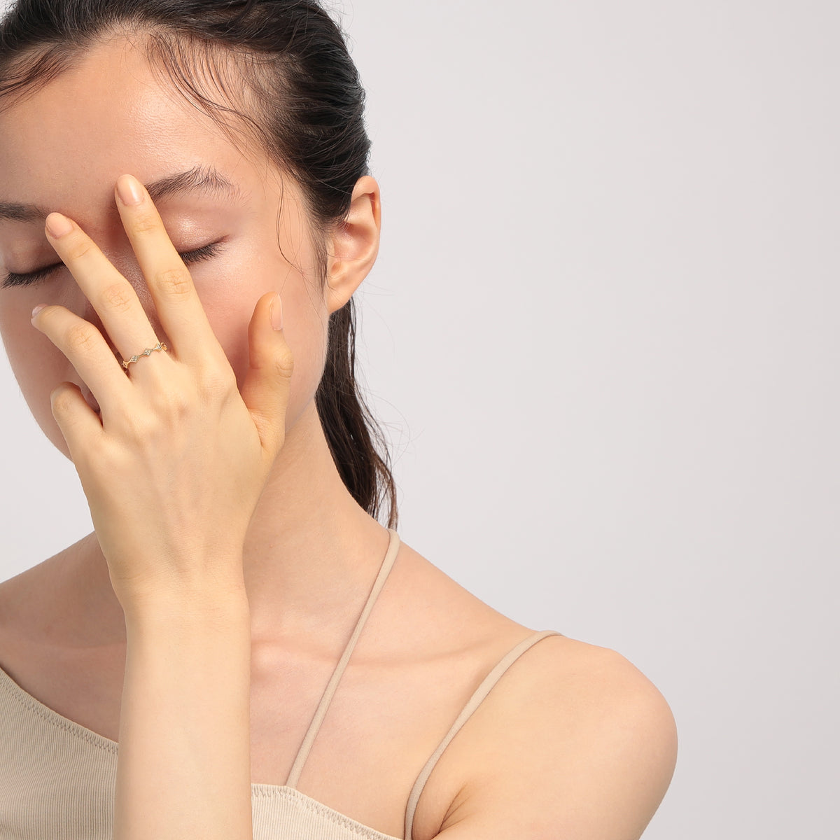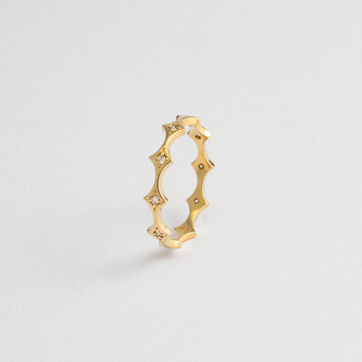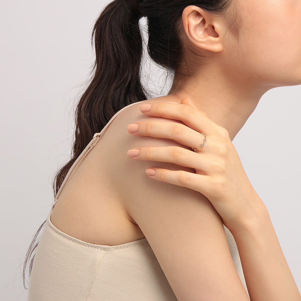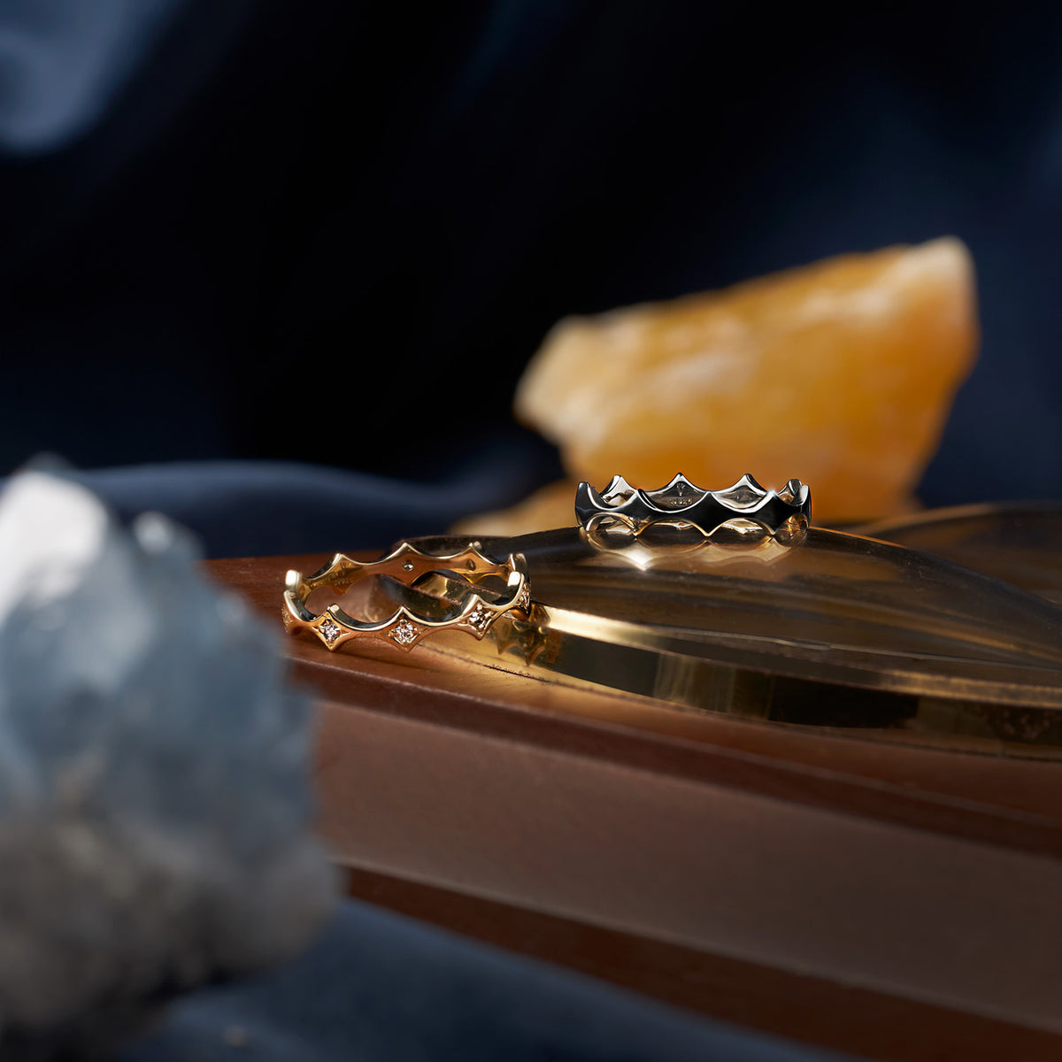 Clarus(クラルス)とは、最も明るい星を表す言葉。夜空に明るく輝く金星の光をモチーフにした煌めきが連なるデザインエタニティリングは、ふと手のひらが見えた時にも光のシルエットが美しさを感じさせてくれます。ラディアントな輝きのブラウンダイヤモンドが手元を明るく照らします。Orbeリングとのスタッキングコーディネートもおすすめです。