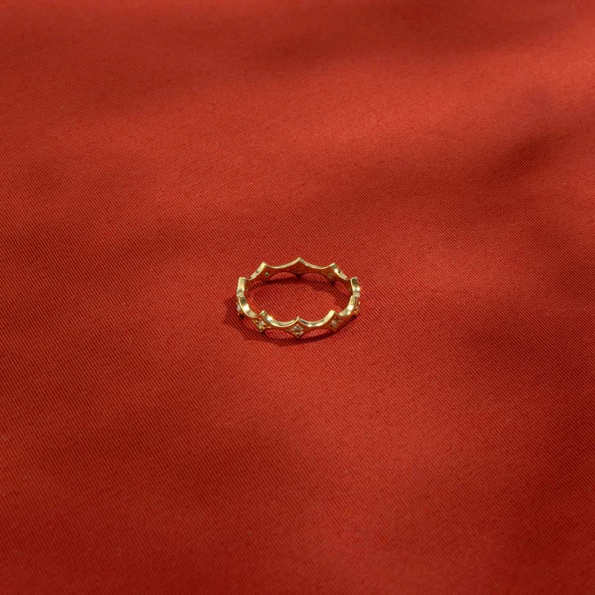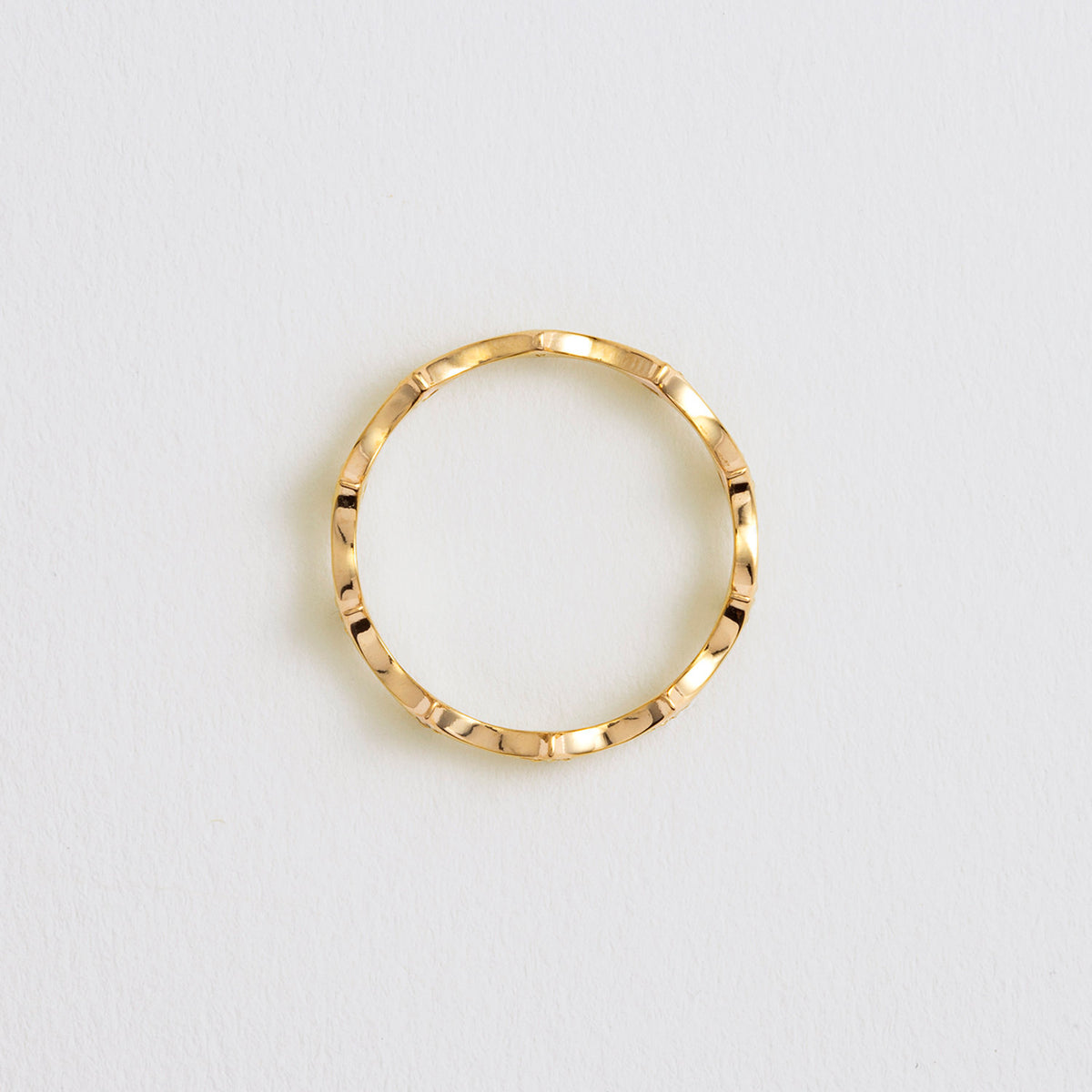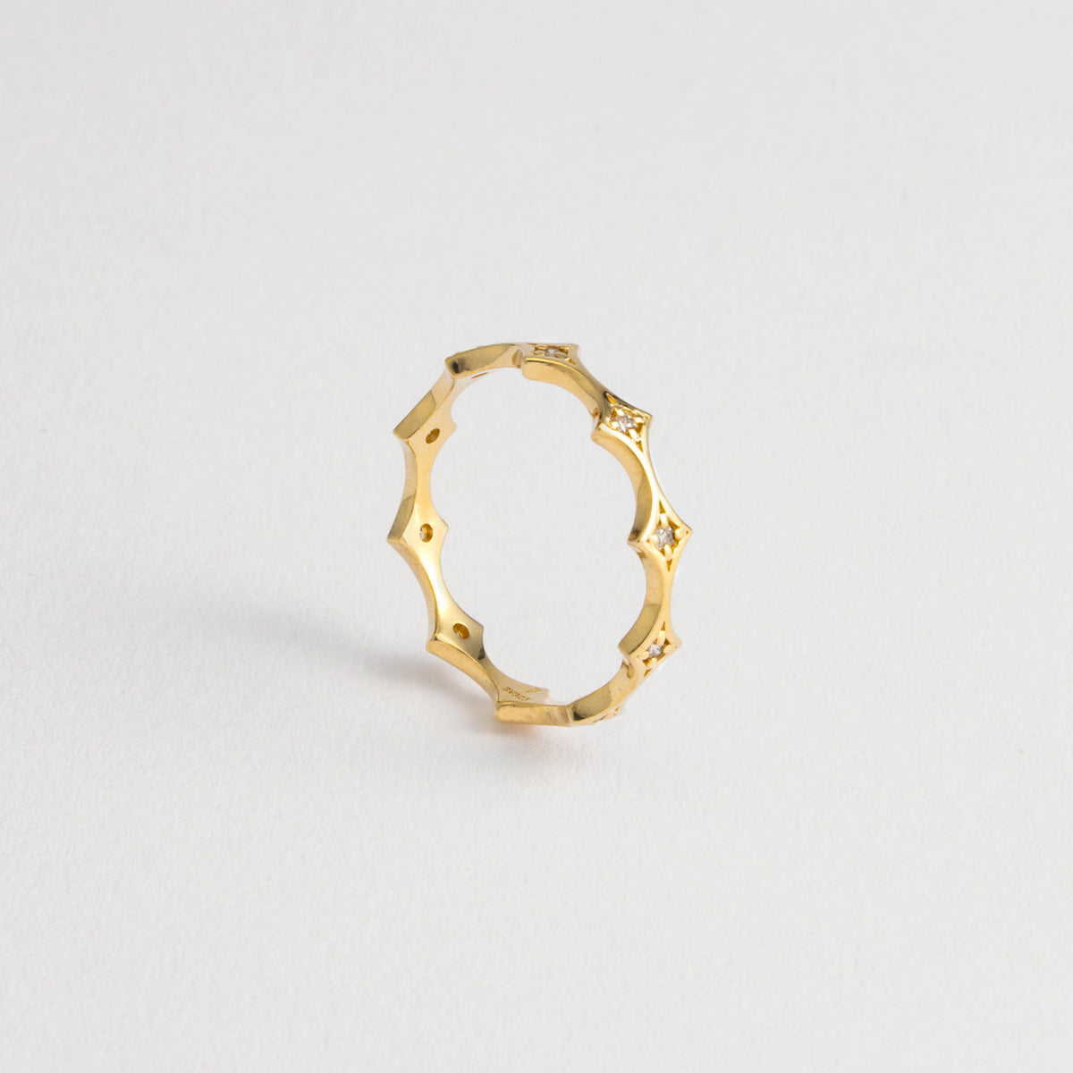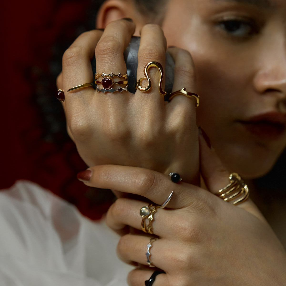 Clarus(クラルス)とは、最も明るい星を表す言葉。夜空に明るく輝く金星の光をモチーフにした煌めきが連なるデザインエタニティリングは、ふと手のひらが見えた時にも光のシルエットが美しさを感じさせてくれます。ラディアントな輝きのブラウンダイヤモンドが手元を明るく照らします。Orbeリングとのスタッキングコーディネートもおすすめです。