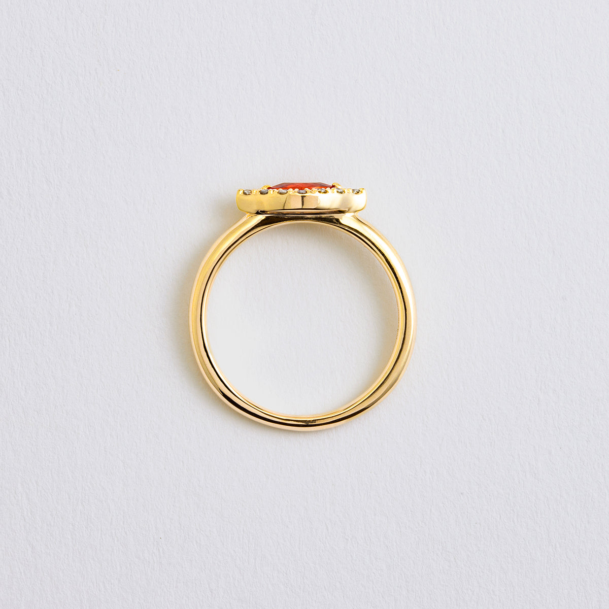 古来から富と幸運のサインと呼ばれる一等星、アルデバランをイメージしたリング。アルデバランとは、アラビア語で「後に続くもの 」という意味を持ち、牡牛座の目に位置することから「ブルズ・アイ」とも呼ばれます。オレンジ色に輝く星を、炎のようにきらめくファイアオパールで表現しました。取り巻くブラウンダイヤモンドはビビッドなオレンジカラーを引き立てながら華やかな光を放ち、存在感のあるデザインで明るくプレイフルな表情を演出してくれます。