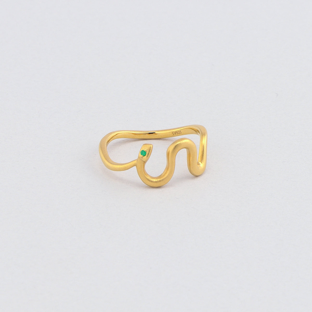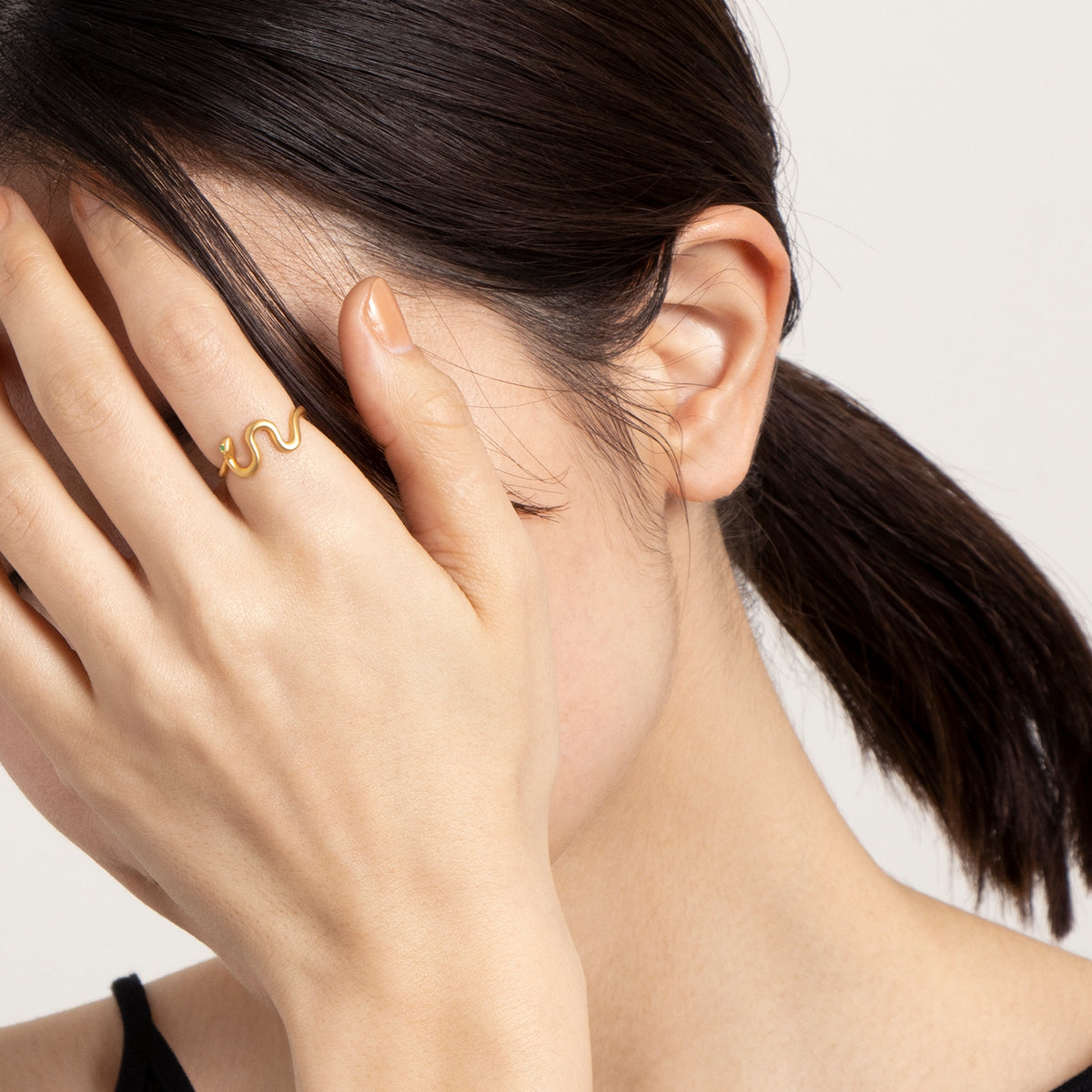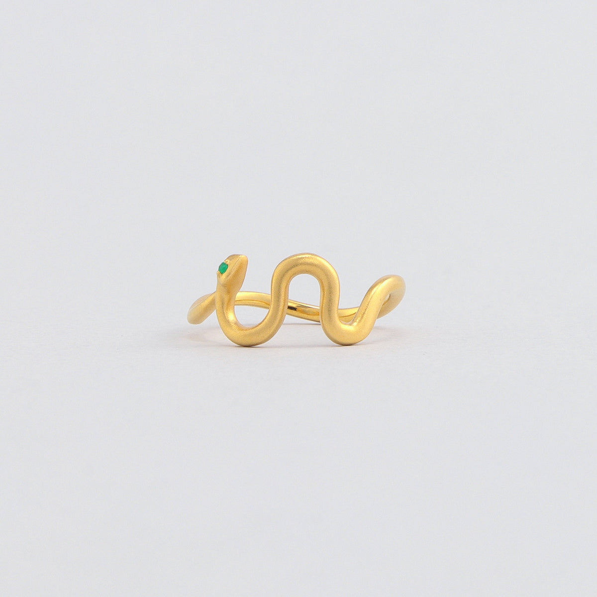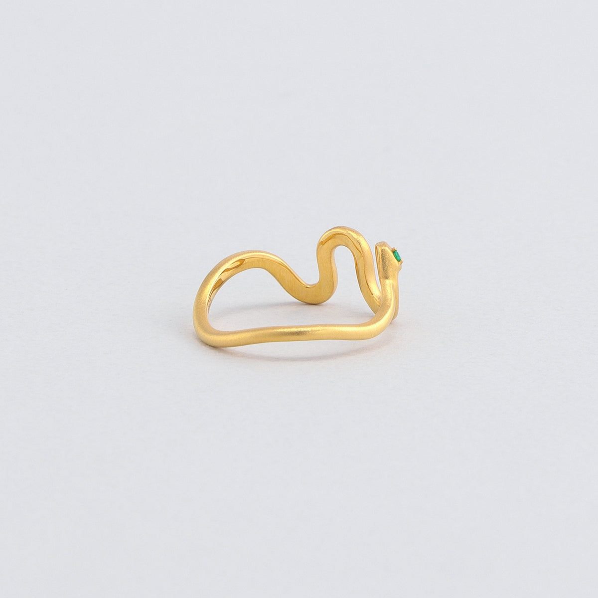 金色に輝く蛇がお守りのように指に寄り添うリング。目には鮮やかな発色が美しいエメラルドをあしらい、その透明感溢れるグリーンの光が優しい表情をたたえています。流れるようなラインを描く有機的なフォルムが印象的な手元を演出し、繊細でありながらも存在感を放ちます。古来より幸運や永遠の象徴とされてきた蛇モチーフ。金運や健康のお守りとしても人気のあるモチーフです。