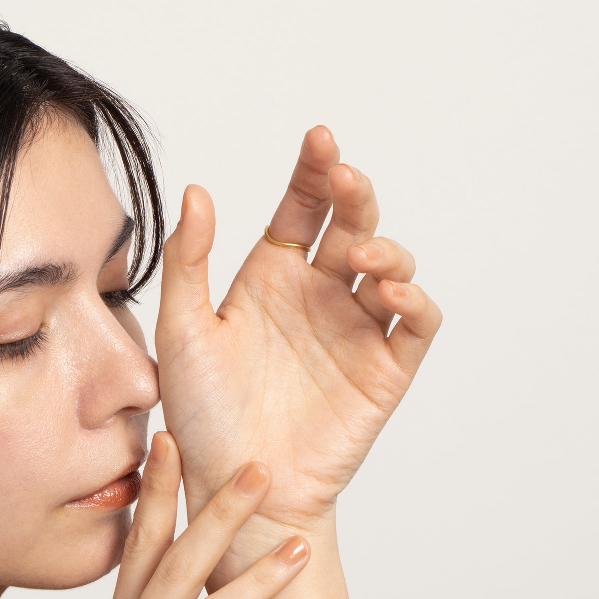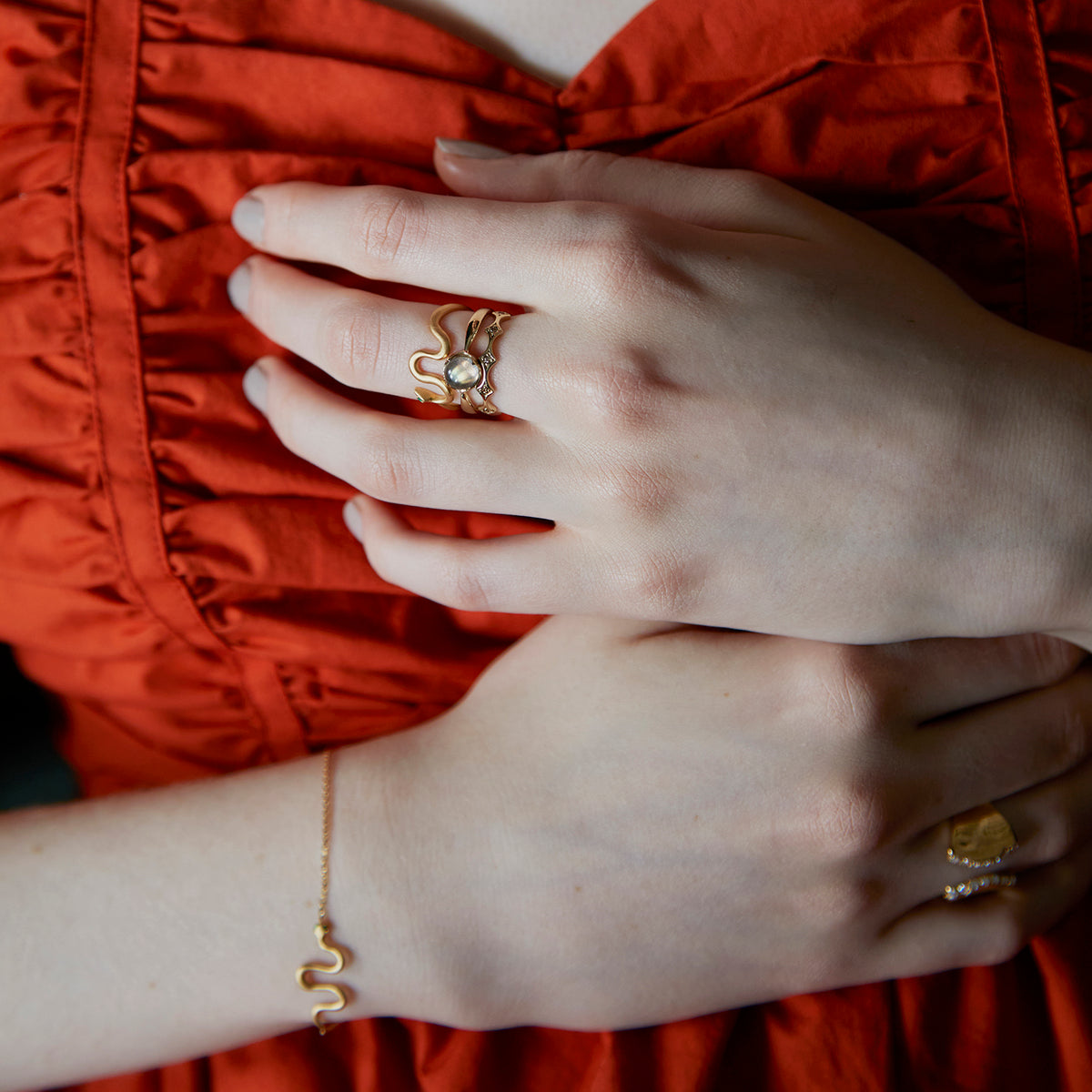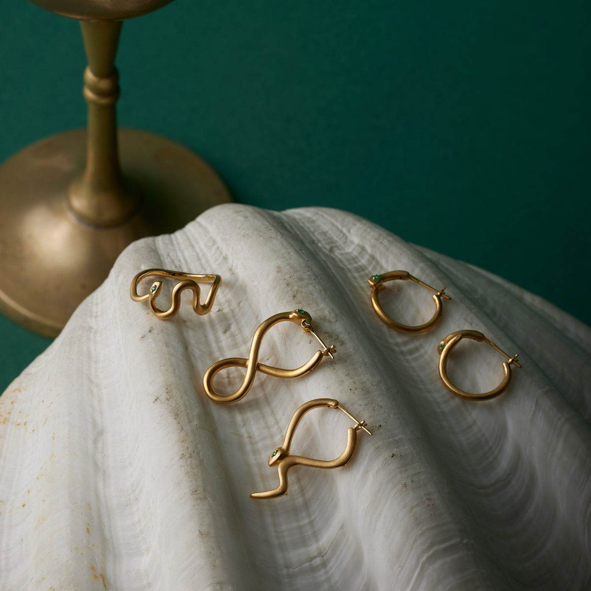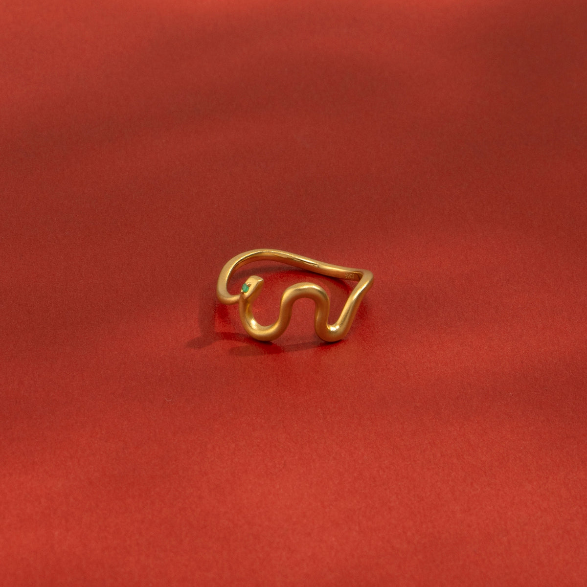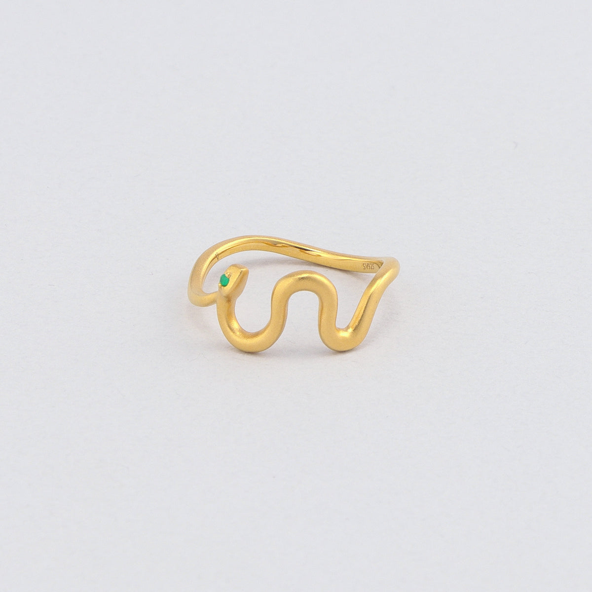 金色に輝く蛇がお守りのように指に寄り添うリング。目には鮮やかな発色が美しいエメラルドをあしらい、その透明感溢れるグリーンの光が優しい表情をたたえています。流れるようなラインを描く有機的なフォルムが印象的な手元を演出し、繊細でありながらも存在感を放ちます。古来より幸運や永遠の象徴とされてきた蛇モチーフ。金運や健康のお守りとしても人気のあるモチーフです。