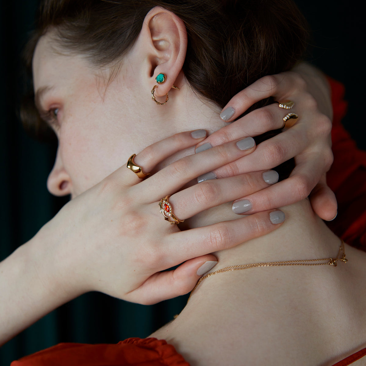 愛と美の象徴である薔薇。その薔薇の棘からインスパイアされた、少しエッジの効いた輝きが印象的な手元を演出するピンキーリング。艶やかに磨かれた地金の光沢、ふっくらとした丸みのあるフォルム、ぐるりと1周させた棘のデザインがどの角度から見ても美しさを感じる仕立てに。オブジェのような存在感を放ちながらも全ての角を丸く仕上げ、優しい着け心地で日々に寄り添うお守りリングです。