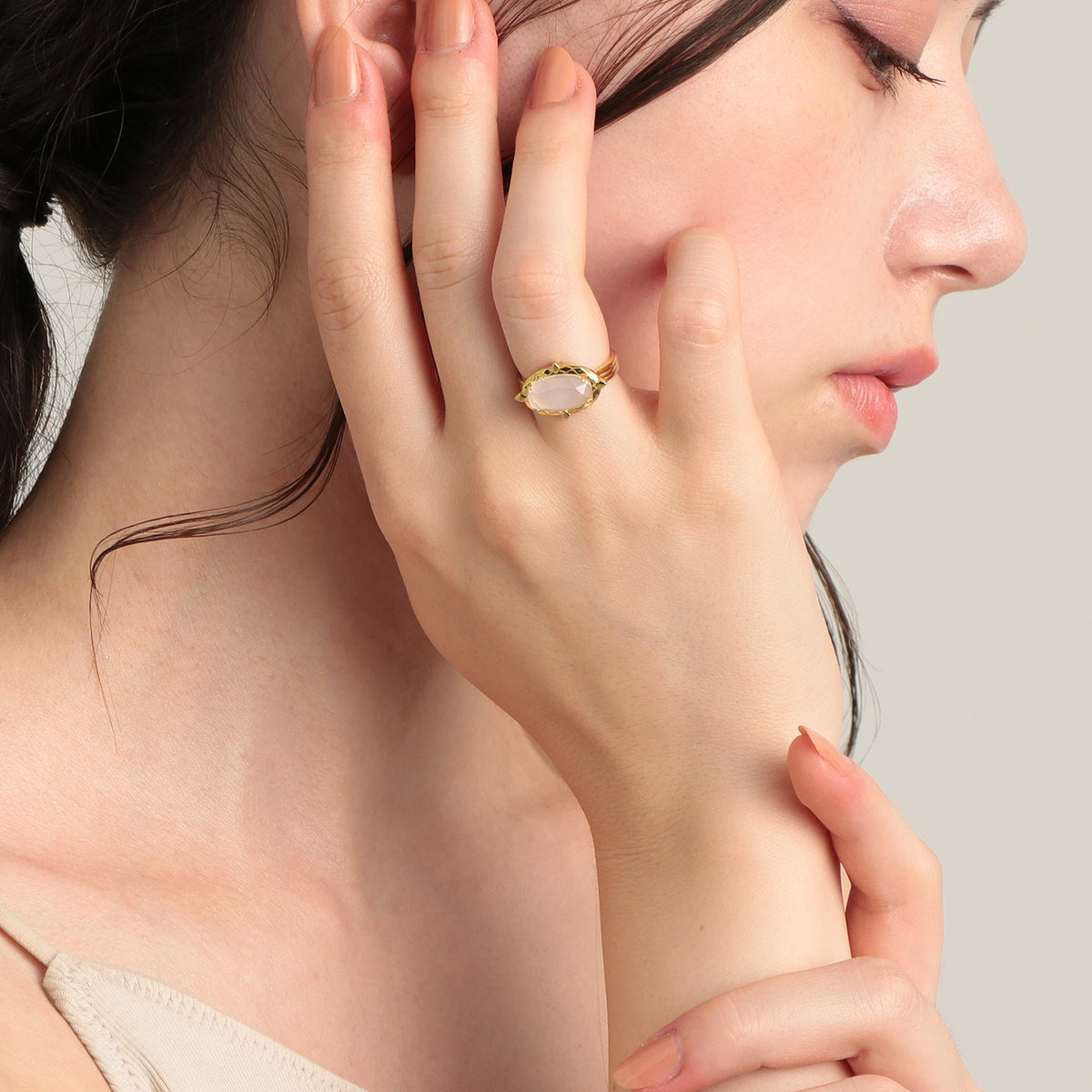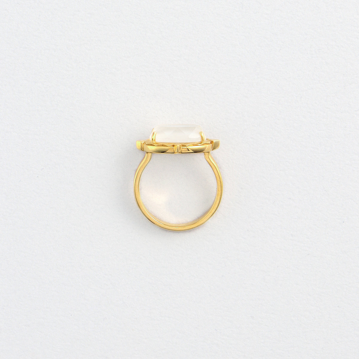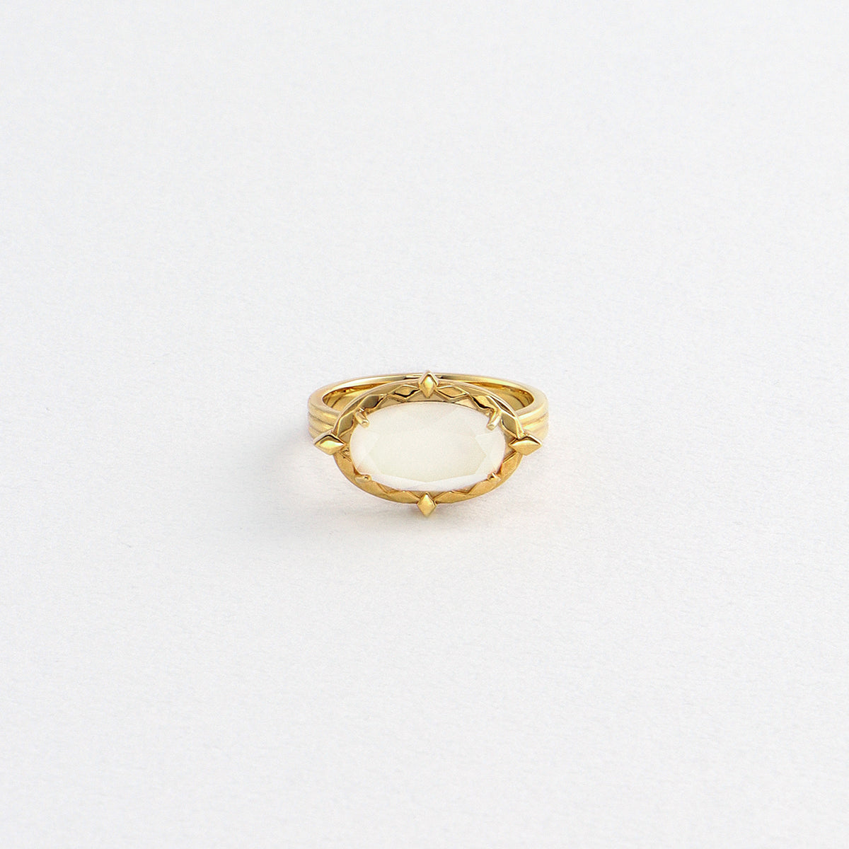 「感覚」を司る地のエレメントから着想した、大地のオーラを感じさせるストーンリング。潤んだような輝きをたたえるホワイトカルセドニーが手元に印象的な輝きをまとわせます。石座にデザインされた菱形の模様は、地中にある鉱物の結晶をイメージ。アームに施された3本の真っ直ぐなラインは地平線を表現しています。厚みのあるホワイトカルセドニーは、見る角度で白から半透明まで印象が変化し幻想的な雰囲気に。動きに合わせてきらめくファセットがお守りのように日々に寄り添います。