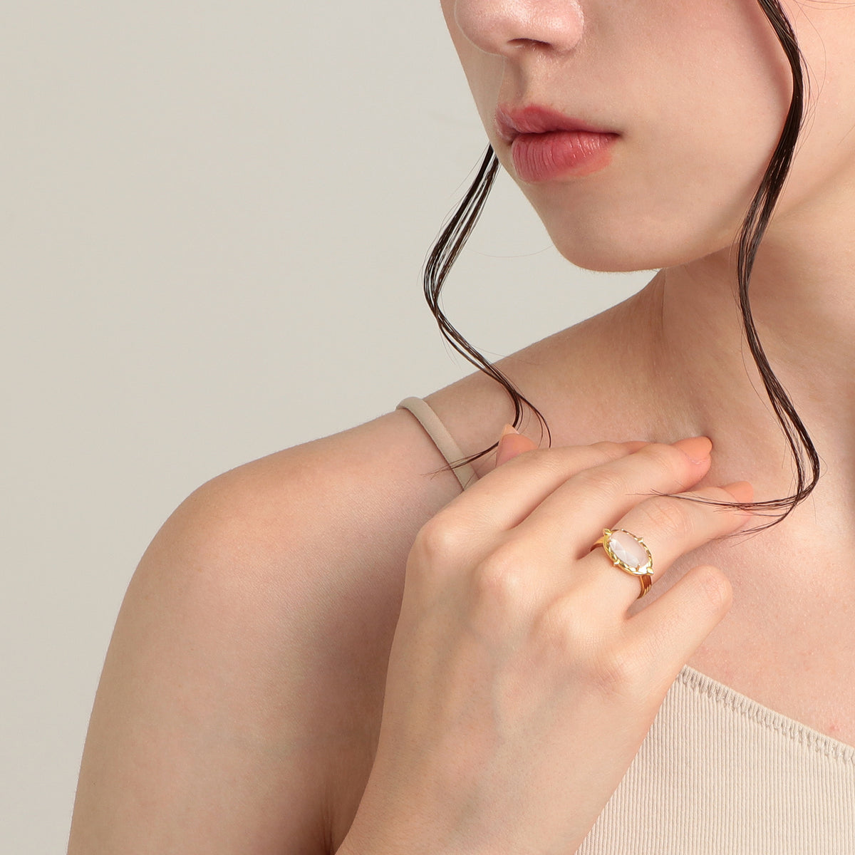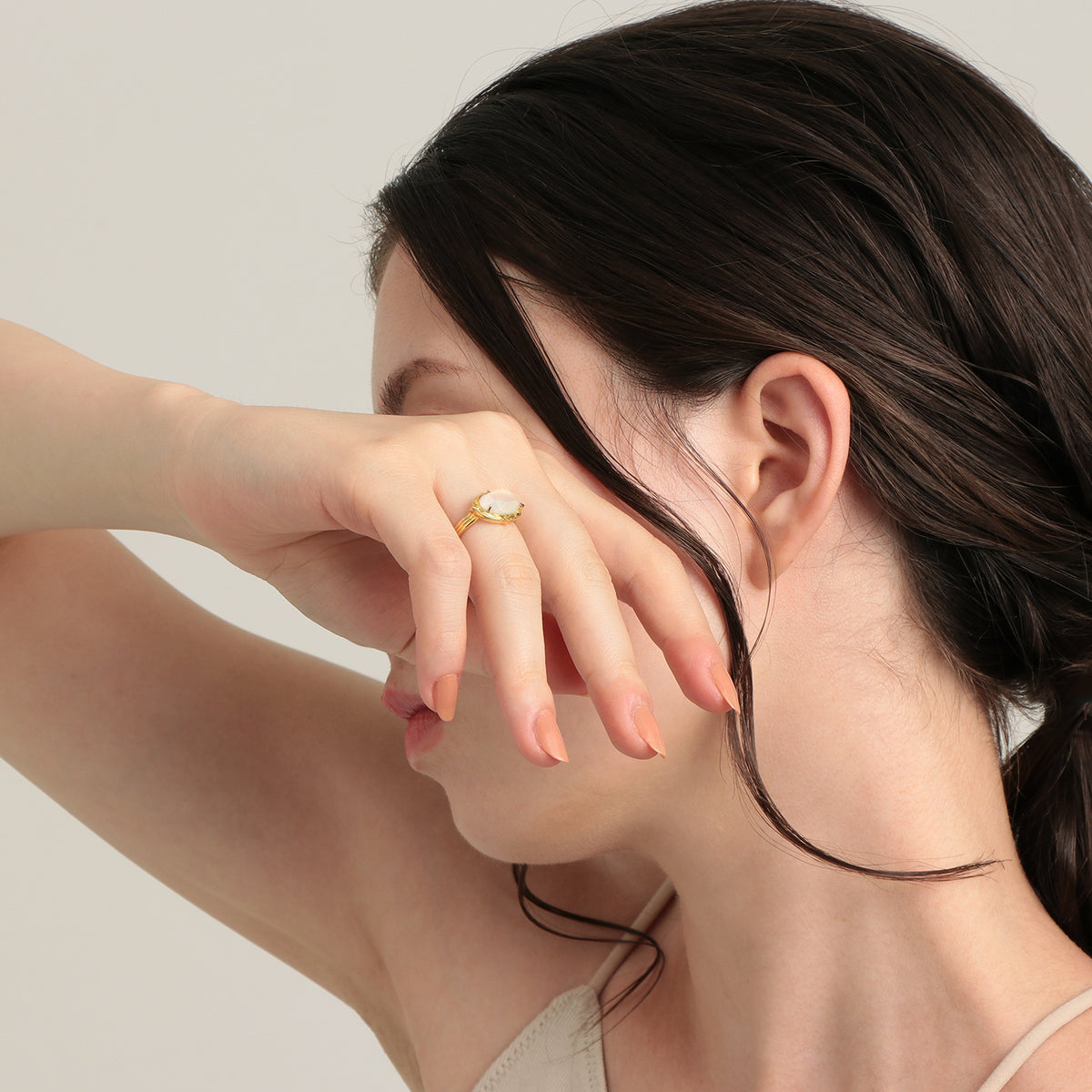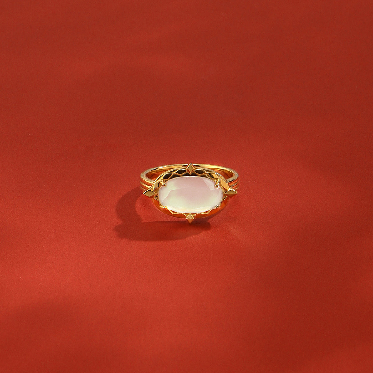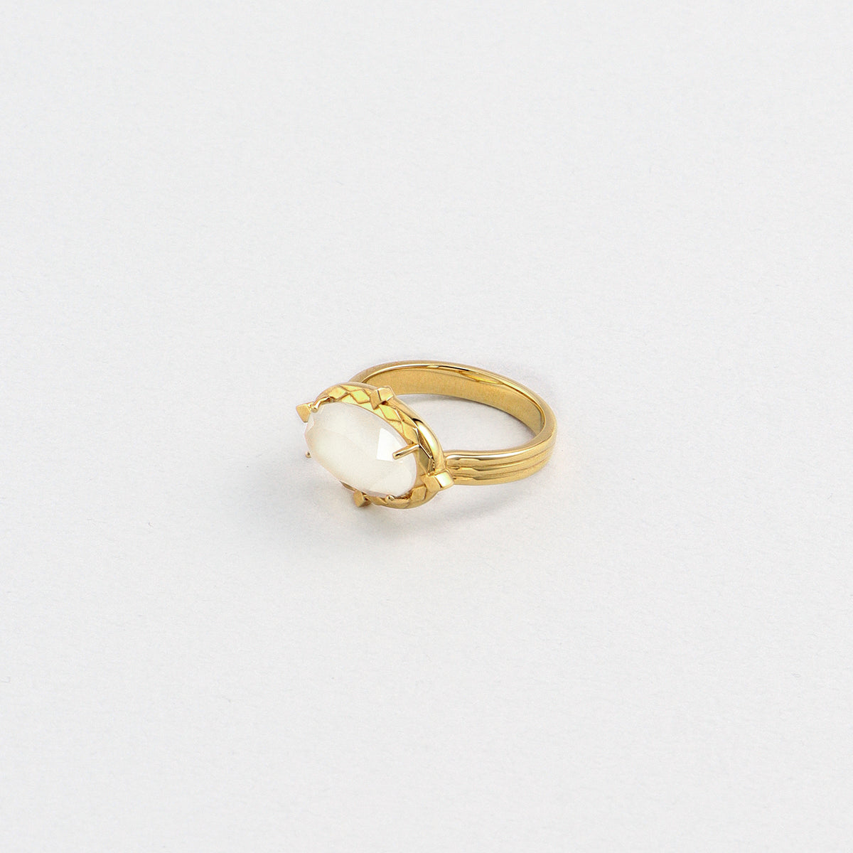 「感覚」を司る地のエレメントから着想した、大地のオーラを感じさせるストーンリング。潤んだような輝きをたたえるホワイトカルセドニーが手元に印象的な輝きをまとわせます。石座にデザインされた菱形の模様は、地中にある鉱物の結晶をイメージ。アームに施された3本の真っ直ぐなラインは地平線を表現しています。厚みのあるホワイトカルセドニーは、見る角度で白から半透明まで印象が変化し幻想的な雰囲気に。動きに合わせてきらめくファセットがお守りのように日々に寄り添います。