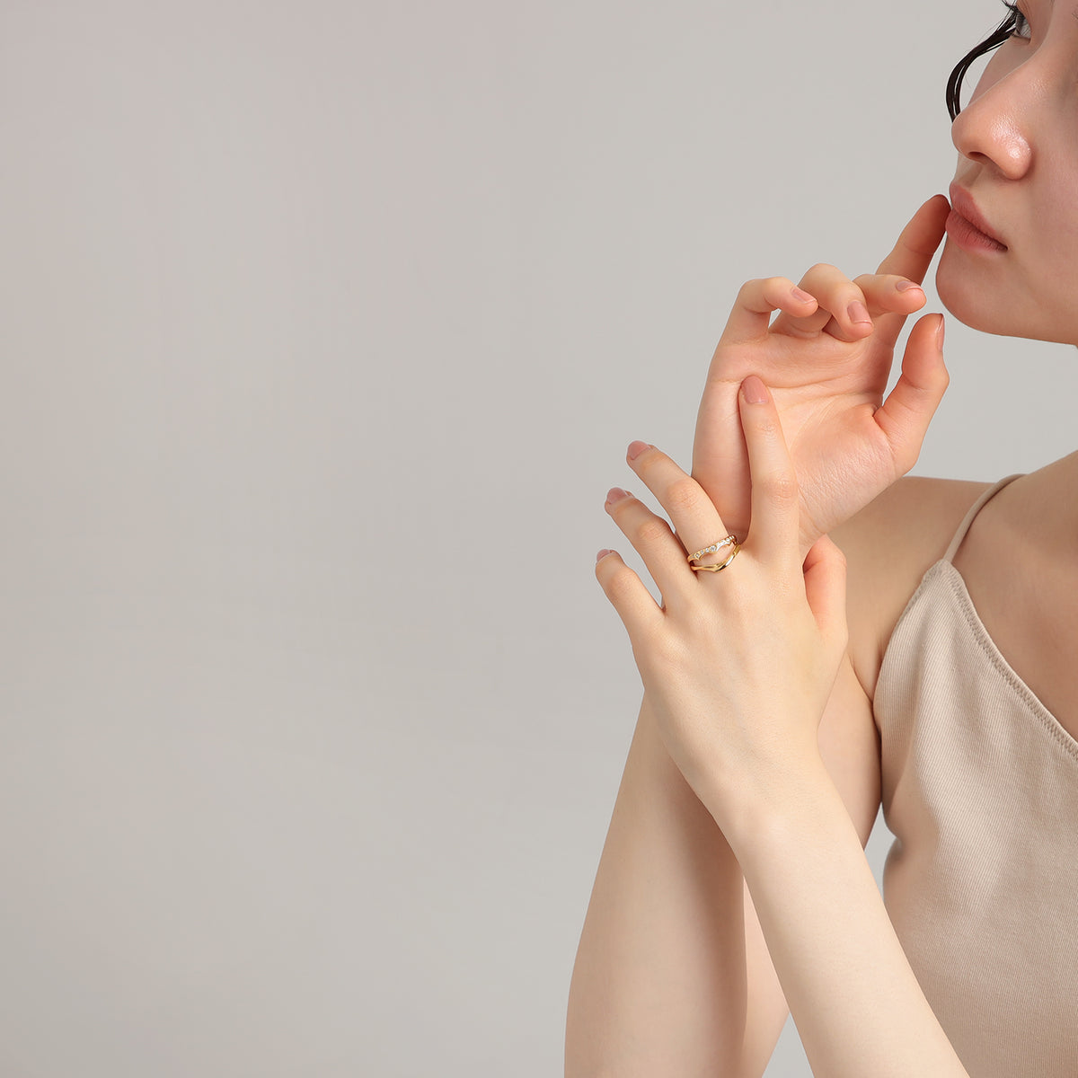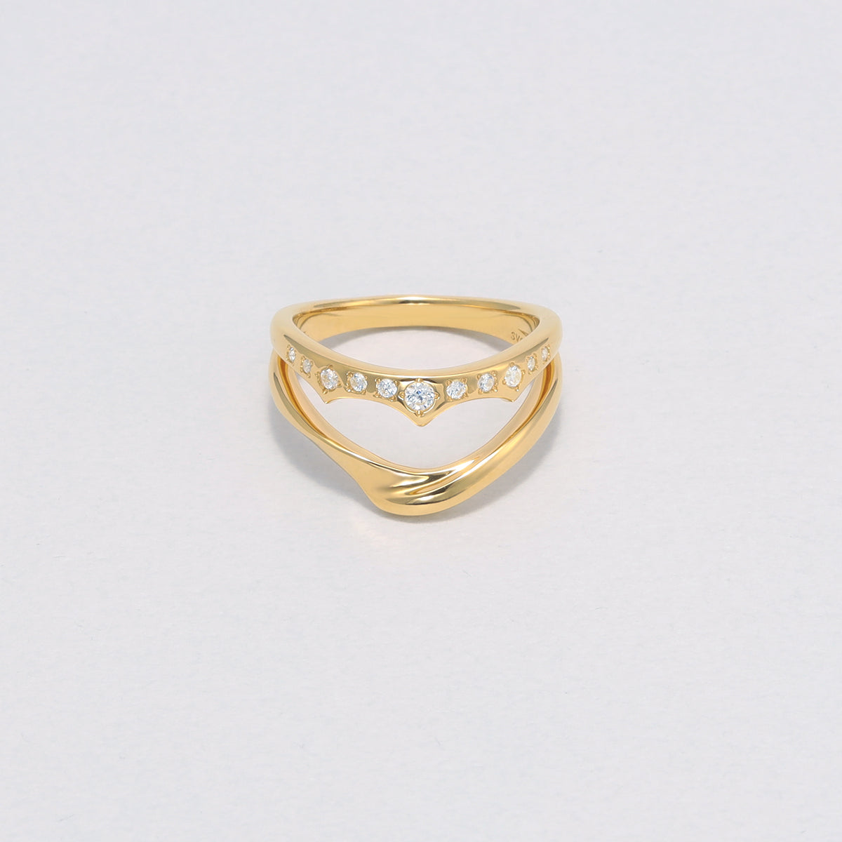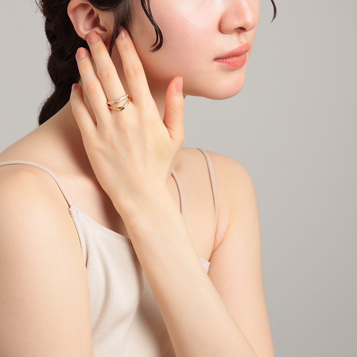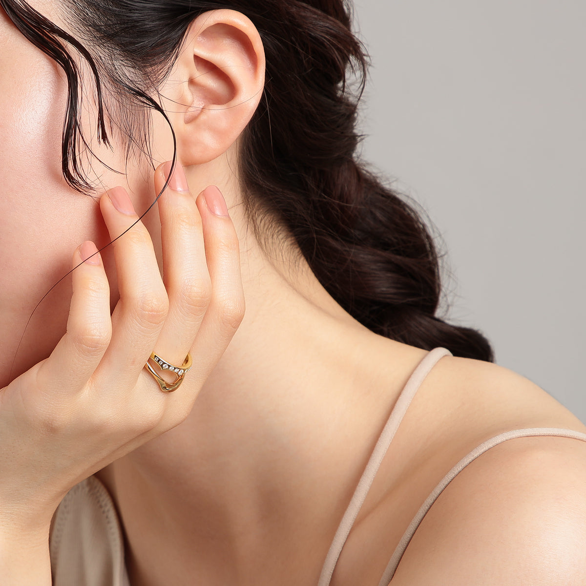 金星と繋がる、愛と美の女神・アフロディーテからインスパイアされたリング。女神がまとうローブ(衣)のようなフォルムと、ヴィーナスを象徴する薔薇の棘をイメージした相反するシルエットが、手元にエレガントな輝きをプラスします。2本のリングを重ね着けしているようなデザインは、地金の光沢とキュービックジルコニアの輝きのコントラストが印象的。美しくカーブを描くU字のフォルムが、指をいっそう長く美しく見せてくれます。上質なスタイリングを演出する、優雅で洗練されたお守りリング。