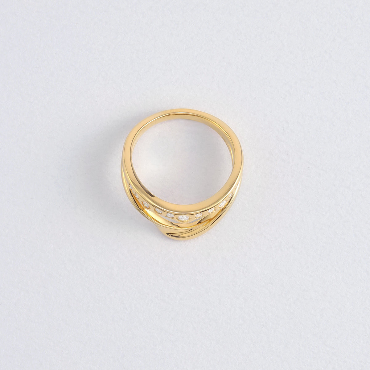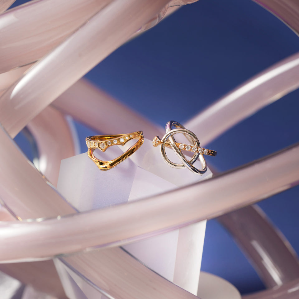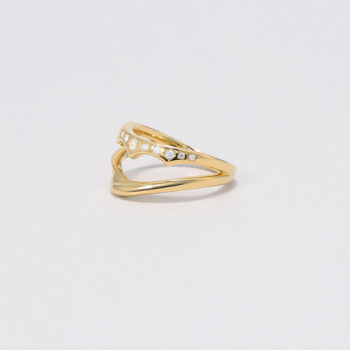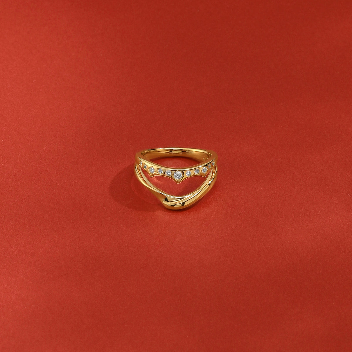 金星と繋がる、愛と美の女神・アフロディーテからインスパイアされたリング。女神がまとうローブ(衣)のようなフォルムと、ヴィーナスを象徴する薔薇の棘をイメージした相反するシルエットが、手元にエレガントな輝きをプラスします。2本のリングを重ね着けしているようなデザインは、地金の光沢とキュービックジルコニアの輝きのコントラストが印象的。美しくカーブを描くU字のフォルムが、指をいっそう長く美しく見せてくれます。上質なスタイリングを演出する、優雅で洗練されたお守りリング。