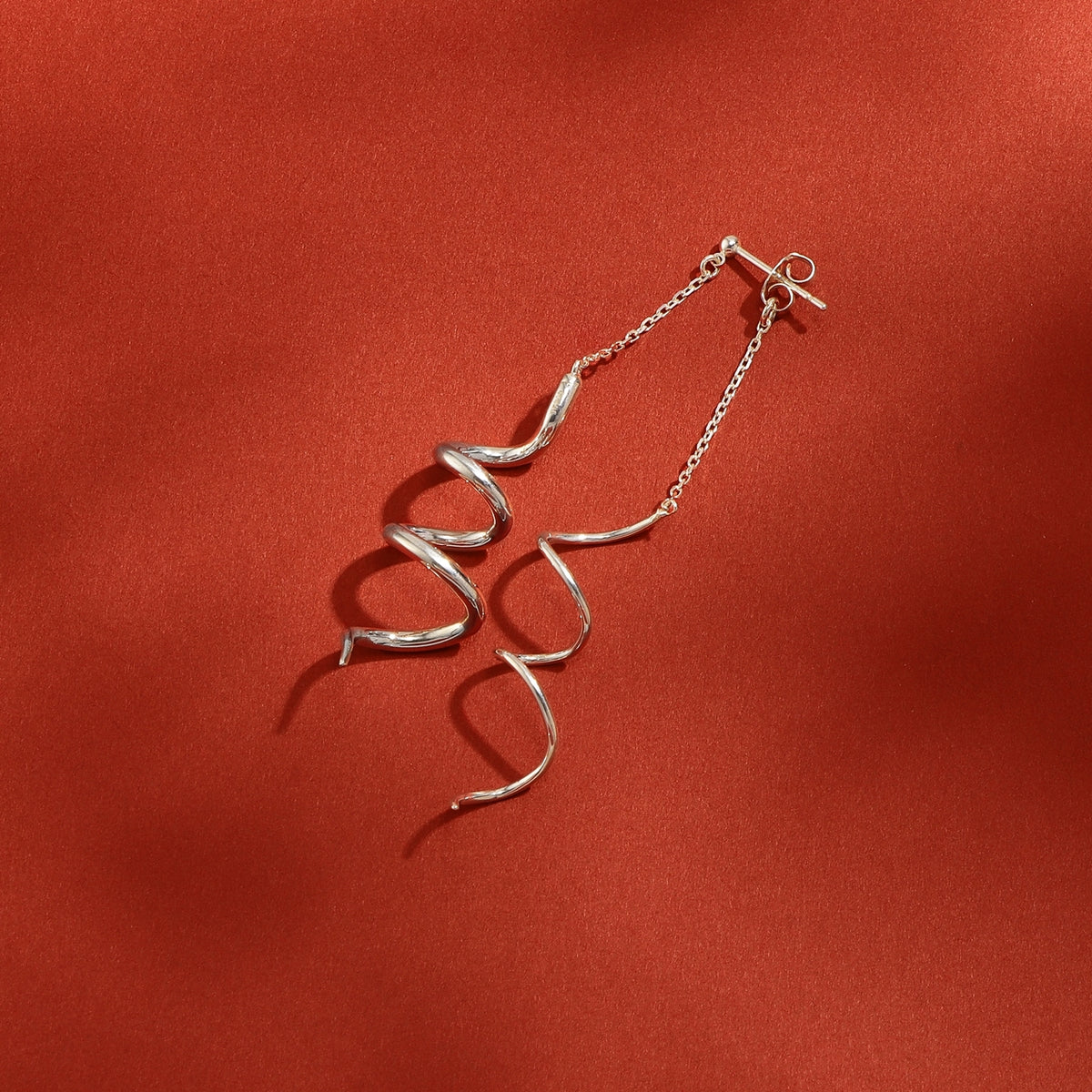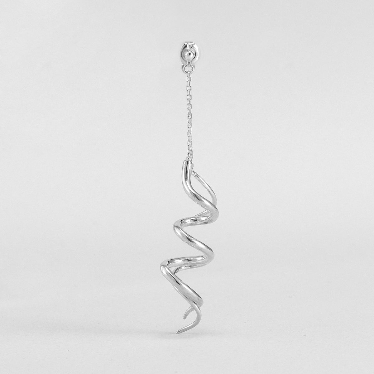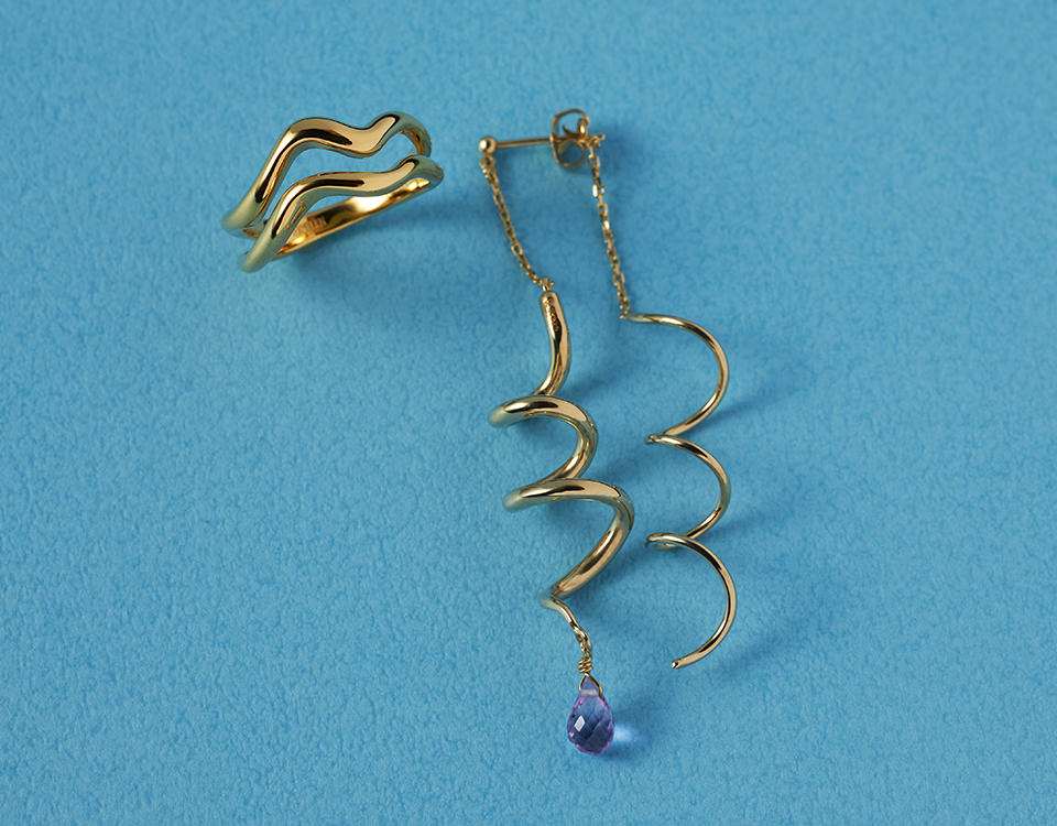 みずがめ座の星座記号を大胆にアレンジした、アートピースのようなシングルピアス。艶やかに磨き上げられた美しい地金が耳元で立体的に輝きます。アシンメトリーなコーディネートのほか、2つ合わせてペアでのスタイリングもおすすめです。