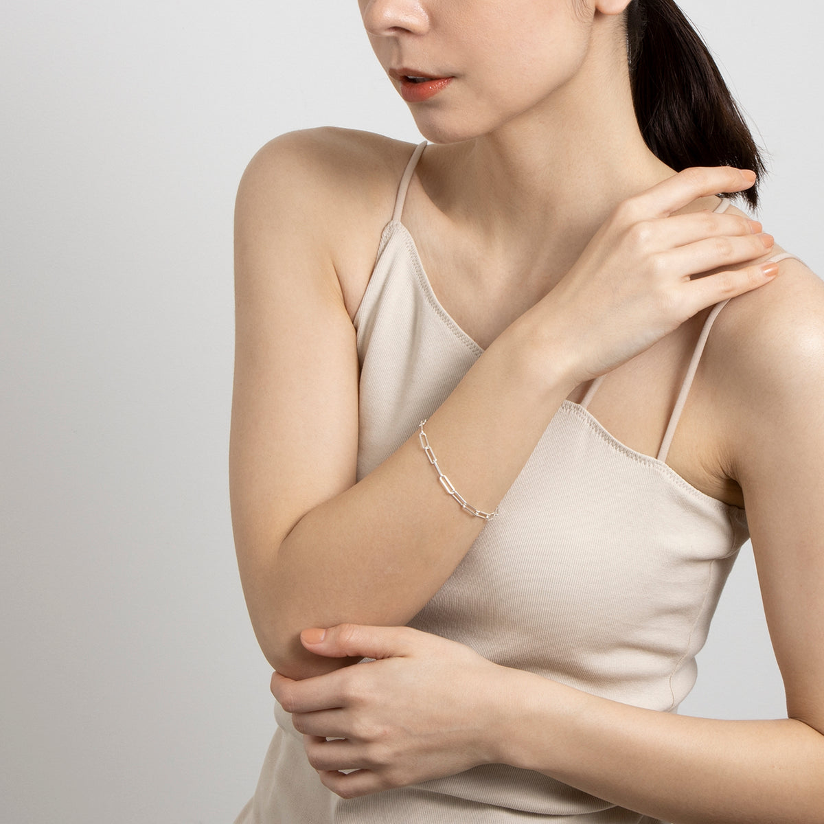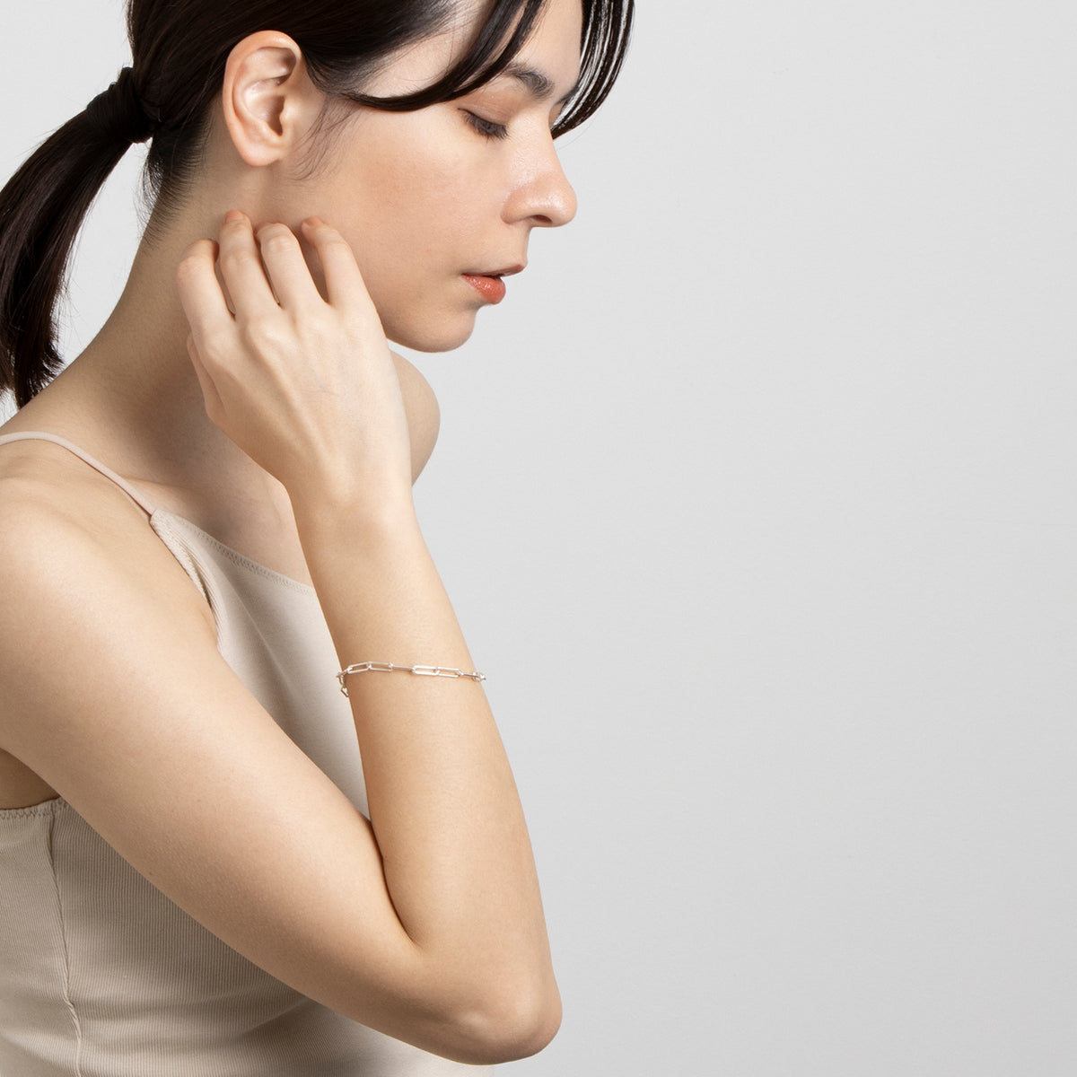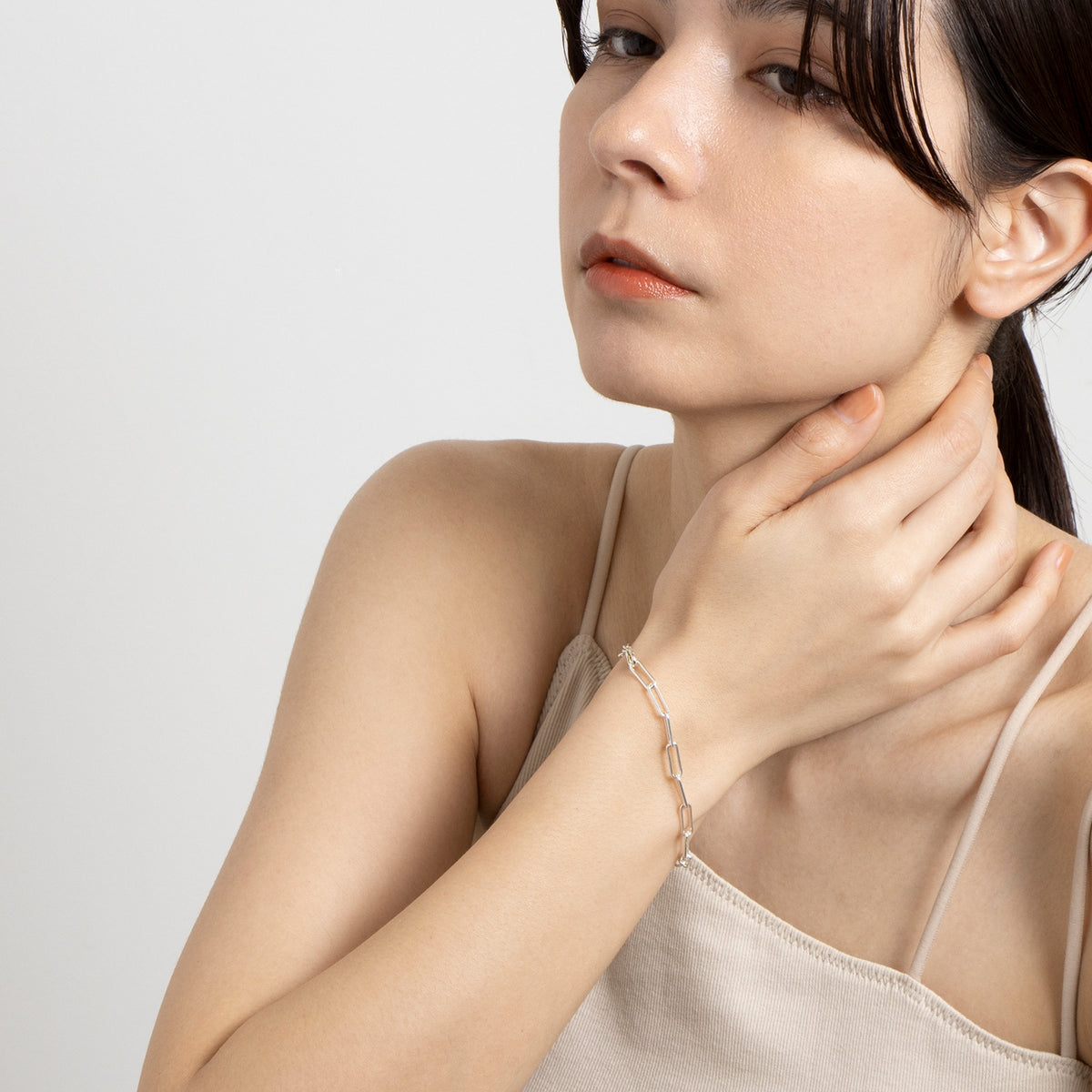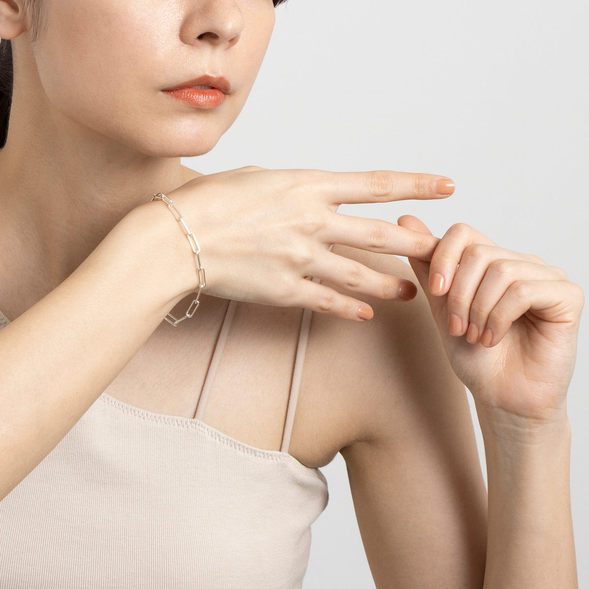 ボリューム感がありながら軽やかな柔らかさを感じさせてくれる、1本で着け映えのするチェーンブレスレット。 別売りのチャームと組み合わせて自分だけのアレンジを楽しめます。ややゆとりのある19cmに設定していますが、お好きな位置のコマで着用いただくことで長さ調整が可能です。先端のコマにチャームを下げるアレンジもおすすめ。