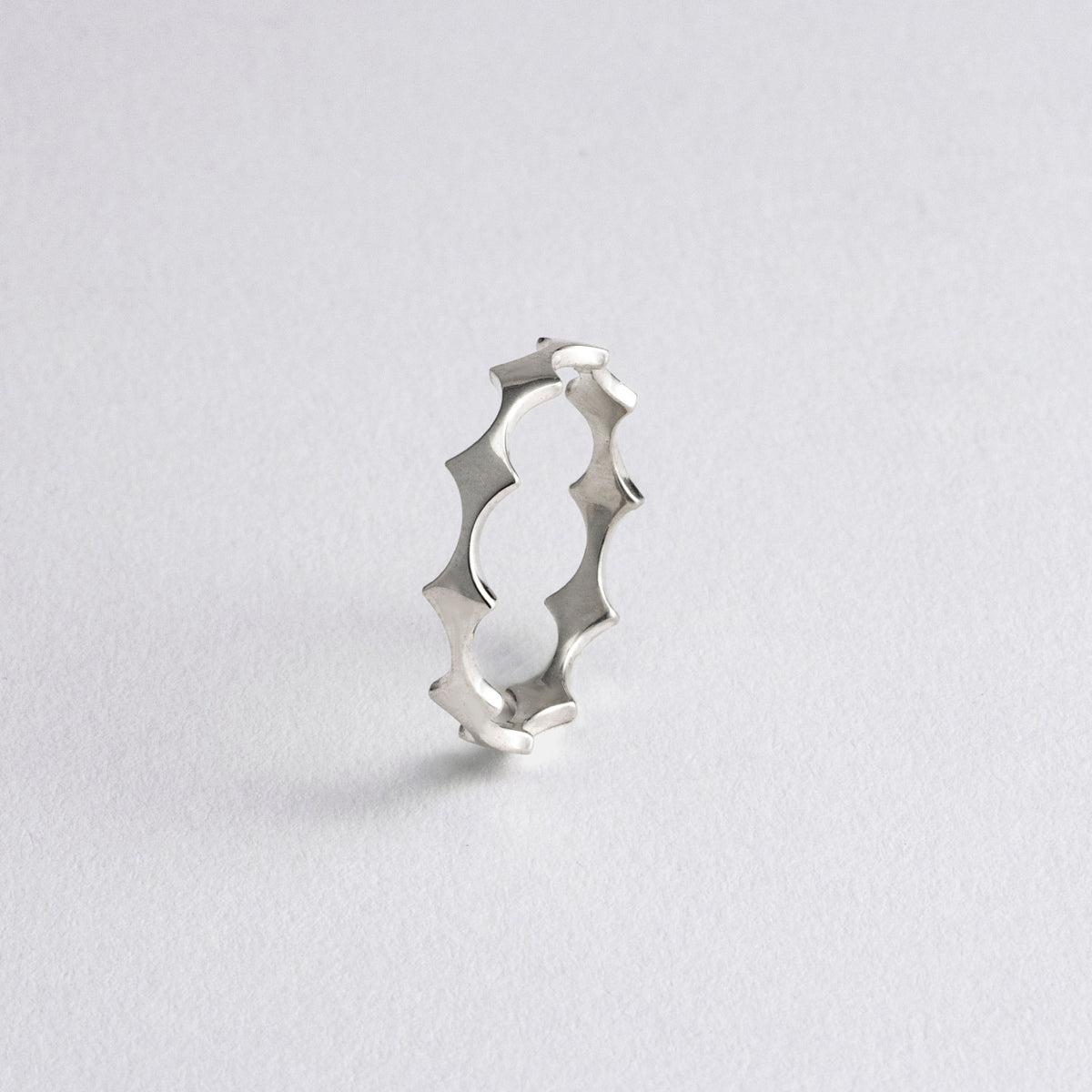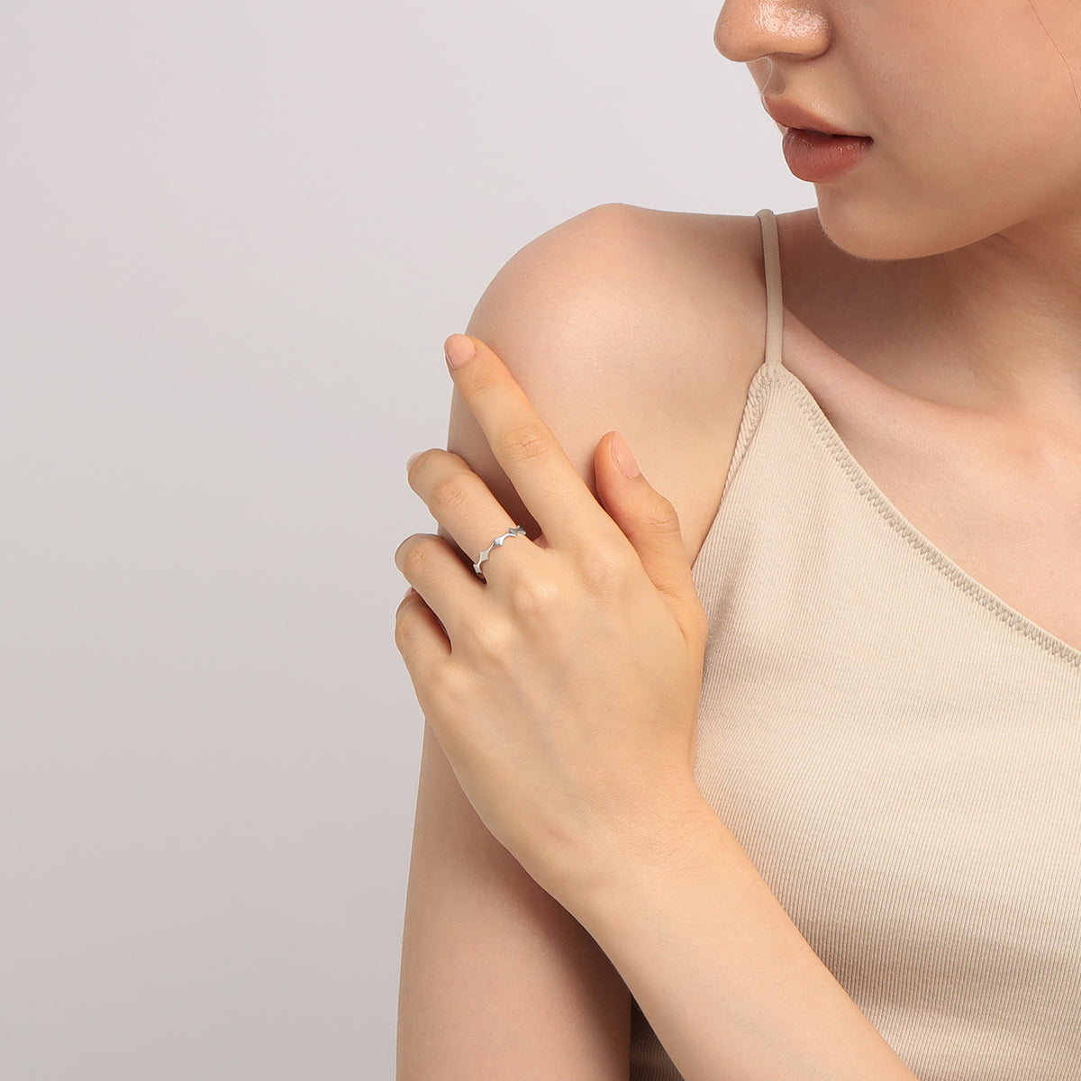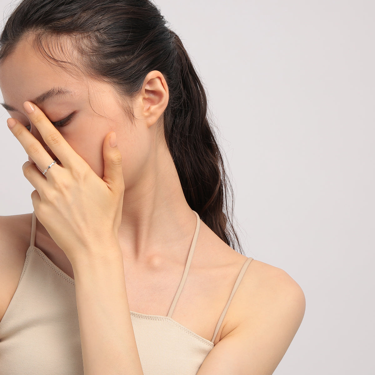 Clarus(クラルス)とは、最も明るい星を表す言葉。夜空に明るく輝く金星の光をモチーフにした煌めきが連なるデザインエタニティリングは、ふと手のひらが見えた時にも光のシルエットが美しさを感じさせてくれます。ピュアな輝きのシルバーカラーが手元をスタイリッシュに演出します。Orbeリングとのスタッキングコーディネートもおすすめです。