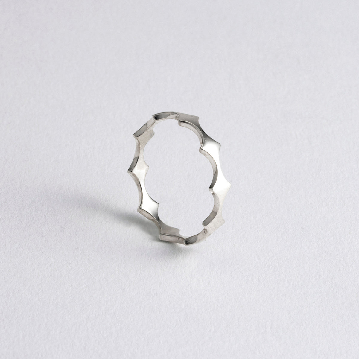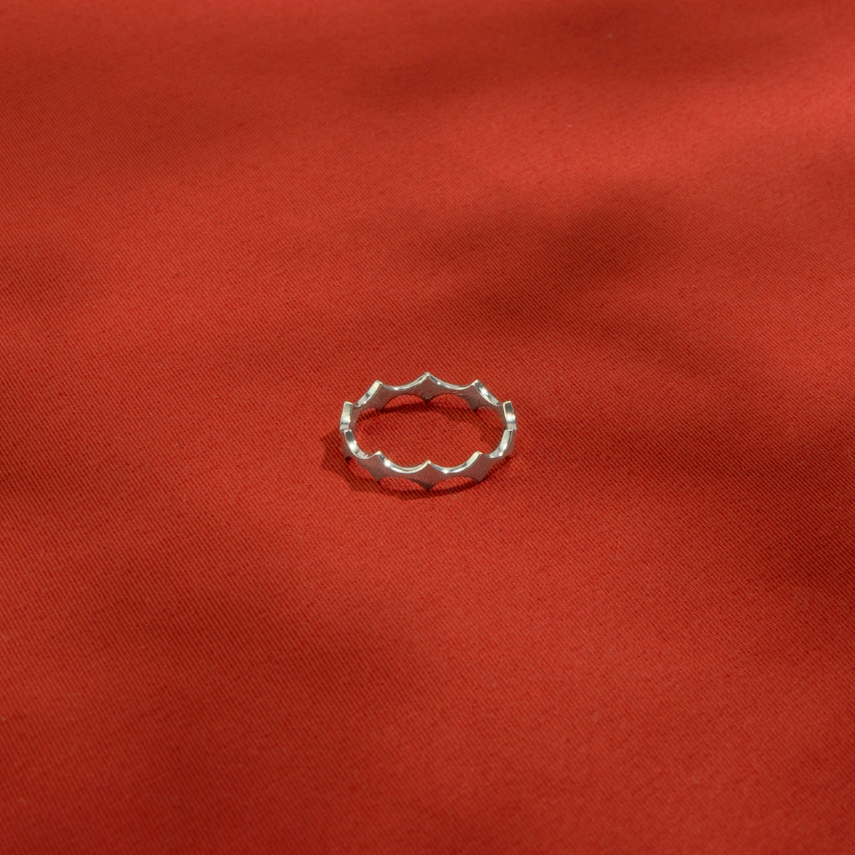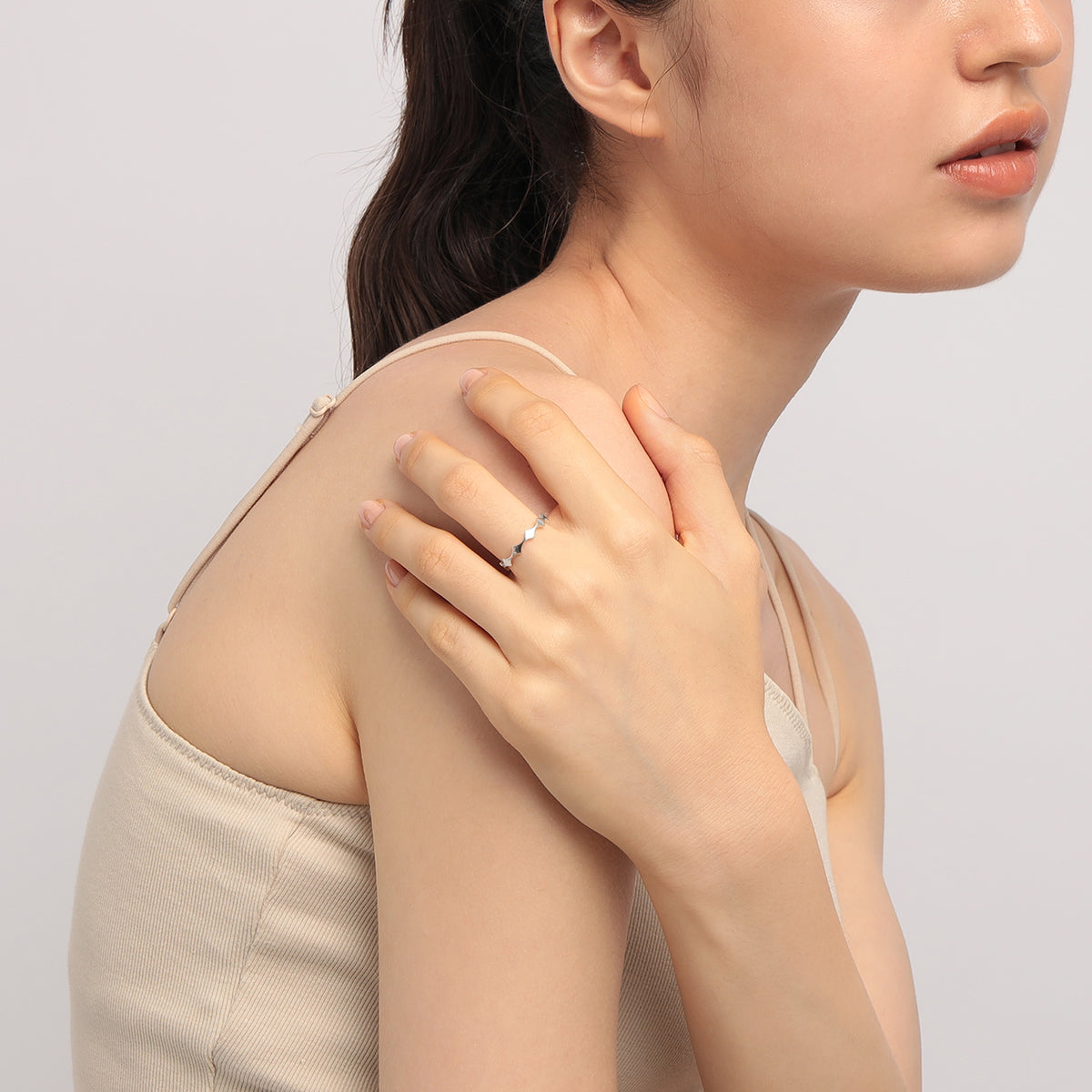 Clarus(クラルス)とは、最も明るい星を表す言葉。夜空に明るく輝く金星の光をモチーフにした煌めきが連なるデザインエタニティリングは、ふと手のひらが見えた時にも光のシルエットが美しさを感じさせてくれます。ピュアな輝きのシルバーカラーが手元をスタイリッシュに演出します。Orbeリングとのスタッキングコーディネートもおすすめです。
