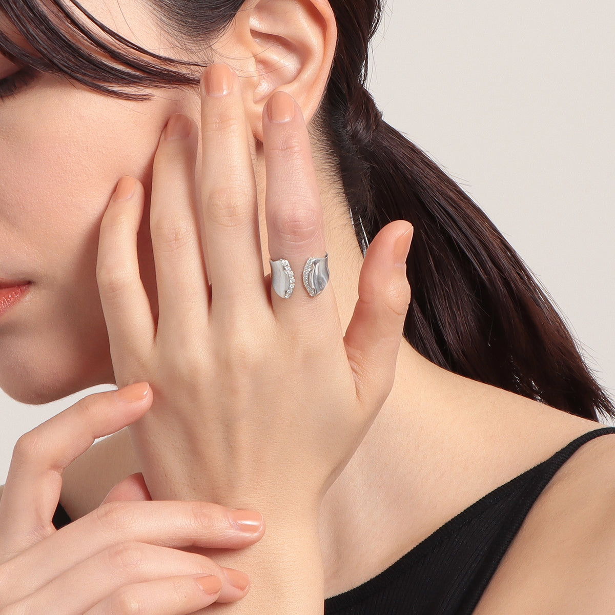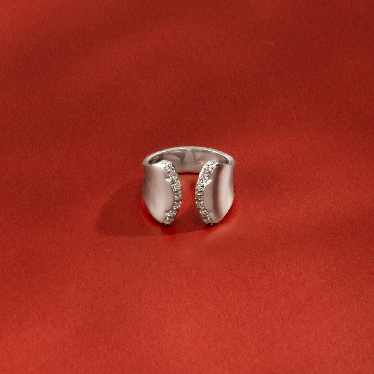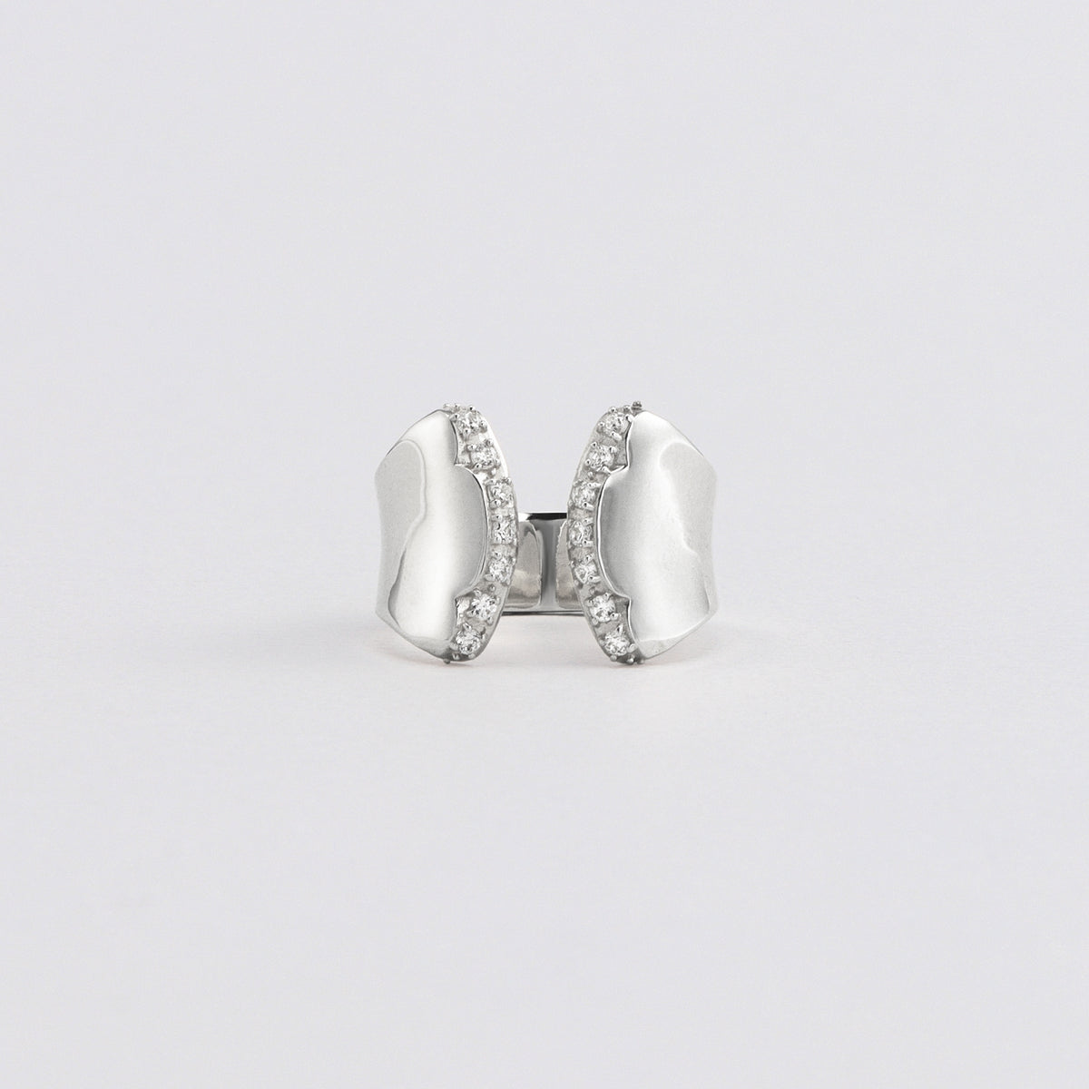 金星の軌道から生まれる美しい薔薇のシルエットからインスパイアされたリング。艶やかに磨かれた地金の表面は、反るようにカーブをつけることでボリュームがありながらもすっきりとした着け心地。少しエッジの効いたフォルムが印象的な手元を演出します。内側に向けて斜めに留めたストーンの煌めきが互いに響き合い、どの角度から見ても輝きを感じる仕立てに。厚みを抑えた作りの中にも立体感を感じるオブジェのようなリングが、存在感を放ちながら所作を美しく見せてくれます。