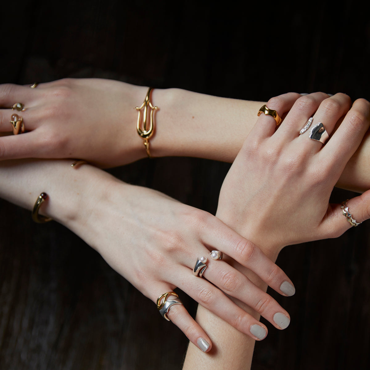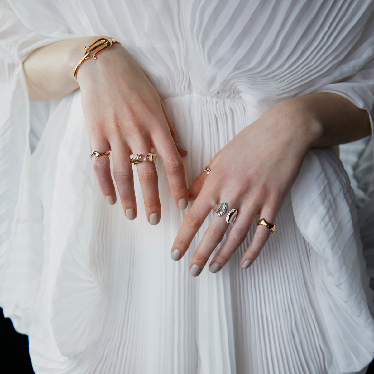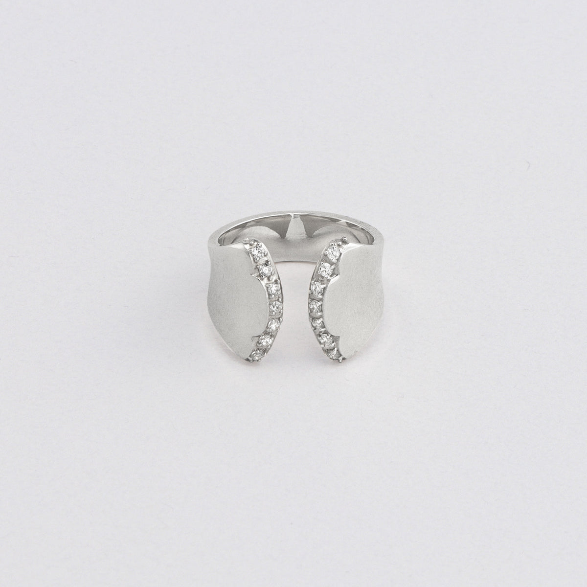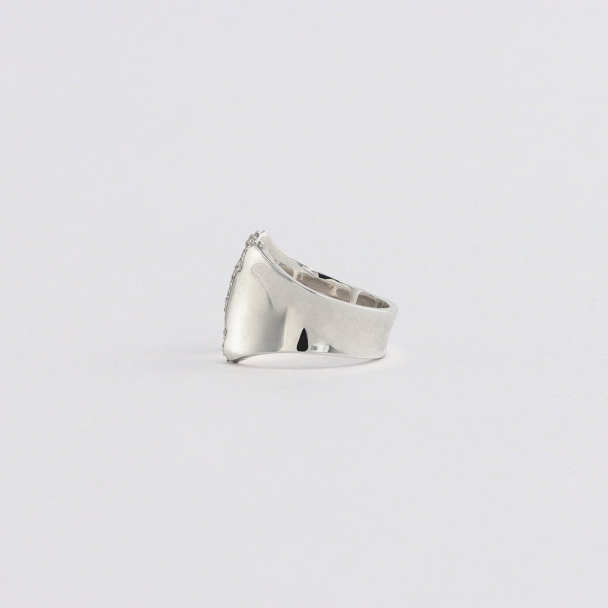 金星の軌道から生まれる美しい薔薇のシルエットからインスパイアされたリング。艶やかに磨かれた地金の表面は、反るようにカーブをつけることでボリュームがありながらもすっきりとした着け心地。少しエッジの効いたフォルムが印象的な手元を演出します。内側に向けて斜めに留めたストーンの煌めきが互いに響き合い、どの角度から見ても輝きを感じる仕立てに。厚みを抑えた作りの中にも立体感を感じるオブジェのようなリングが、存在感を放ちながら所作を美しく見せてくれます。