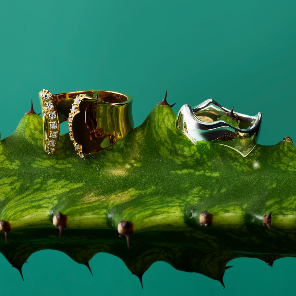 愛と美の象徴である薔薇。その薔薇の棘からインスパイアされた、少しエッジの効いた輝きが印象的な手元を演出するピンキーリング。艶やかに磨かれた地金の光沢、ふっくらとした丸みのあるフォルム、ぐるりと1周させた棘のデザインがどの角度から見ても美しさを感じる仕立てに。オブジェのような存在感を放ちながらも全ての角を丸く仕上げ、優しい着け心地で日々に寄り添うお守りリングです。