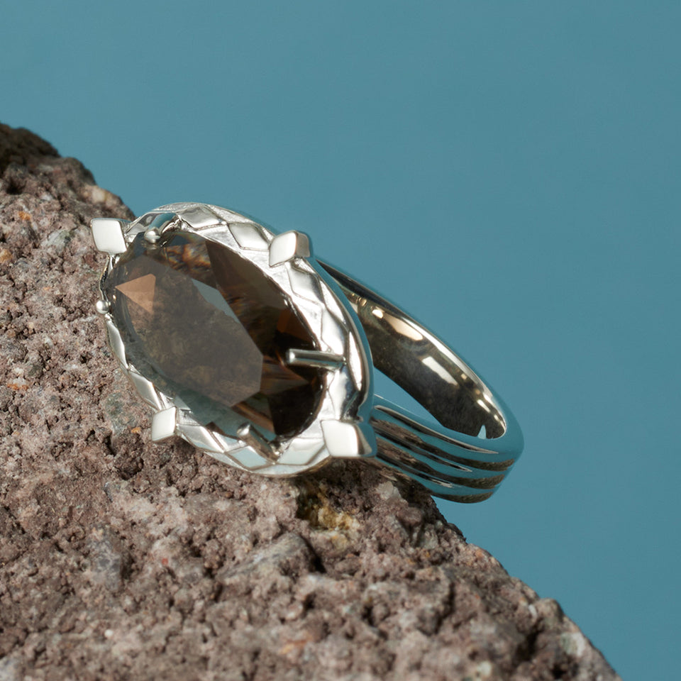 「感覚」を司る地のエレメントから着想した、大地のオーラを感じさせるストーンリング。こっくりとした深みのあるスモーキークォーツが印象的な手元を演出します。石座にデザインされた菱形の模様は、地中にある鉱物の結晶をイメージ。アームに施された3本の真っ直ぐなラインは地平線を表現しています。厚みのあるスモーキークォーツは、見る角度で淡いブラウンから濃いブラウンまで印象が変化し幻想的な雰囲気に。動きに合わせてきらめくファセットがお守りのように日々に寄り添います。