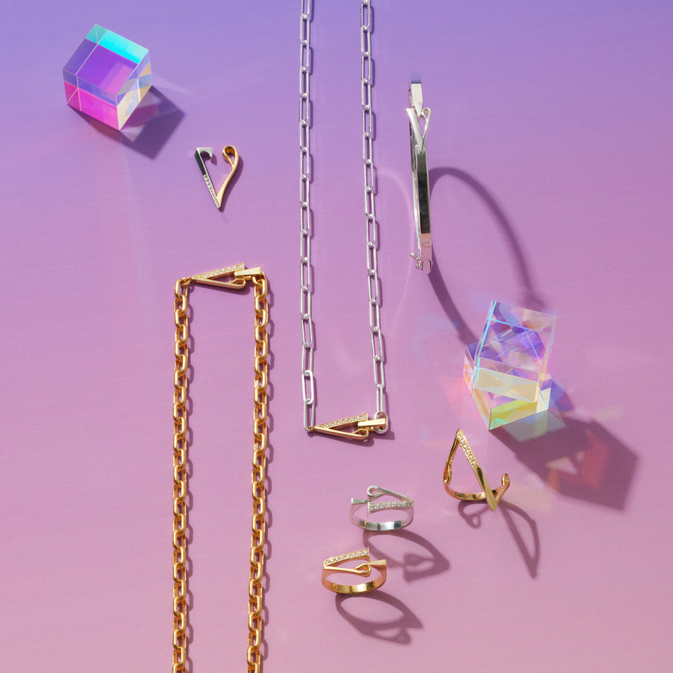 2024SSシーズンテーマ<PRISM>の世界観を体現したシンボリックなコレクション。古くより神秘的な形として存在してきた三角形のフォルムをブランドロゴであるVで表現。アシンメトリーにセッティングされたキュービックジルコニアの輝きとシャープなフォルムのコントラストが洗練されたムードを演出します。モダンで構築的なデザインのロゴリングは、コンビカラーでのレイヤードもおすすめ。一つの光が屈折し響き合うプリズムのように、プレイフルなスタイリングを楽しんで。